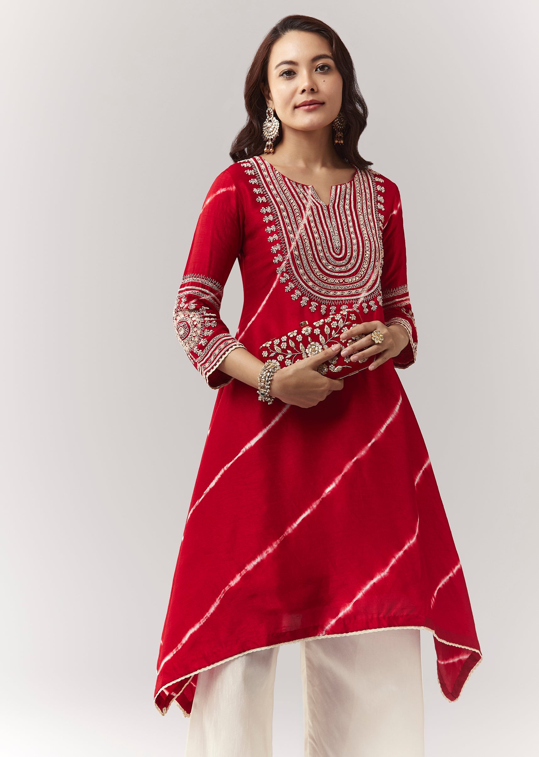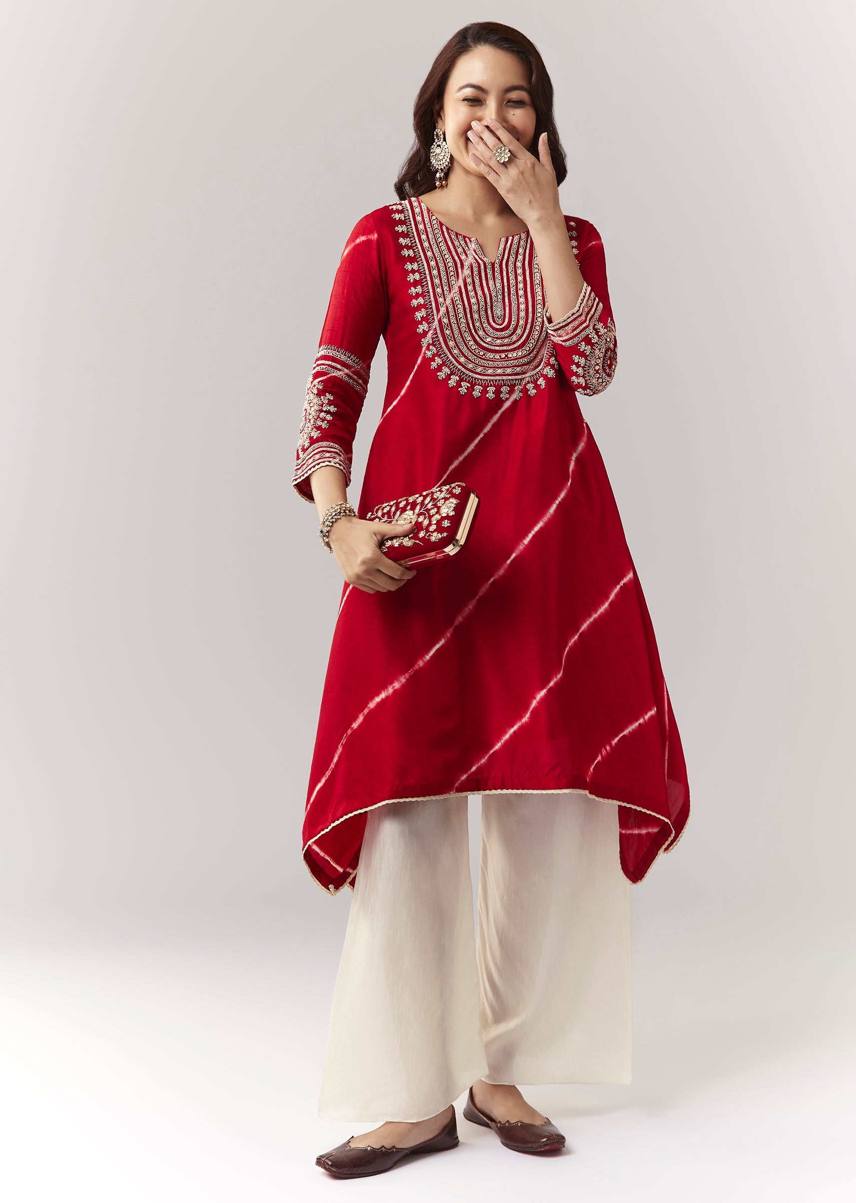 Red Leheriya A Line Kurta Palazzo Set With Zardosi And Moti Work