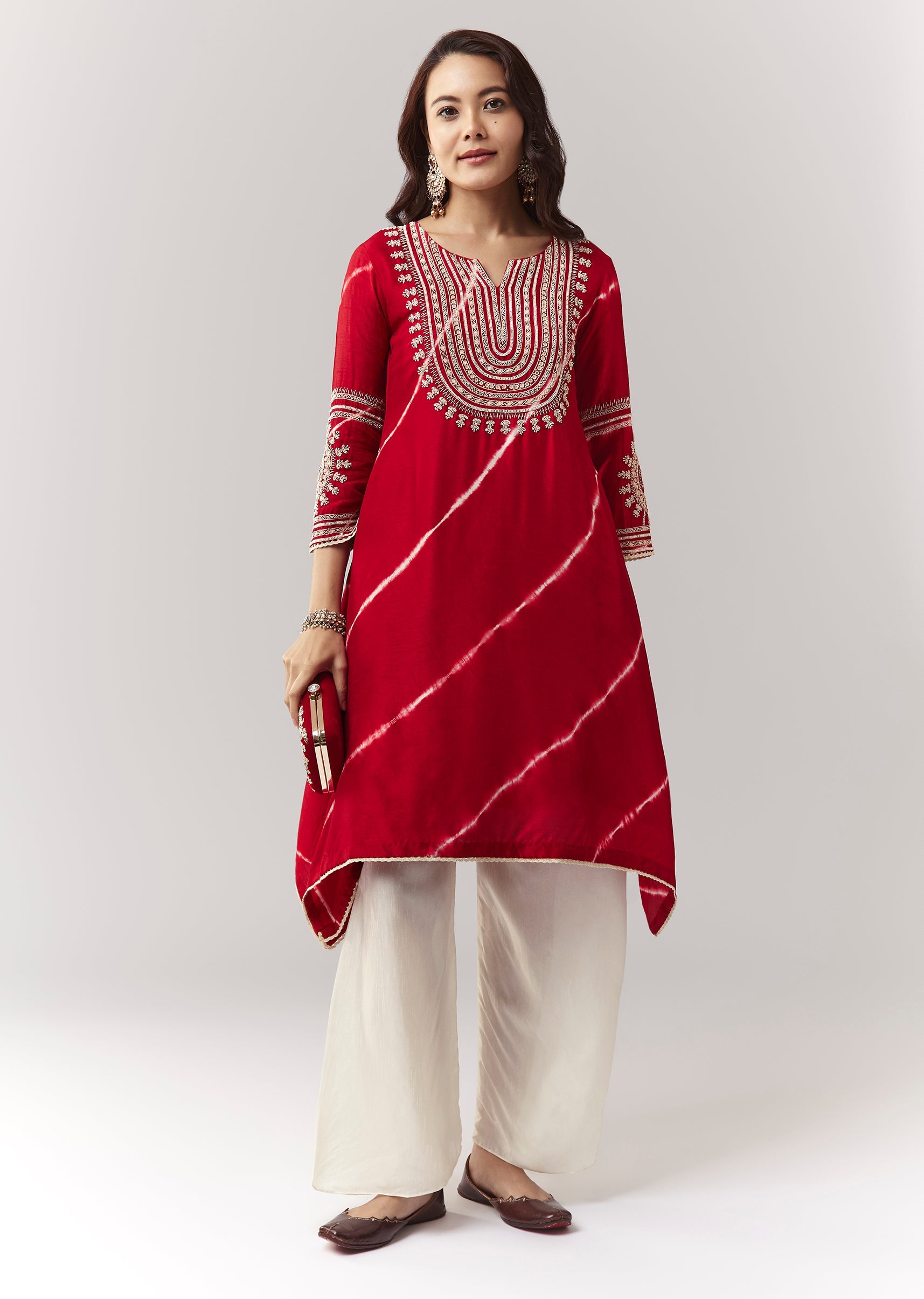 More Product DetailsA statement red leheriya A-line kurta with zardosi/moti highlights, paired with palazzosgreat festive pick. Awarded as the Most Trusted Brand, we're delivering styles you love, just as promised.