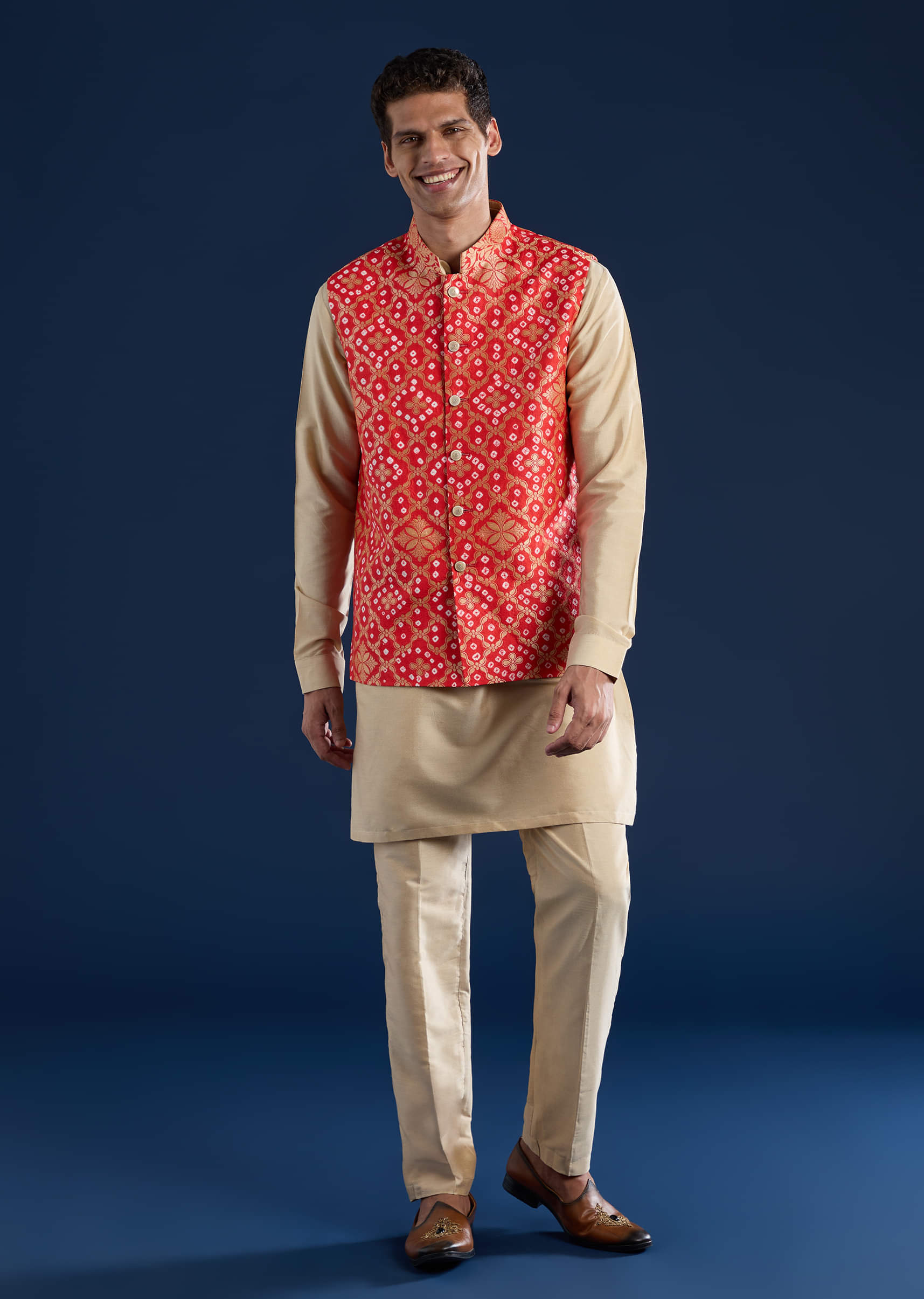 Brimming with festive allure, this red bandhani silk jacket and kurta set reimagines traditional design with contemporary sophistication. The rich silk fabric highlights the intricate bandhani motifs, while subtle embellishments... More Product Details