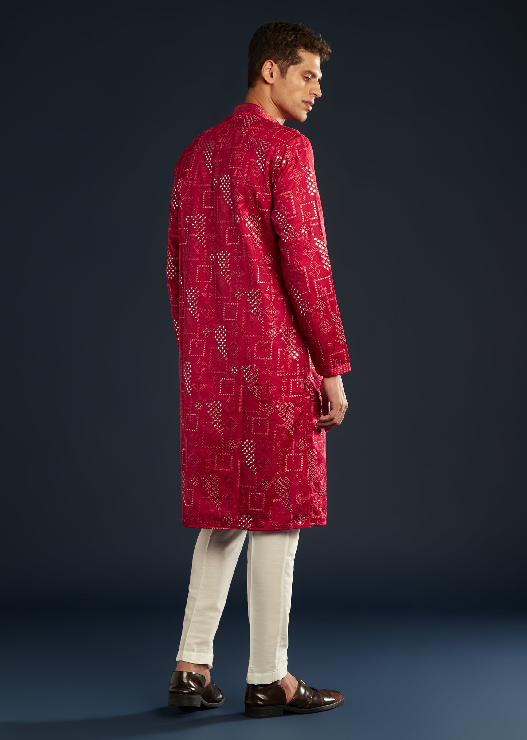 For a refined take on festive dressing, this vivid red silk kurta set features illuminating abla work and printed texture that looks impeccable in photos. Radiating celebratory energy, the ensemble combines sleek tailoring and a comfortable fit making a stand-out outfit. Comes together with classic pants to create a look that feels luxurious and effortless. Awarded as the Most Trusted Brand, we're delivering styles you love, just as promised.
