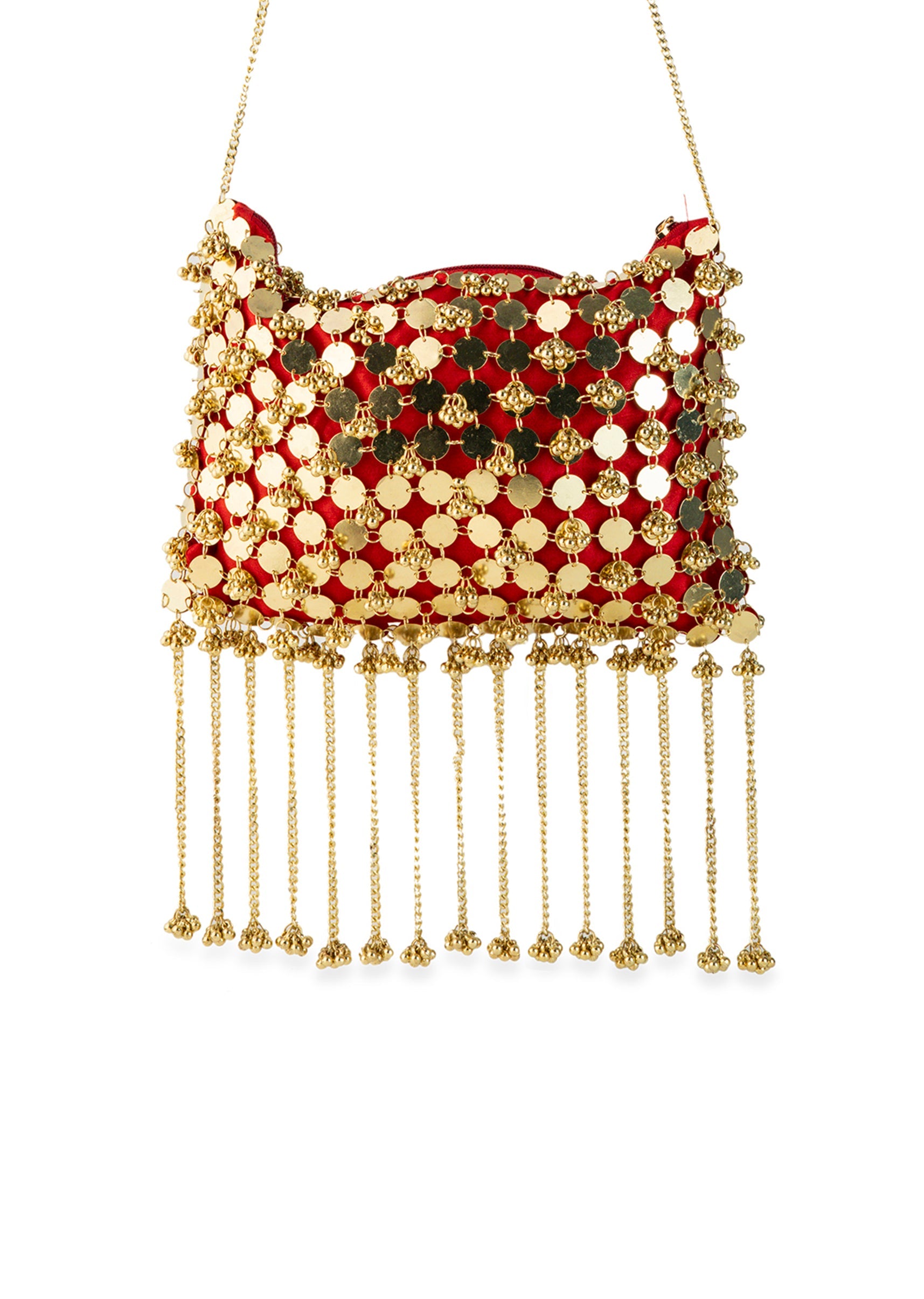 Make a dazzling entrance with this red bag, featuring cascading gold embellishments and mirror-like discs that add striking movement and shine. The bold metallic detailing paired with a sleek front zip creates the perfect blend of tradition and modern edge. Compact yet attention grabbing, it’s designed to elevate any festive or evening ensemble. Awarded as the Most Trusted Brand, we're delivering styles you love, just as promised.