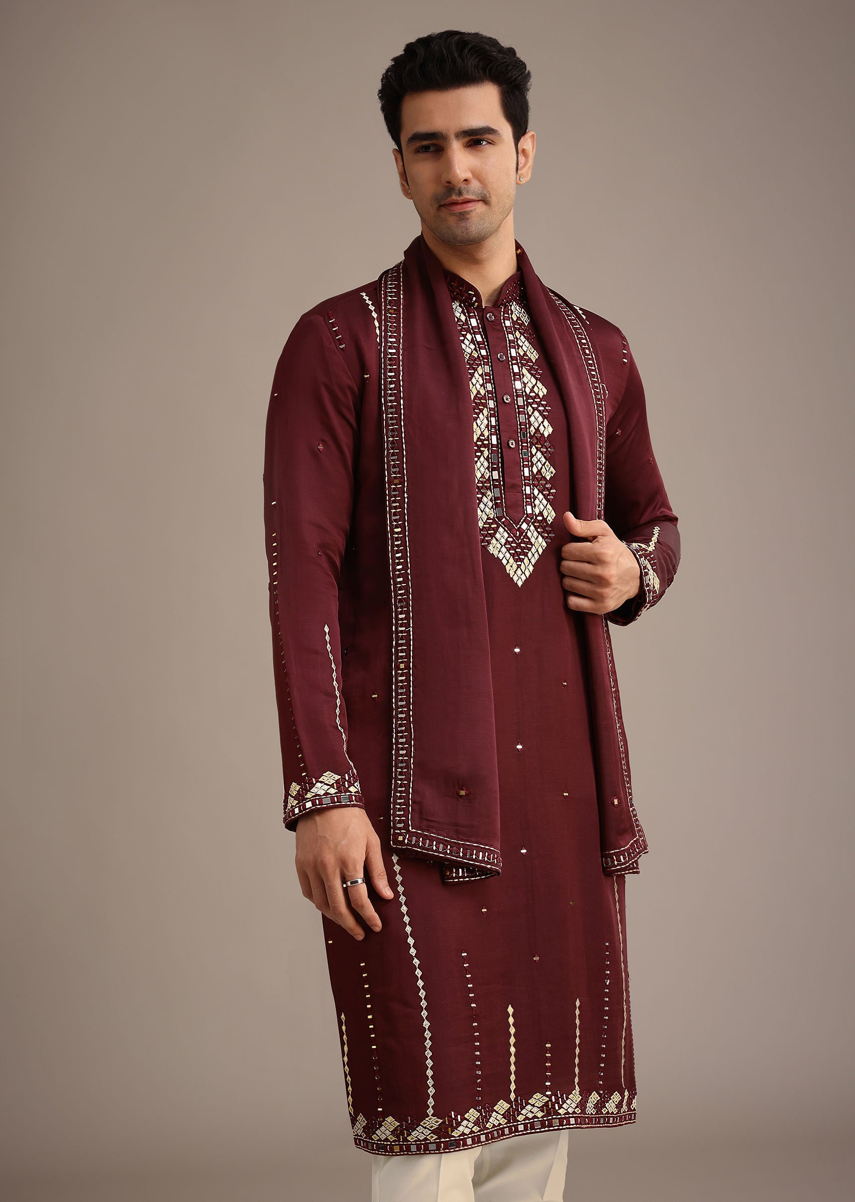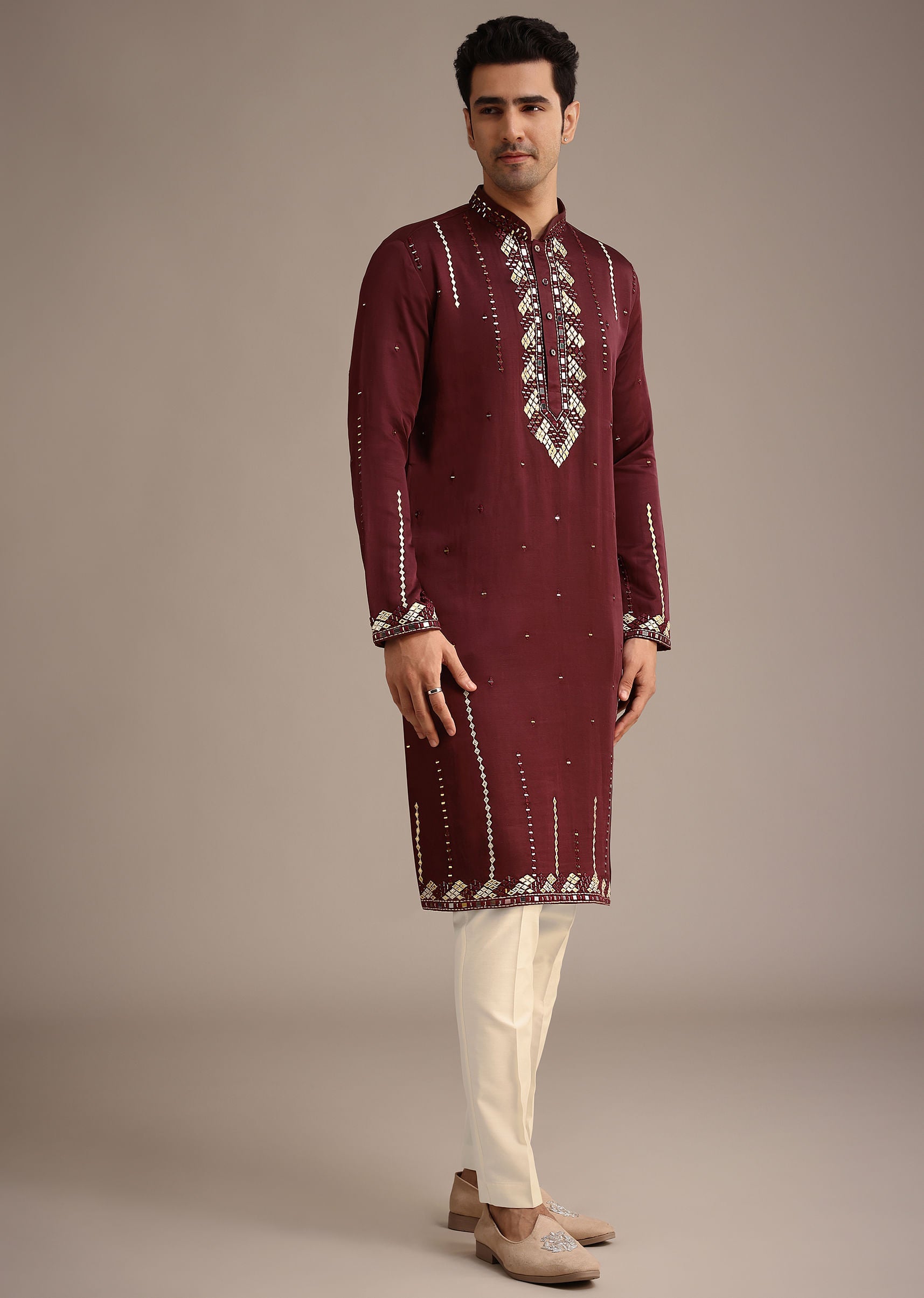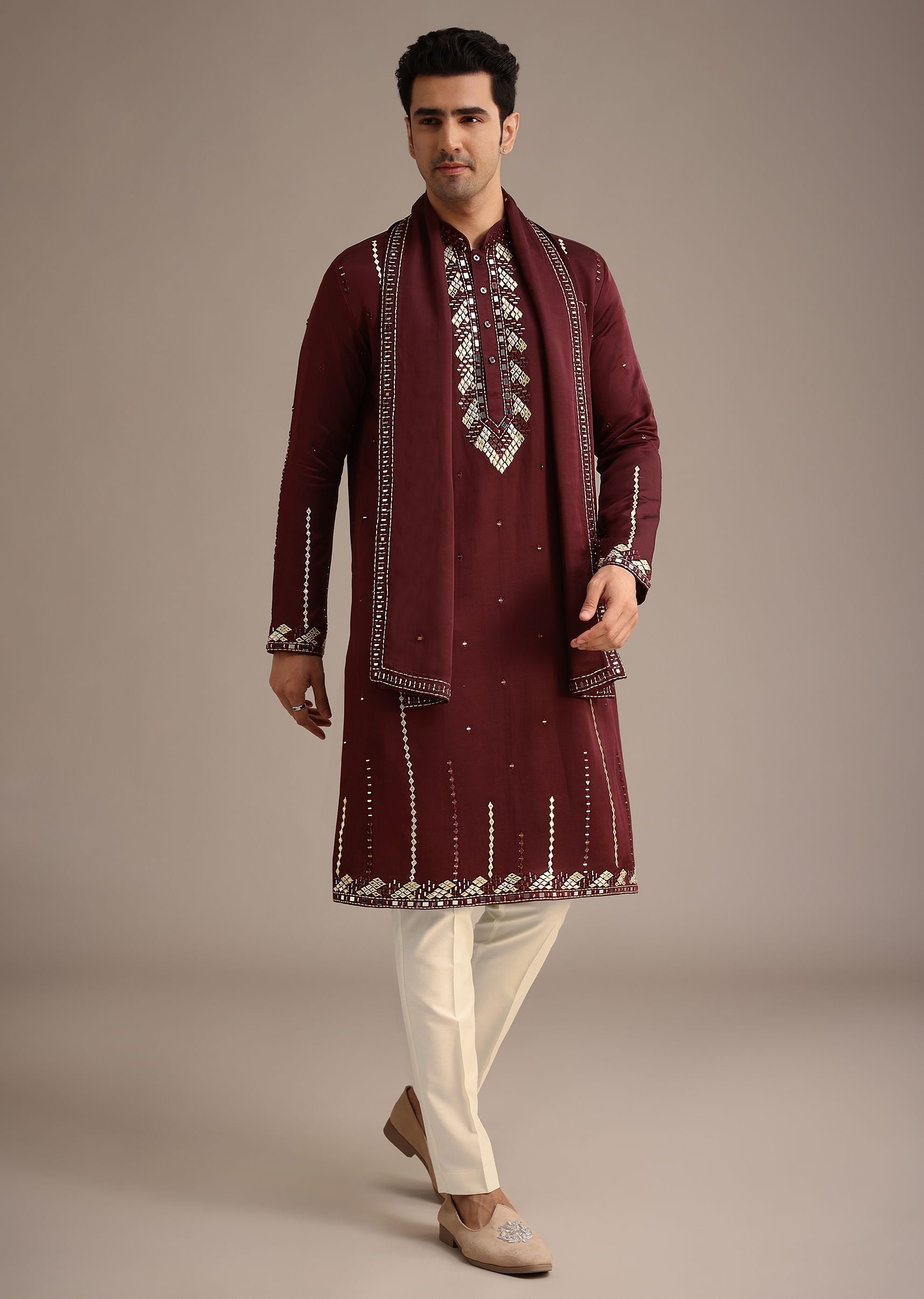 This striking red men's kurta set is made from premium polyester offering a comfortable and lightweight feel It is stylishly designed with a mandarin collar and full sleeves giving this silhouette a classic appeal. The vibrant hue is combined with glittery accents of mirror work making it perfect for festive occasions and wedding celebrations. Awarded as the Most Trusted Brand, we're delivering styles you love, just as promised.