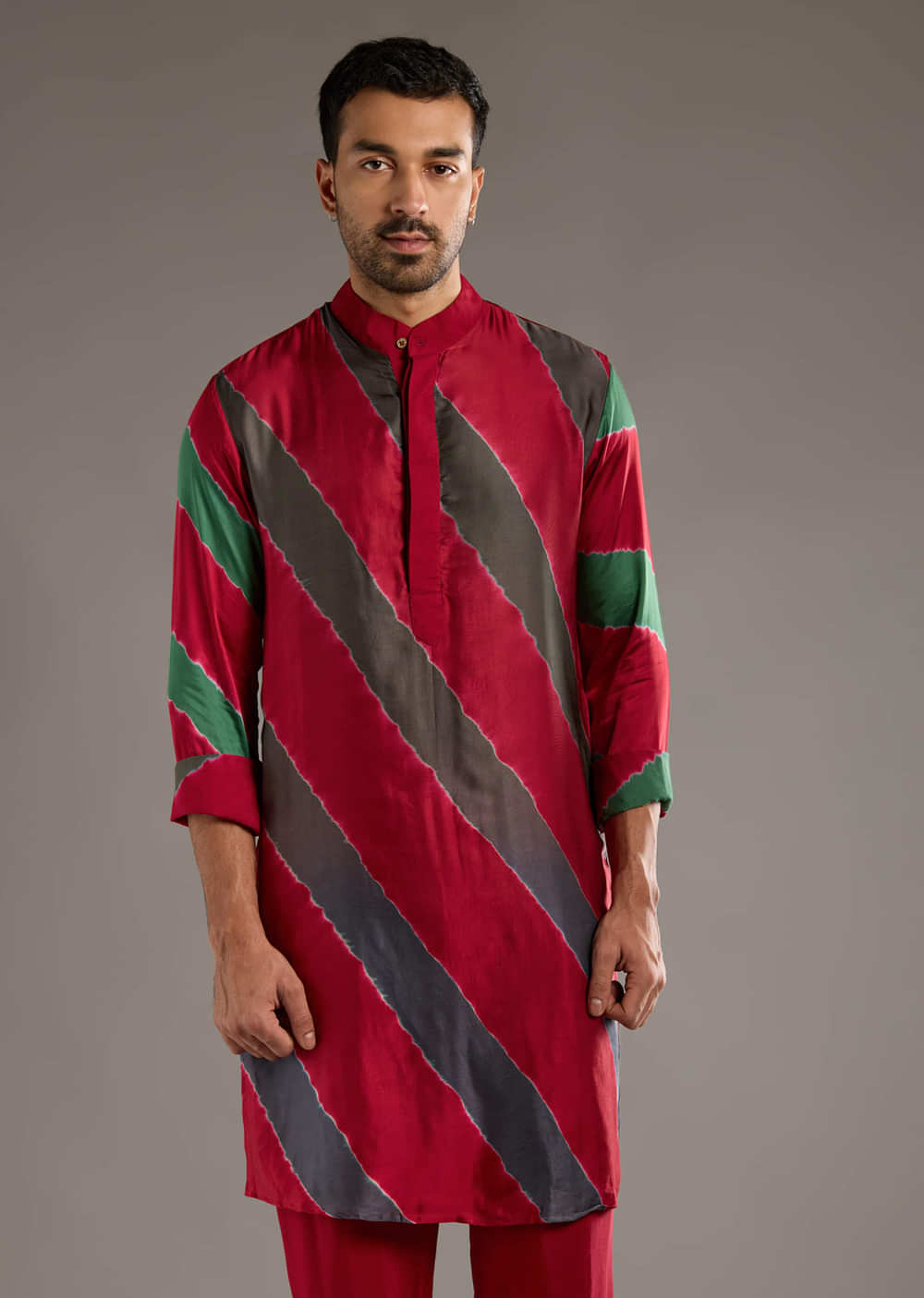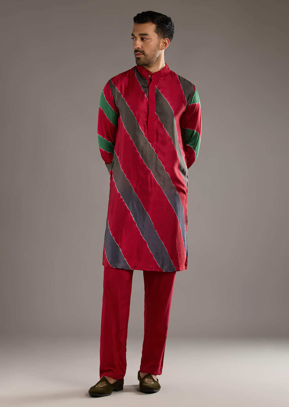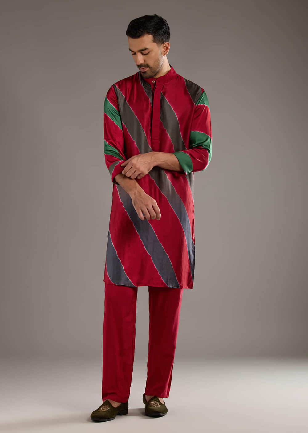 Red Modal Kurta Set For Men With Hand Dyed Leheriya Print