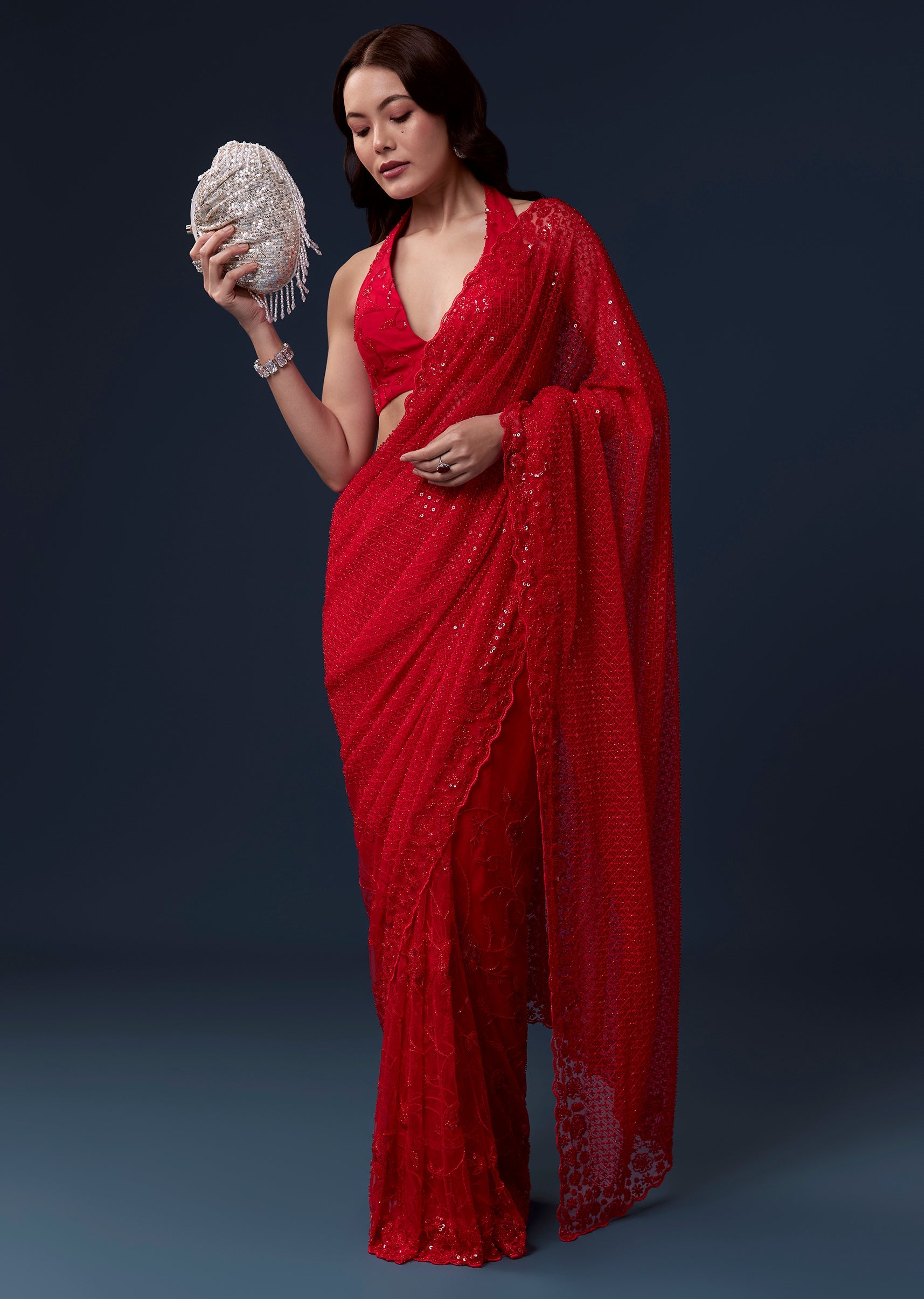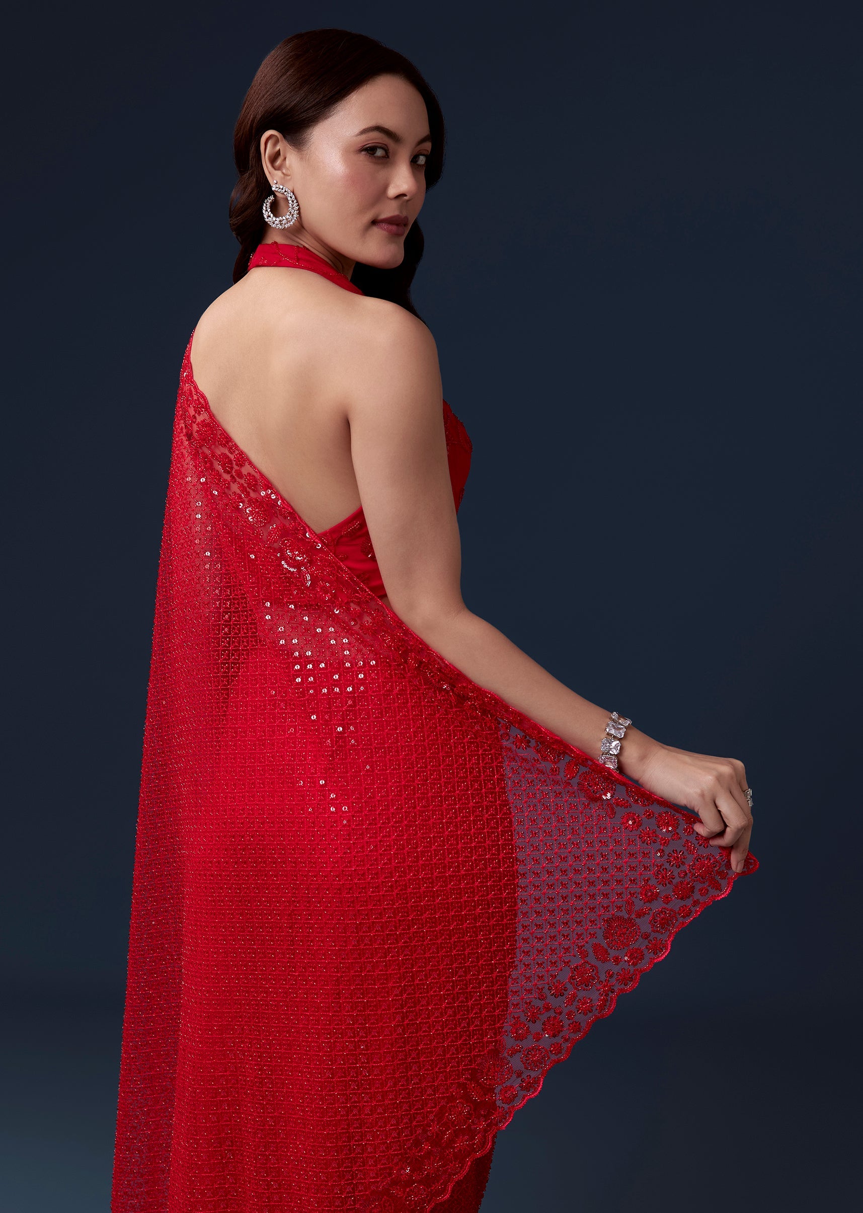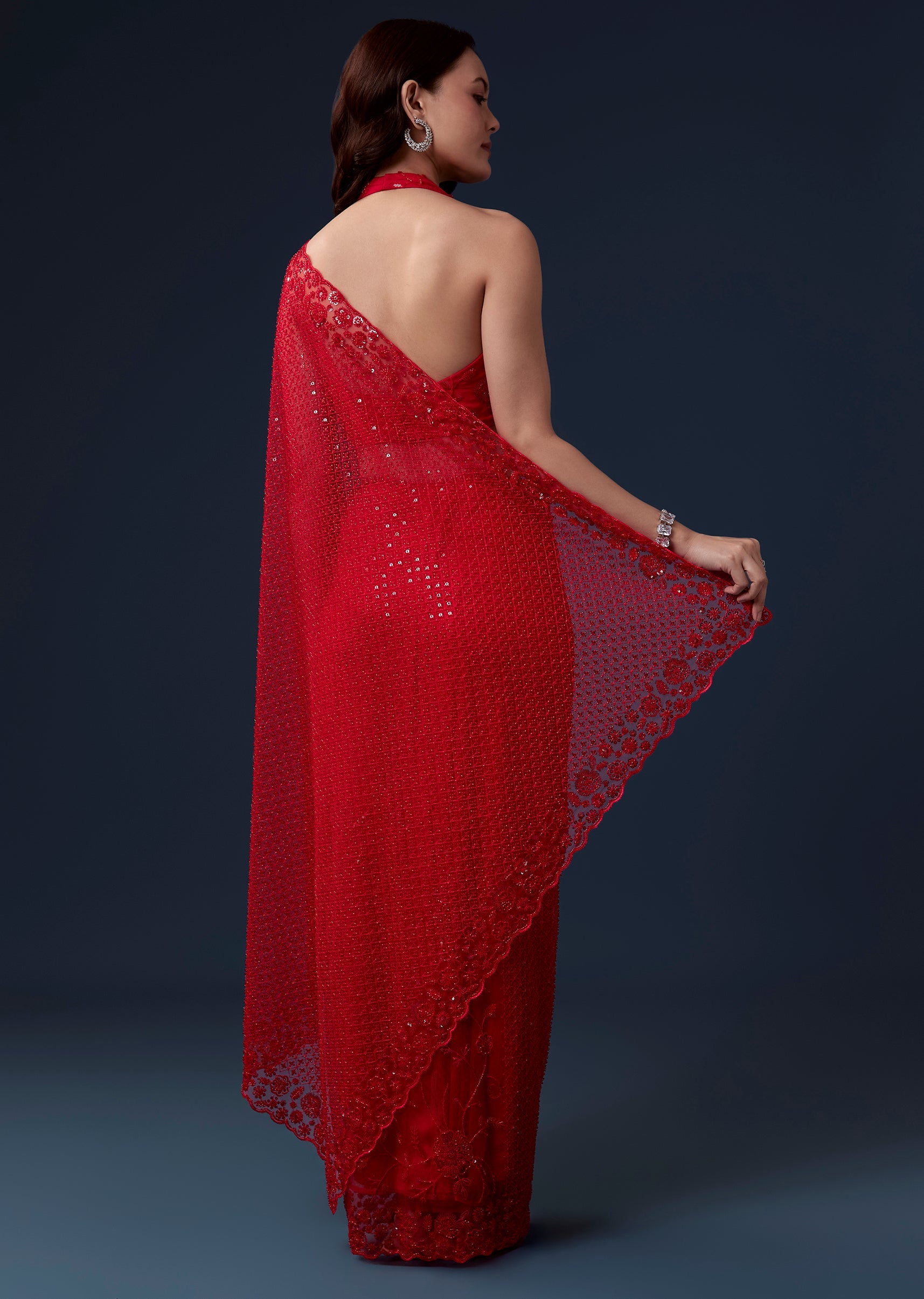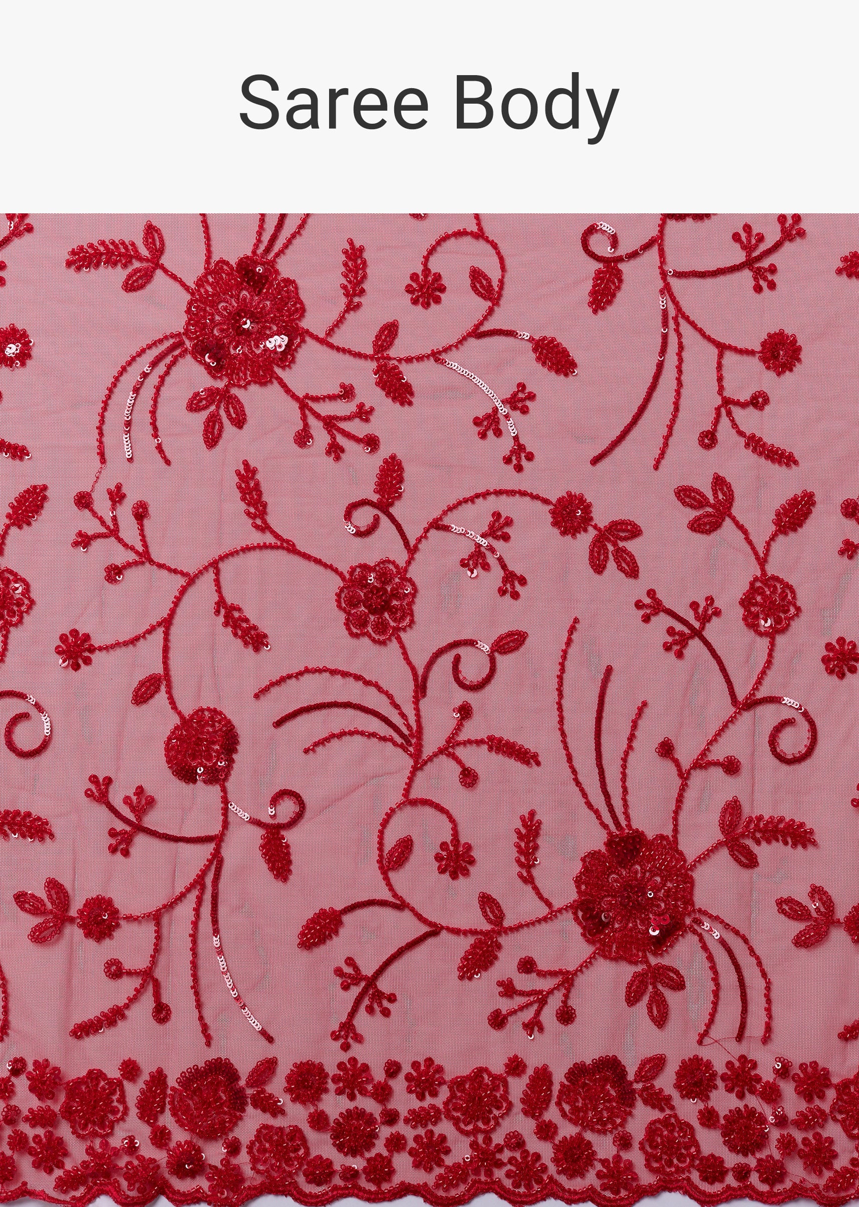 Red Net Saree With Cutdana Beads And Sequin Embroidery