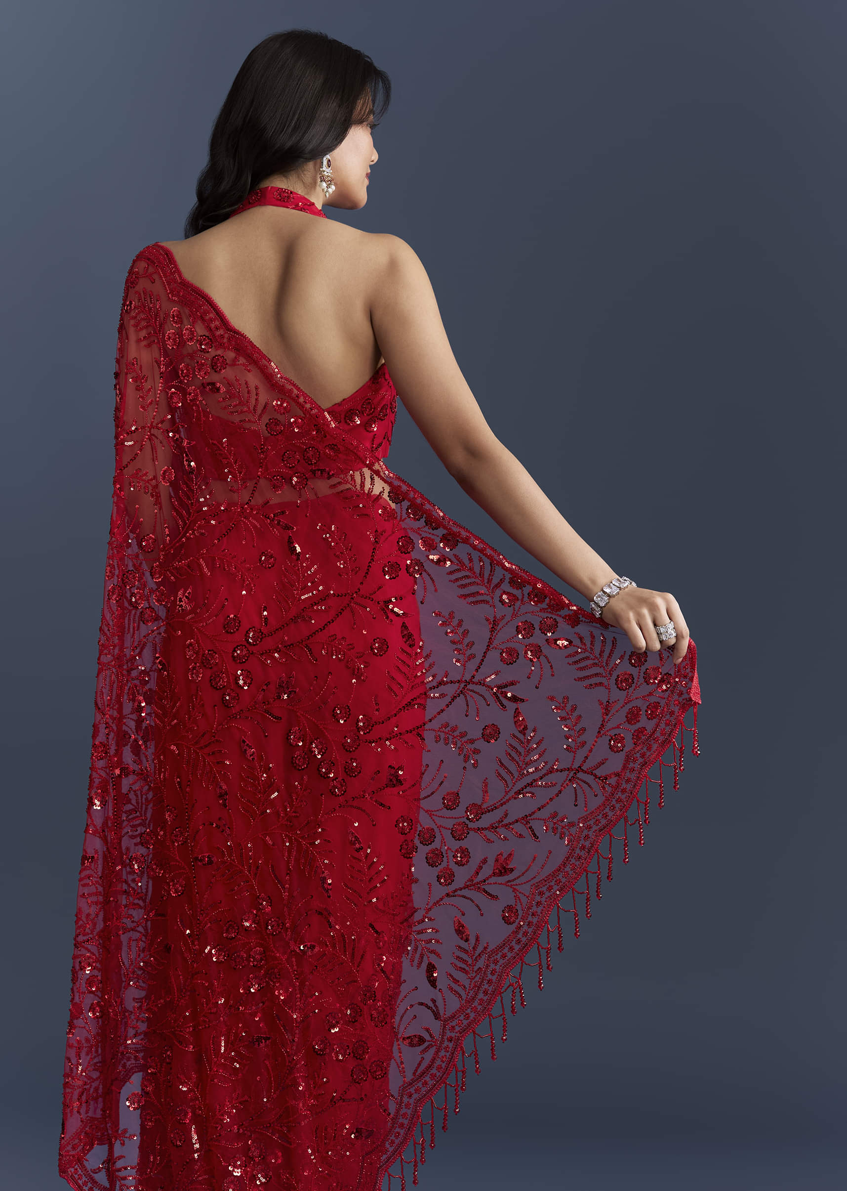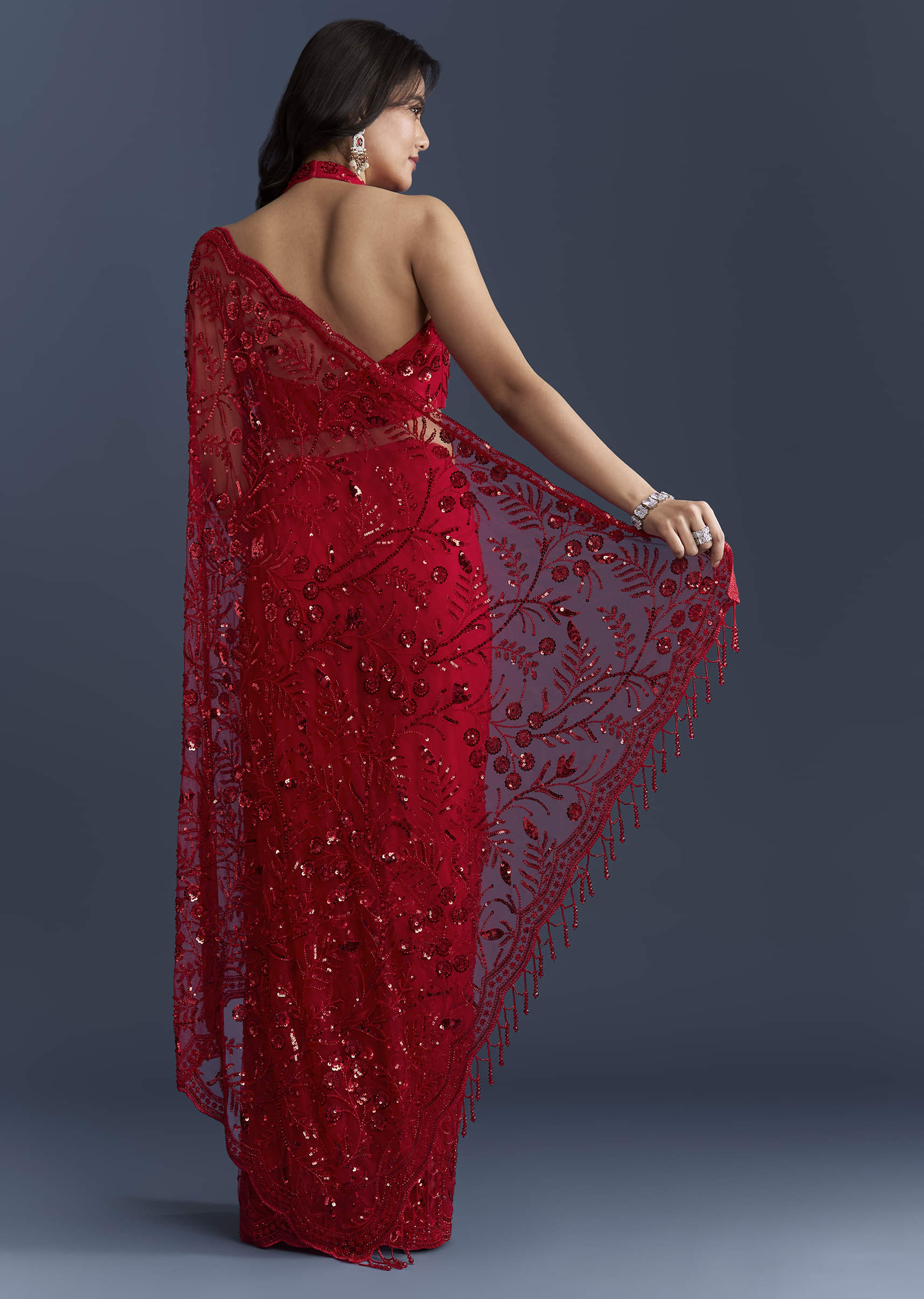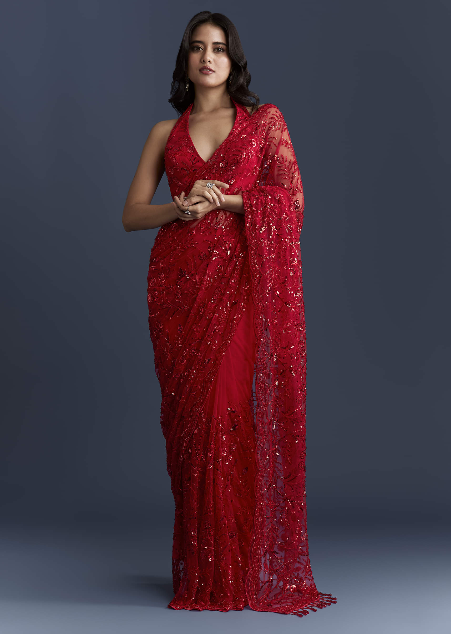 Sparkle that moves with you defines this red net saree, keeping the drape light while delivering high-impact shine. Floral sequins, a scalloped border and playful latkans finish the look, balanced... More Product Details