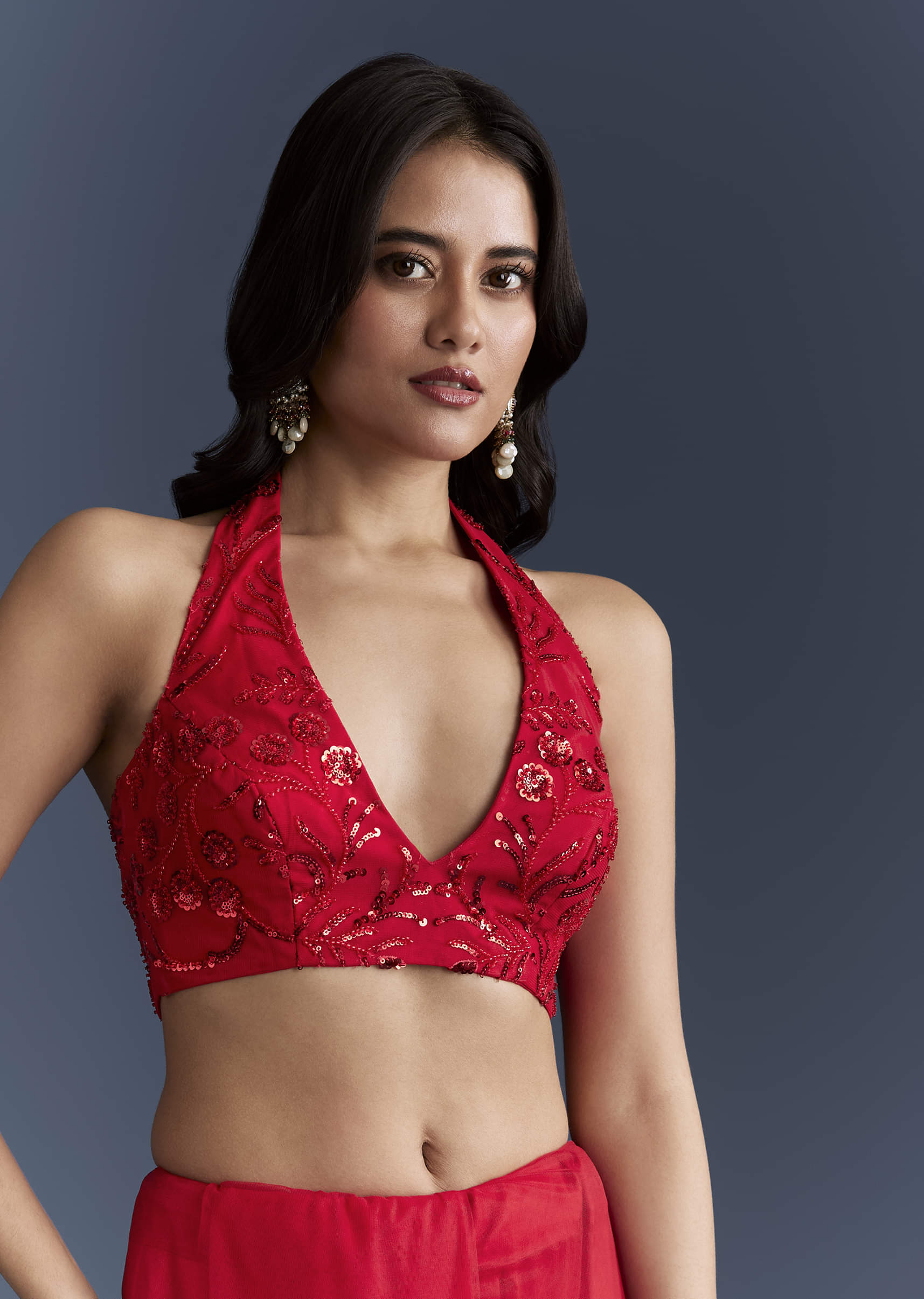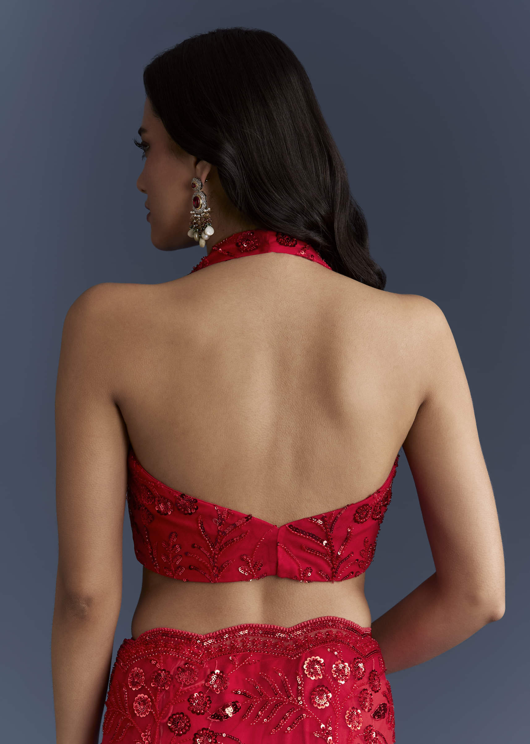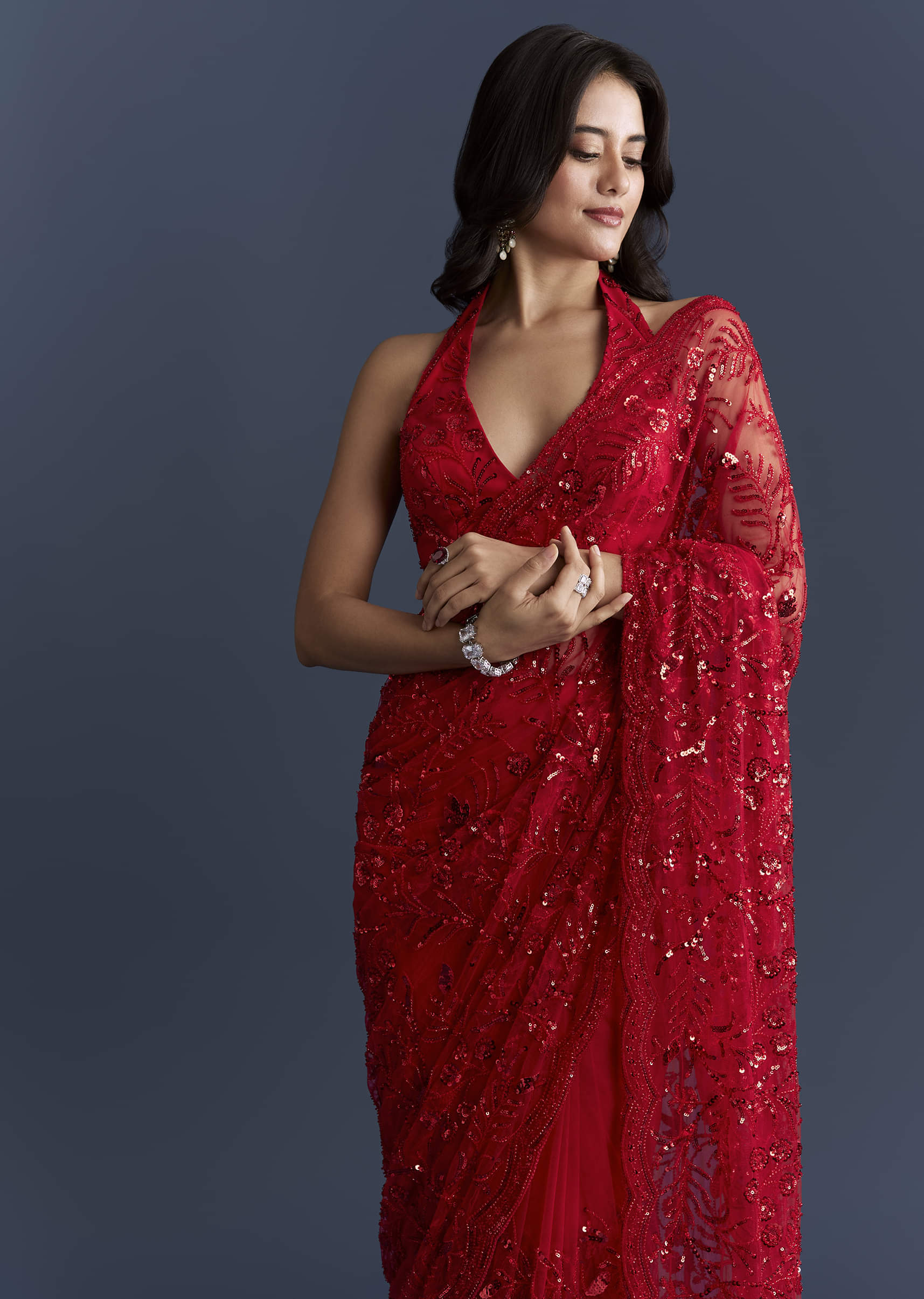 Sparkle that moves with you defines this red net saree, keeping the drape light while delivering high-impact shine. Floral sequins, a scalloped border and playful latkans finish the look, balanced... More Product Details