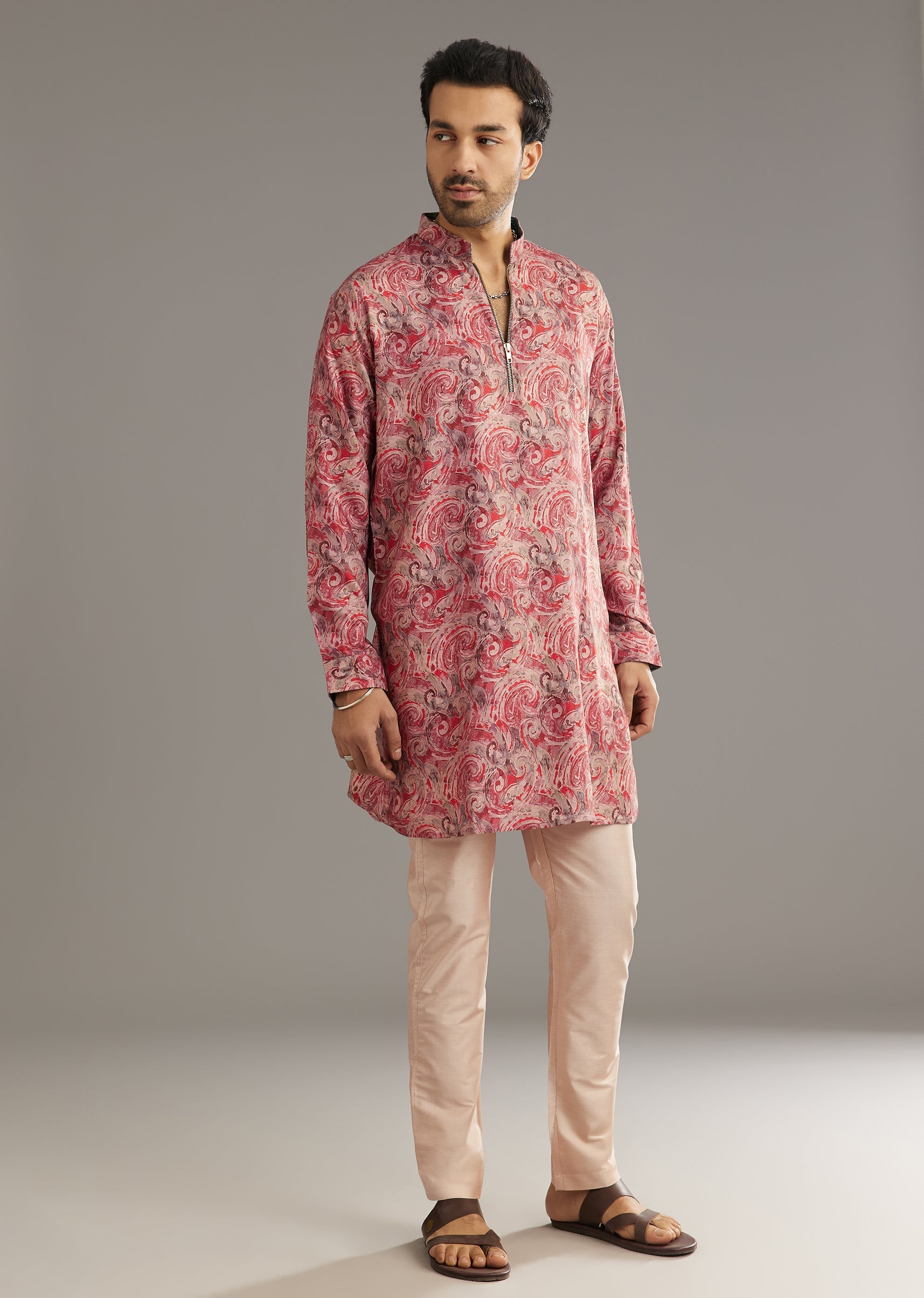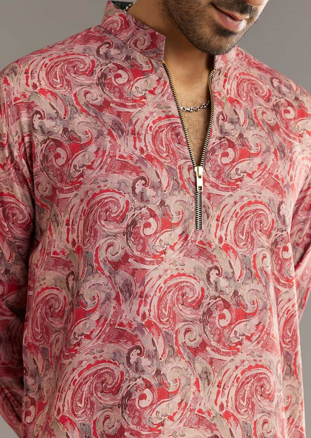 Red Pashmina Silk Zipper Kurta Set With Paisley Swirl Print