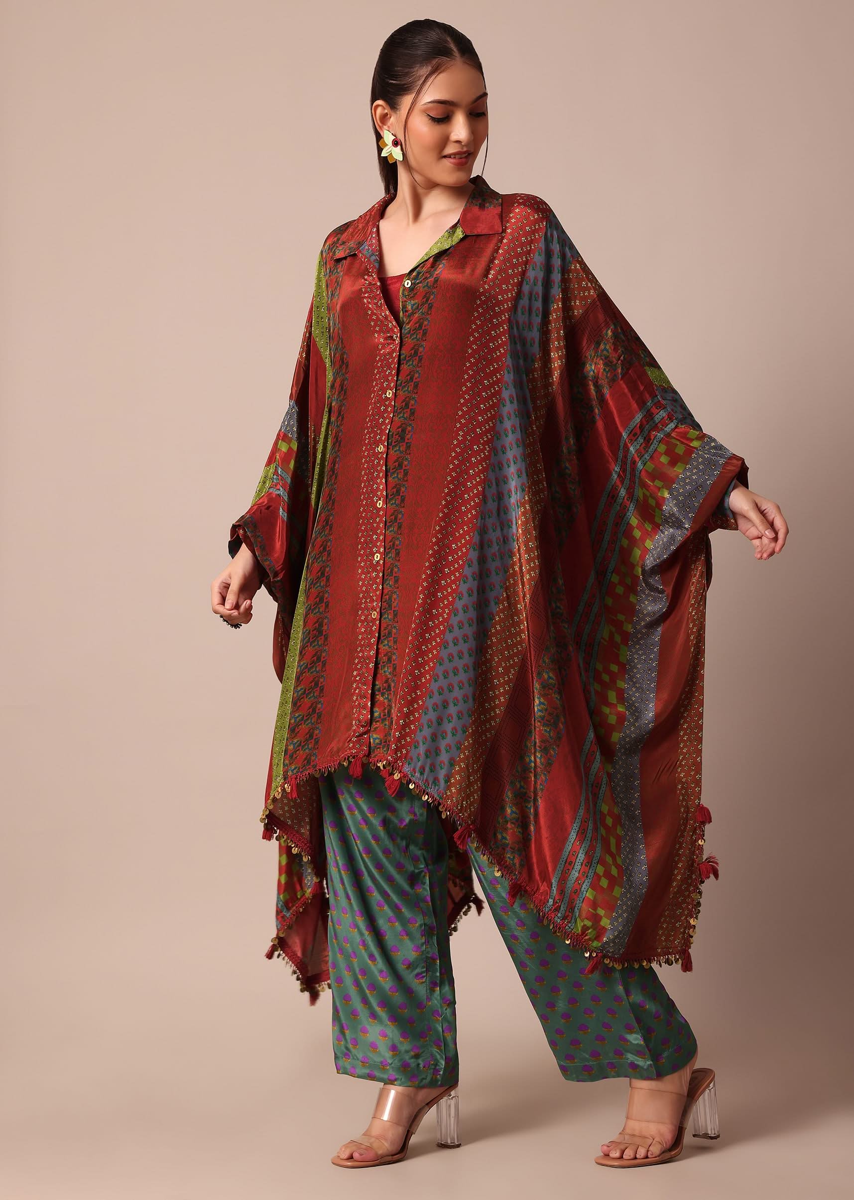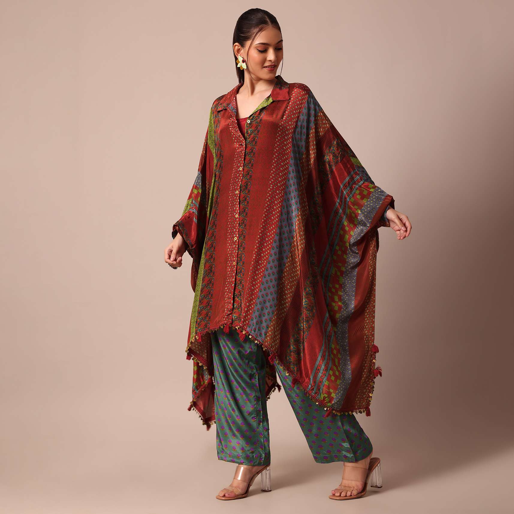 Step into casual elegance with our Vibrant Red Printed Kaftaan Set. It features a shirt collar and flared sleeves kaftaan with intricate resham and metal coin detailing. Crafted from lightweight crepe this pack includes an inner a stylish kaftaan and comfortable pants. It is a versatile attire that effortlessly enhances your sense of style. Awarded As The Most Trusted Brand We'Re Delivering Styles You Love Just As Promised.