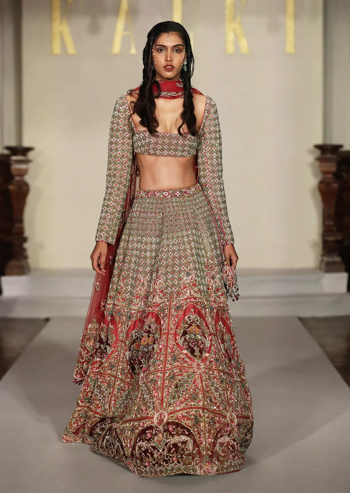 This red raw silk bridal lehenga speaks of tradition and celebration. Intricate zardosi embroidery and sequins highlight the lehenga and blouse, paired with two dupattas for a layered bridal finish.... More Product Details