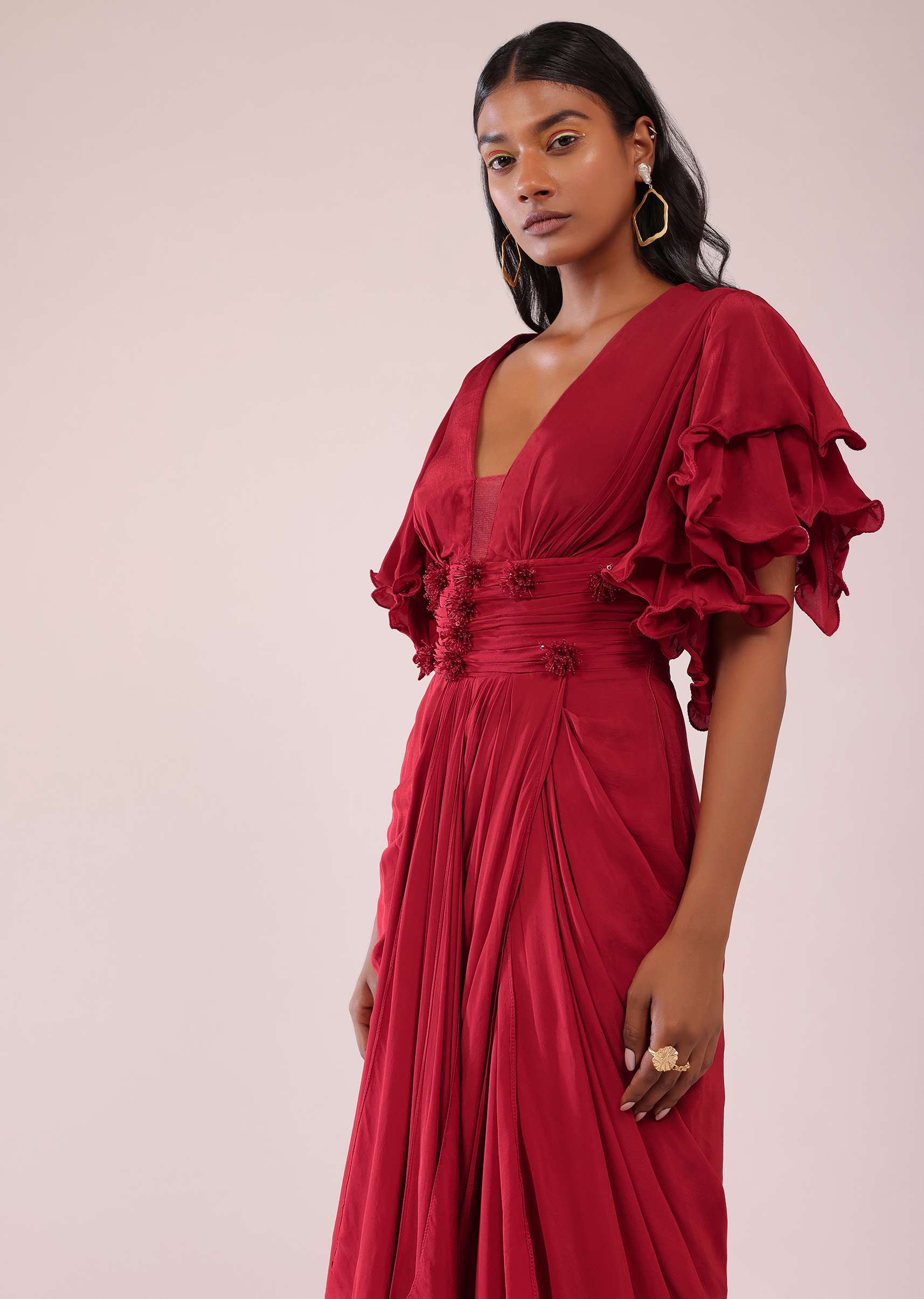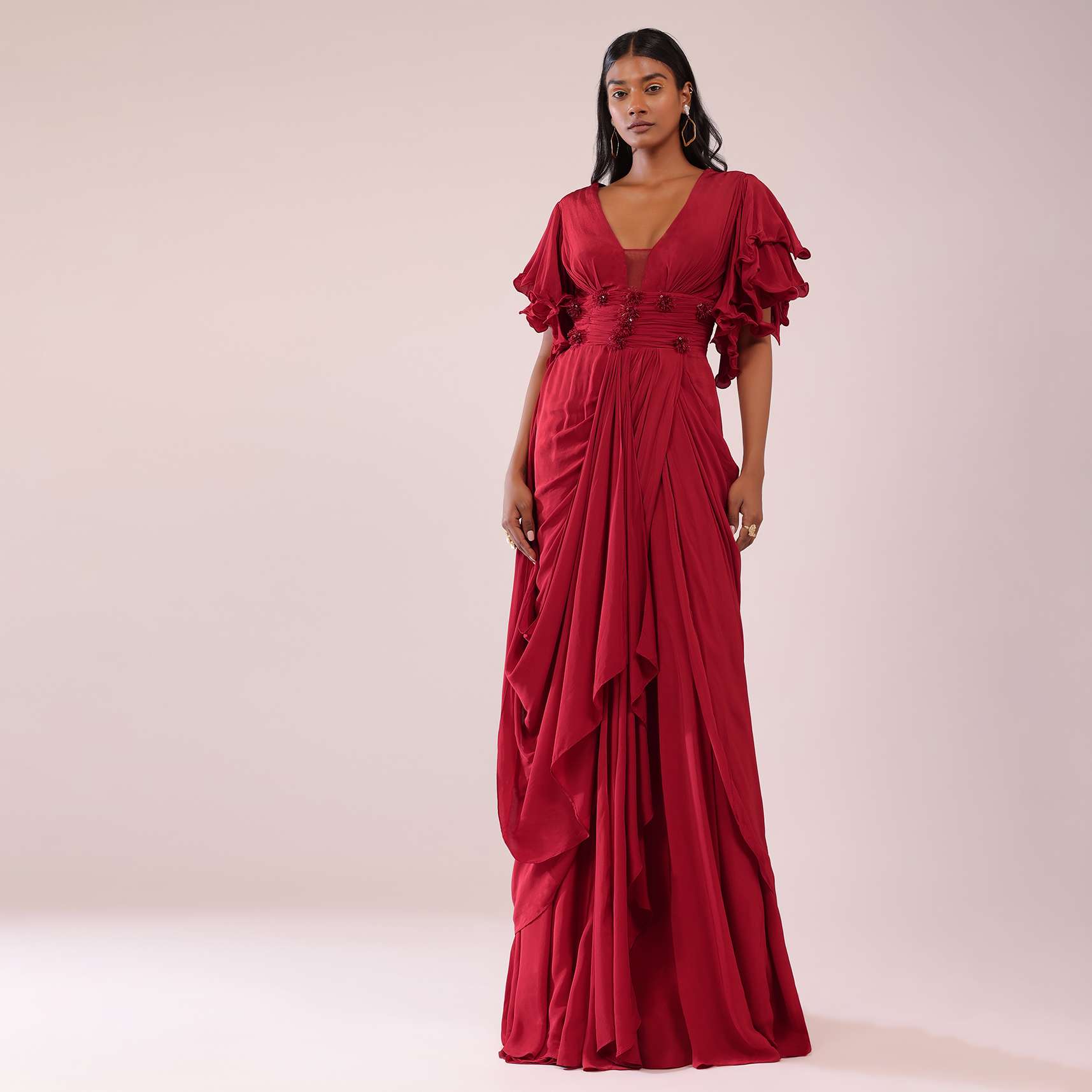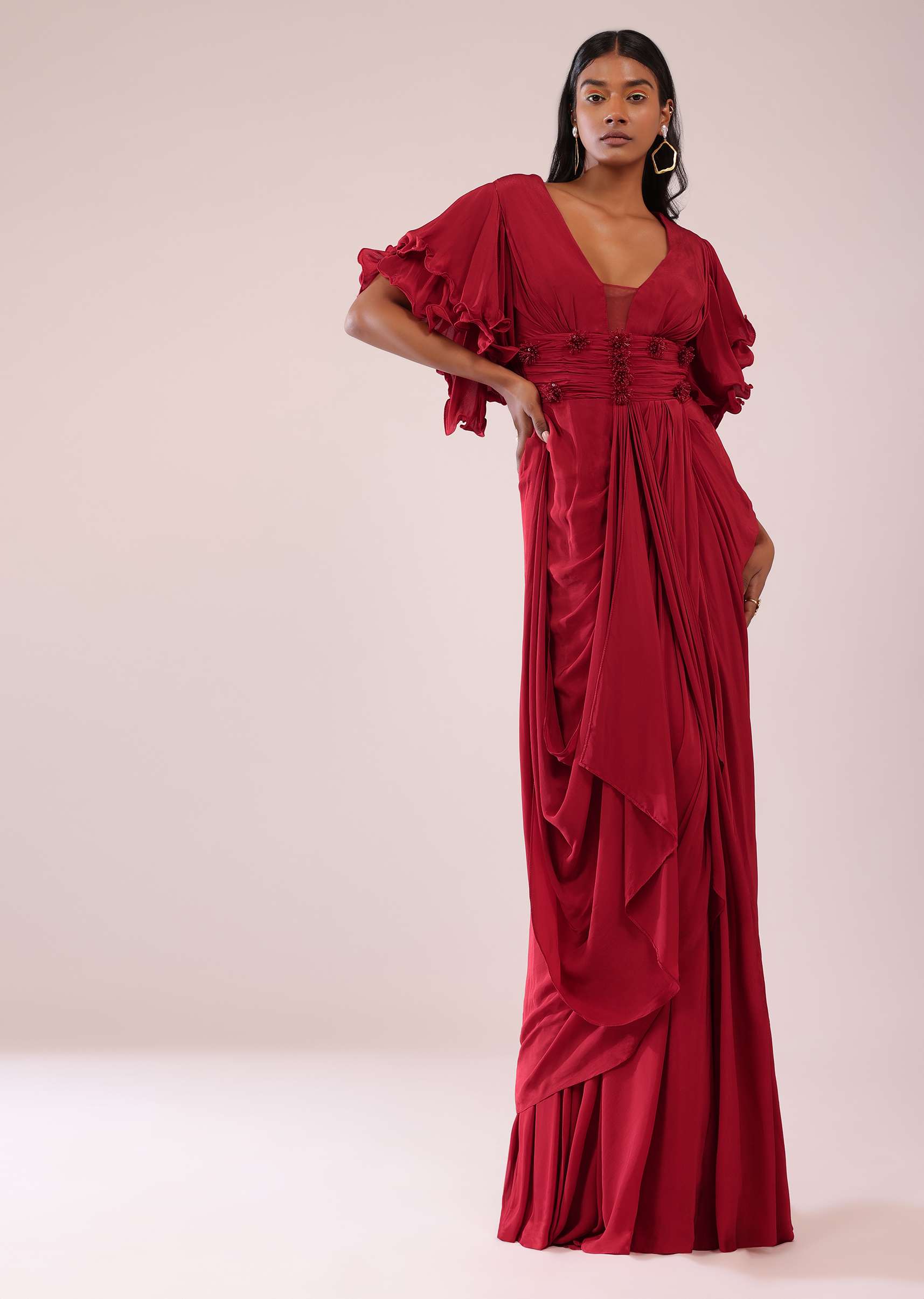 Red Saree Gown In Crepe With Frill Sleeves And Delicate Hand Embroidery