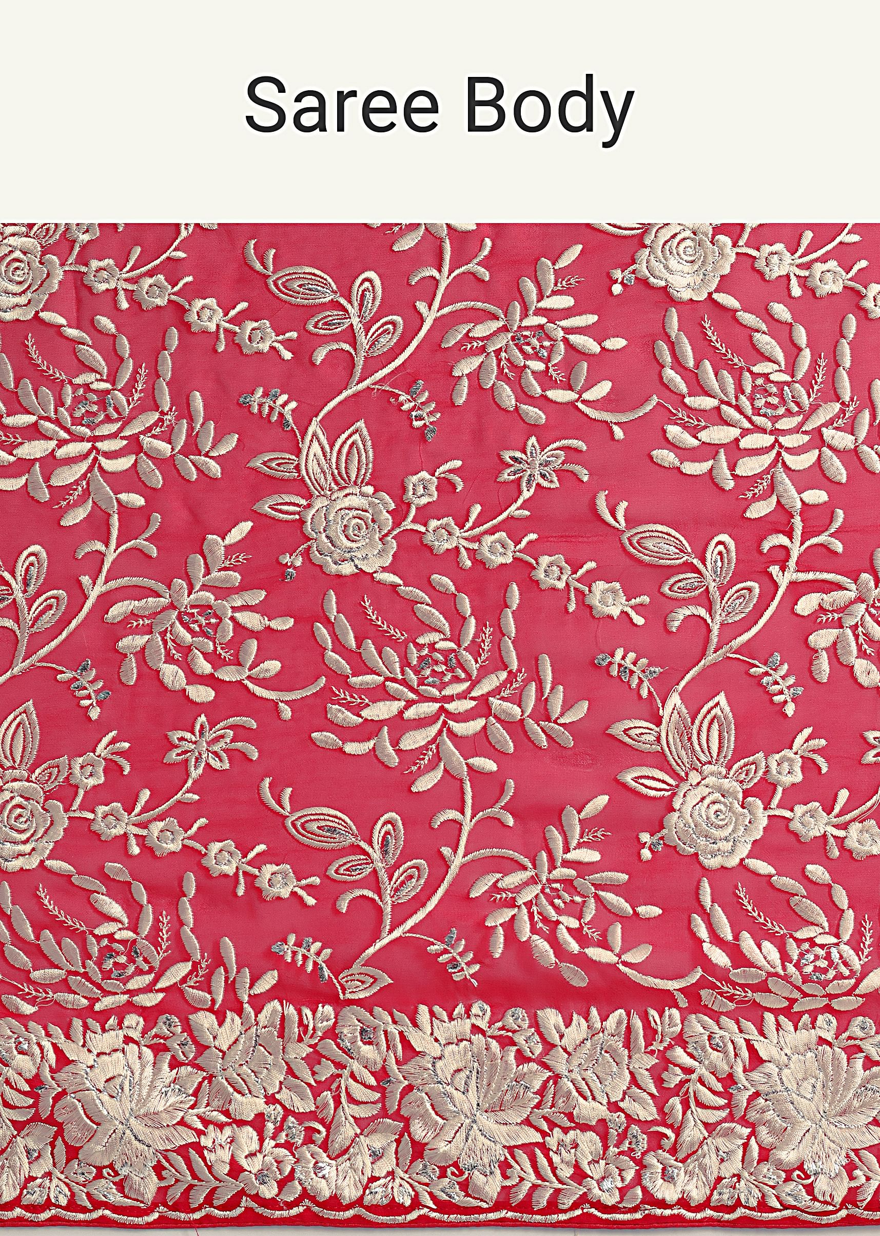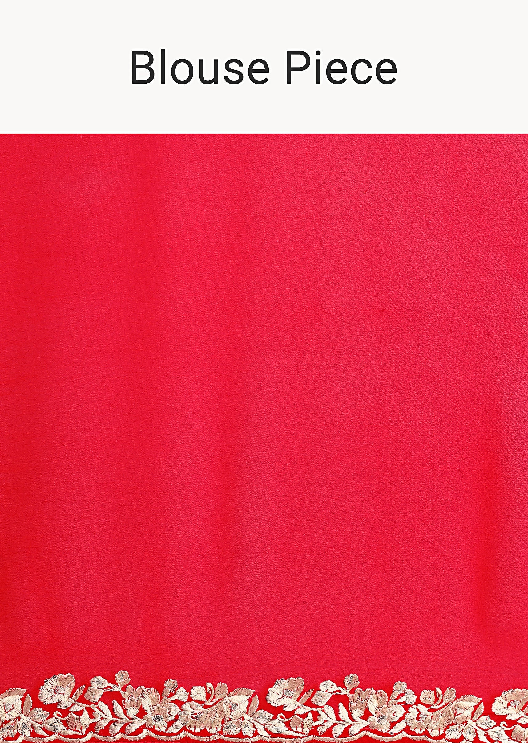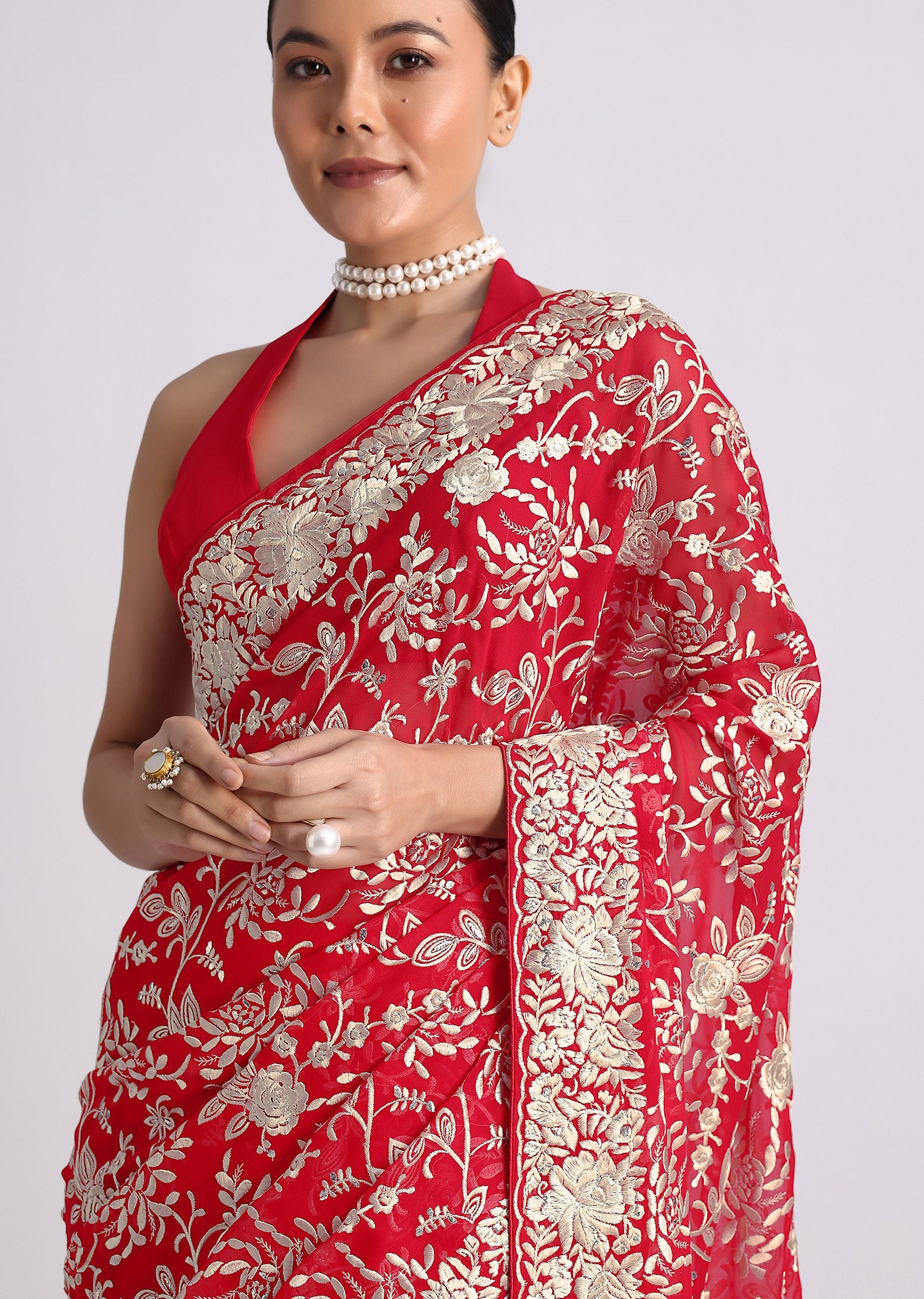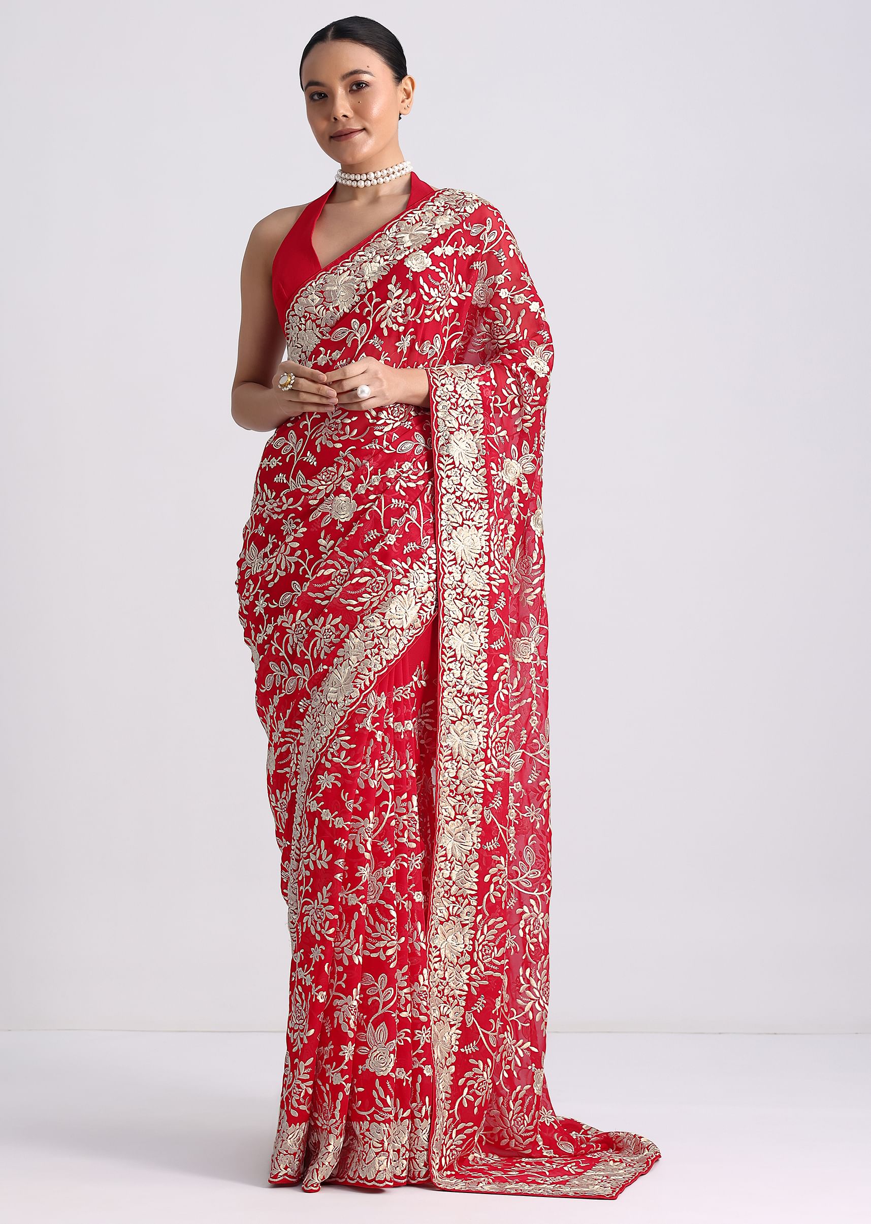 A beautiful testament to vibrant hues and rich textures is this beautiful georgette saree. Adorned with traditional parsi gara embroidery, the jaal pattern motifs lend an elegant charm. Exquisitely crafted with resham thread embroidery, this ensemble is an ideal choice to light up festive gatherings. Awarded as the Most Trusted Brand, we're delivering styles you love, just as promised.