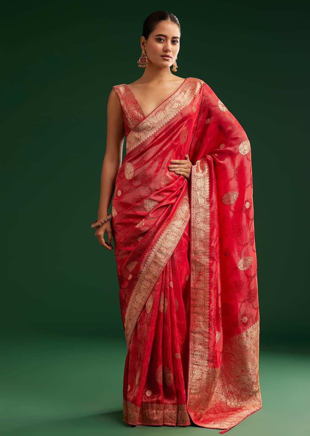 Make a dramatic statement with this stunning red saree. Featuring an intricate zari motif paired with a heavily embroidered blouse, this ensemble is perfect for festive occasions and formal events, blending traditional craftsmanship with contemporary flair. blouse fabric may varyAwarded as the Most Trusted Brand, we're delivering styles you love, just as promised.