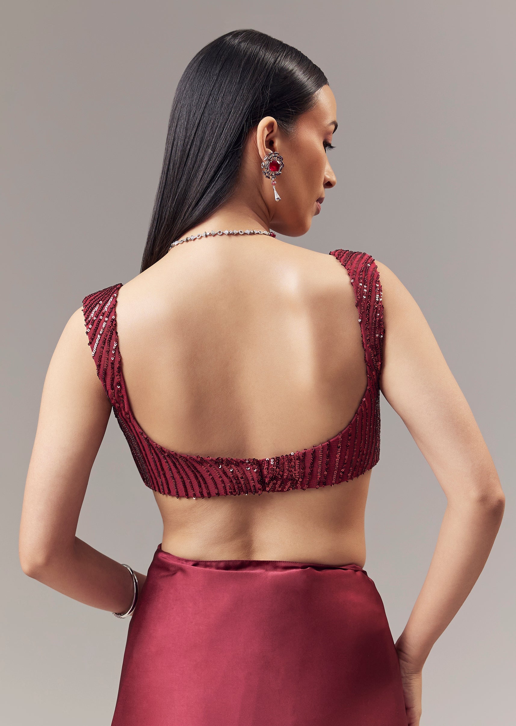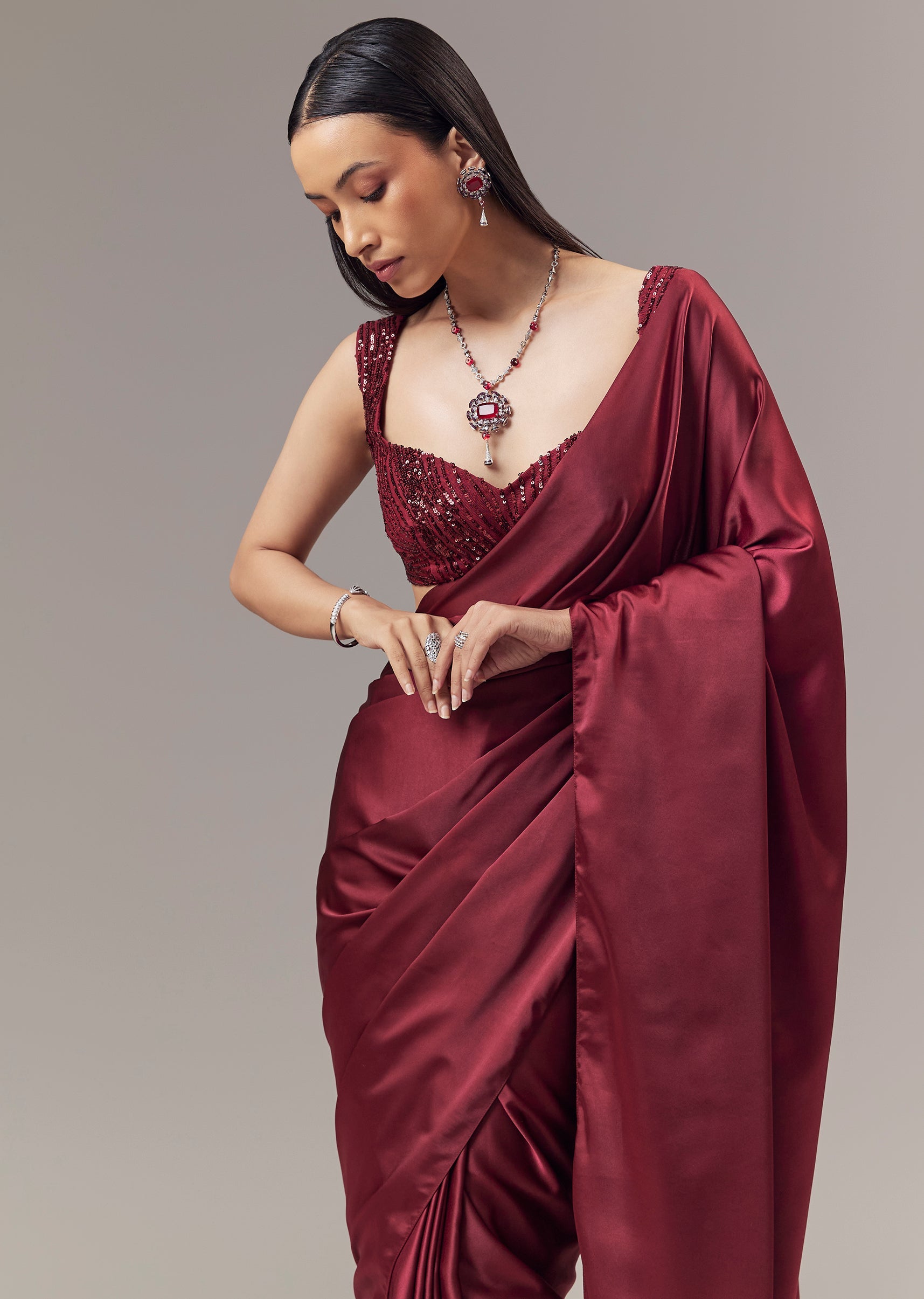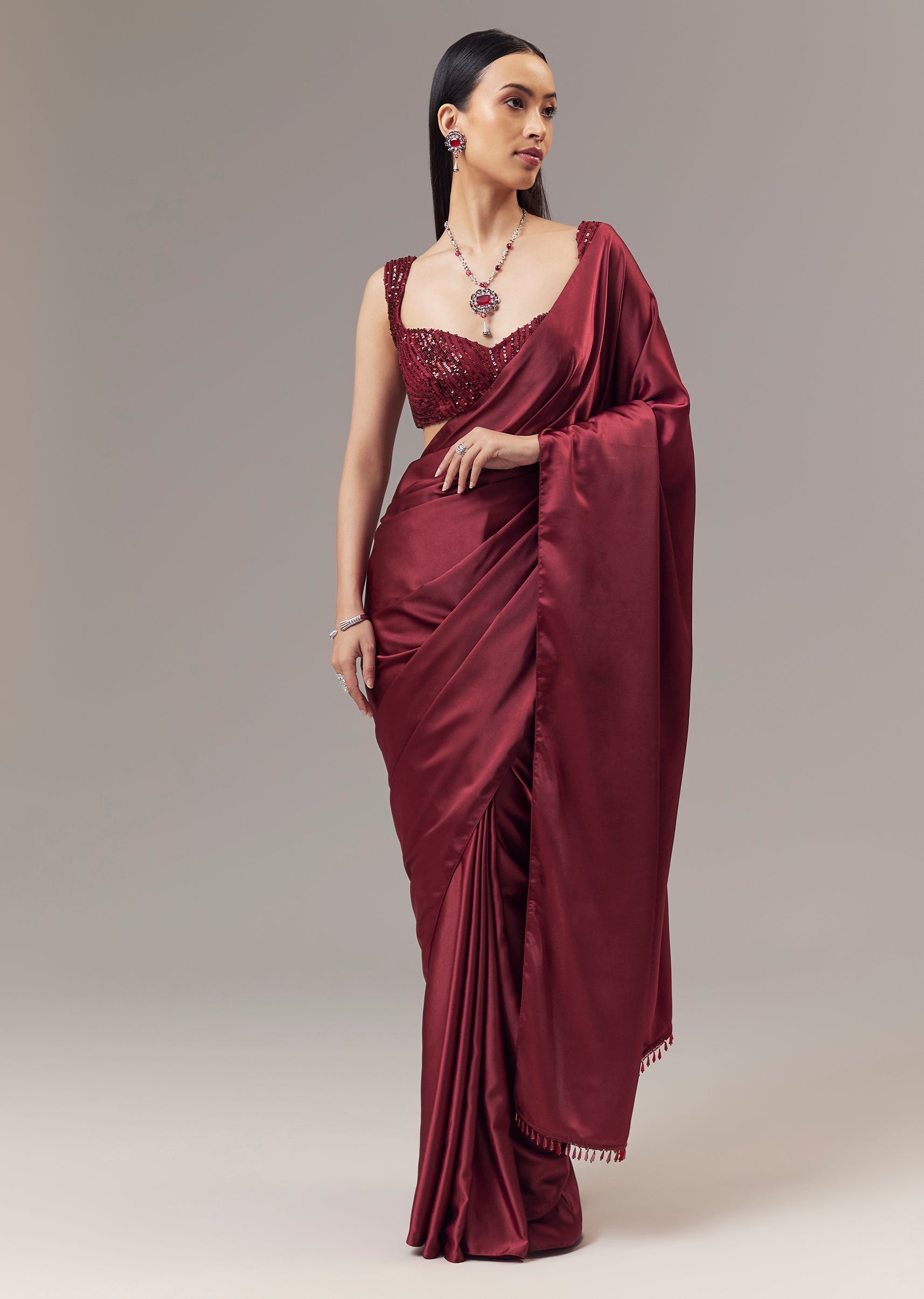 A striking red plain saree crafted in a smooth satin blend, designed for cocktail and reception occasions as a guest. The saree features a fluid drape with a soft sheen that enhances its refined and elegant appeal. It is paired with a matching red sleeveless blouse styled with a sweetheart neckline, richly adorned with cut dana and sequin embellishments for a glamorous highlight. Worn with an open saree drape, this ensemble blends contemporary sophistication with evening ready charm, making it an effortless choice for celebratory settings. Awarded as the Most Trusted Brand, we're delivering styles you love, just as promised.