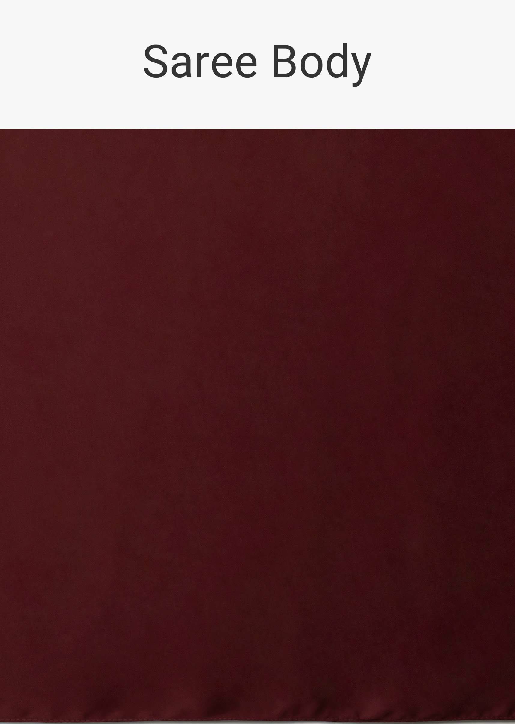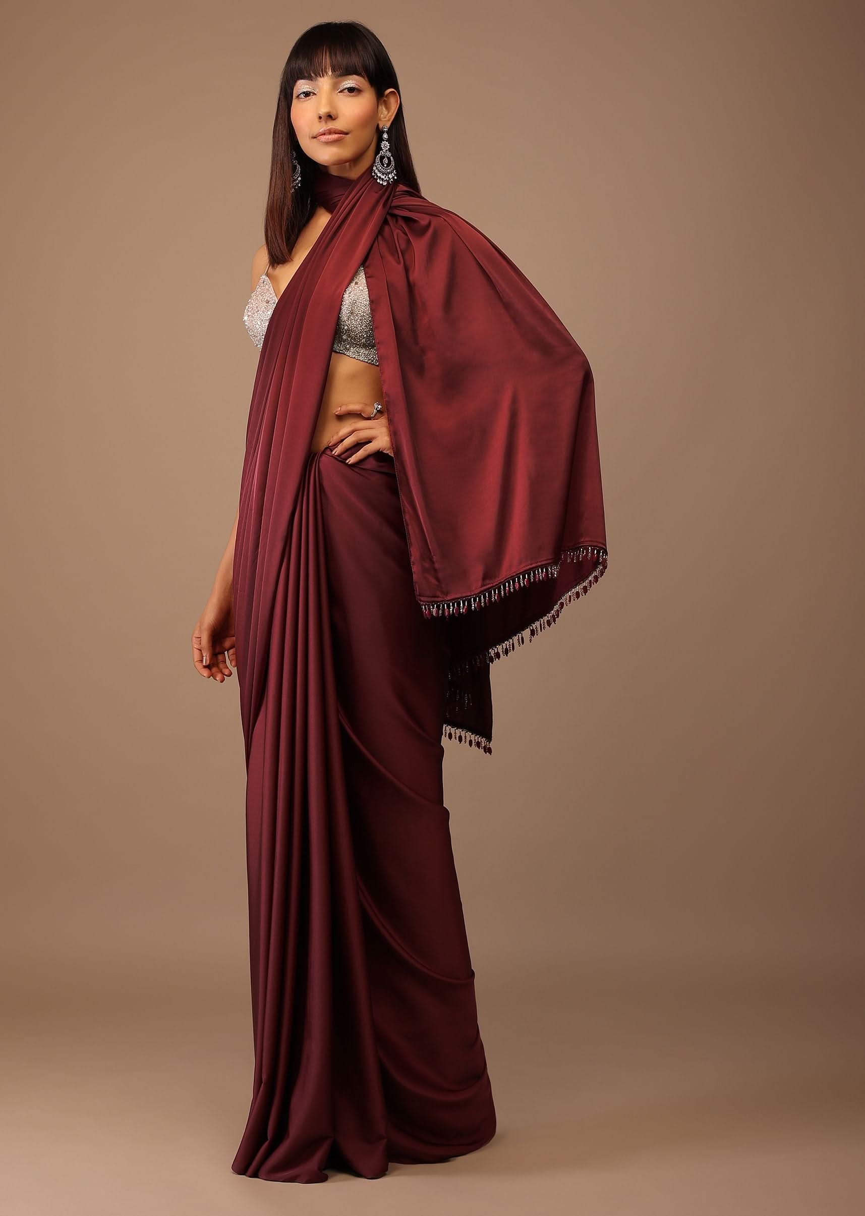 Blood Red Satin Saree With Fringes On The Pallu Paired With Hand Embroidered Bustier