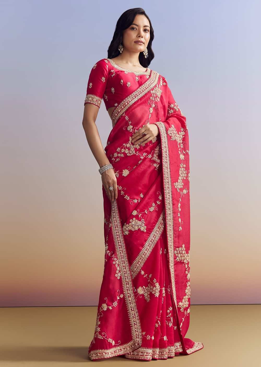 Traditional red satin saree adorned with floral jaal embroidery using cutdana, sequins, and beads. Includes an unstitched blouse. Ideal for Weddings and Engagement celebrations. Awarded as the Most Trusted Brand, we're delivering styles you love, just as promised.