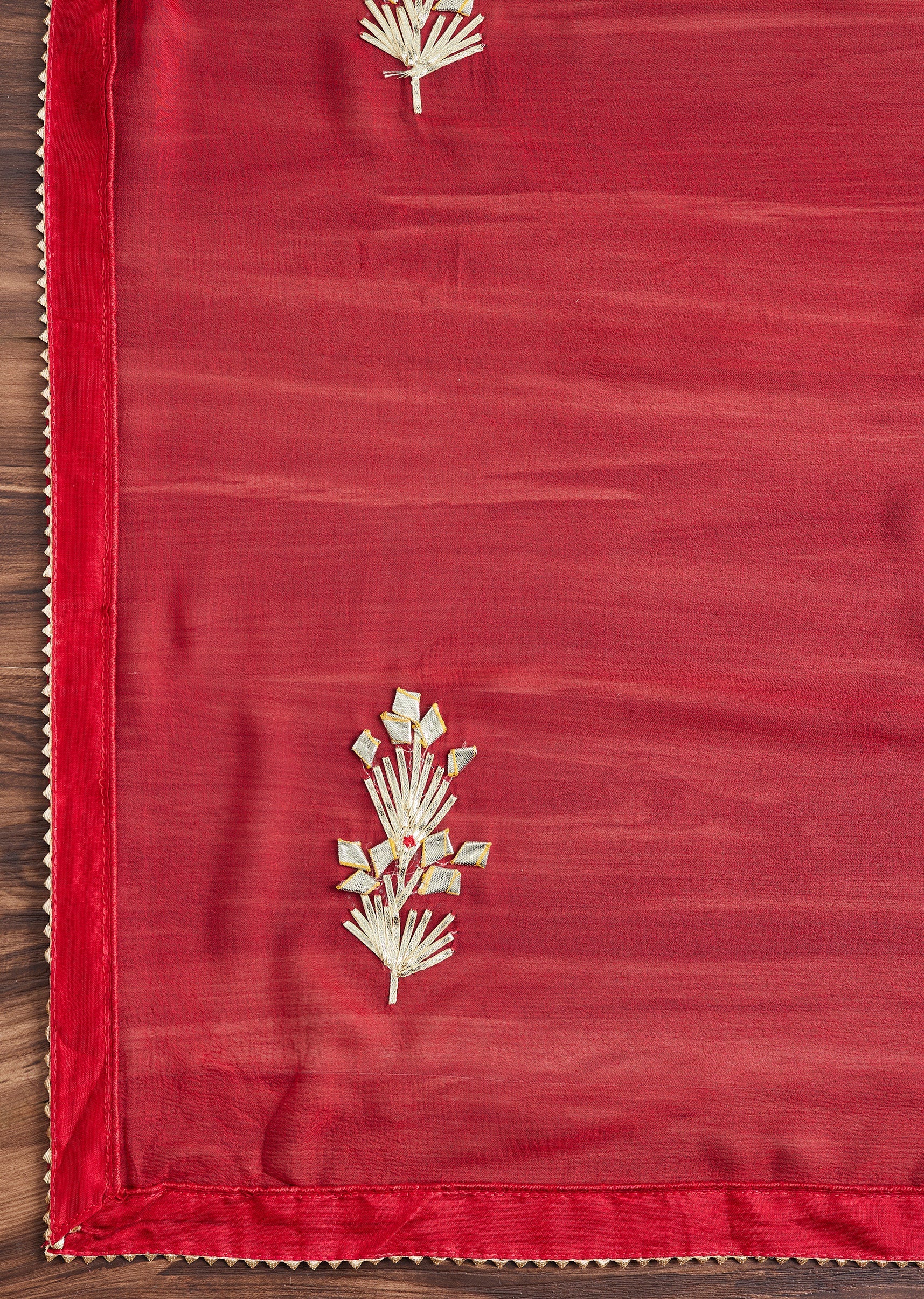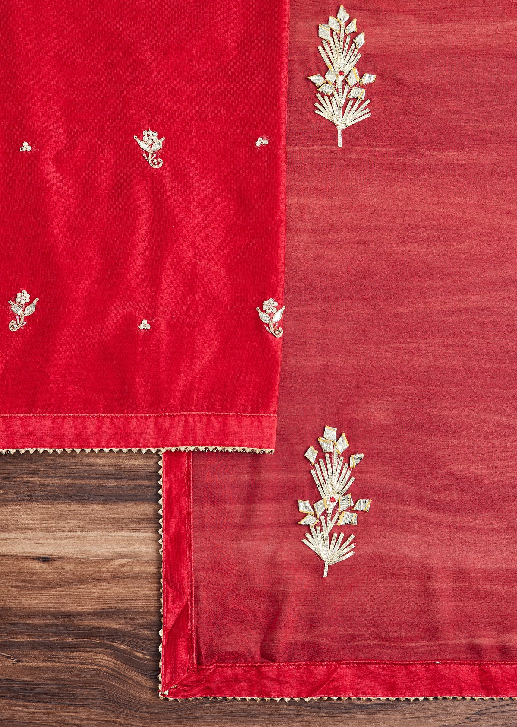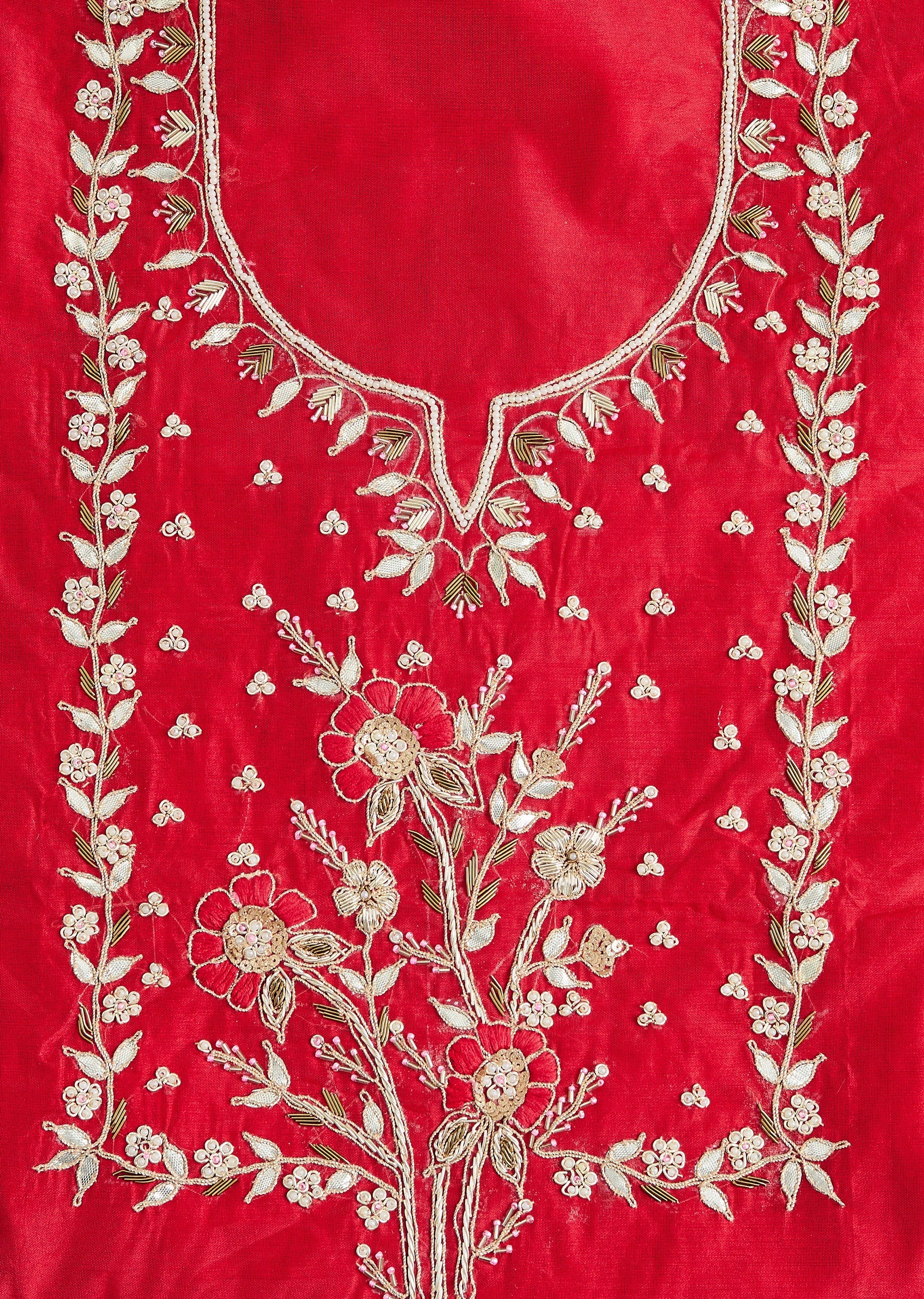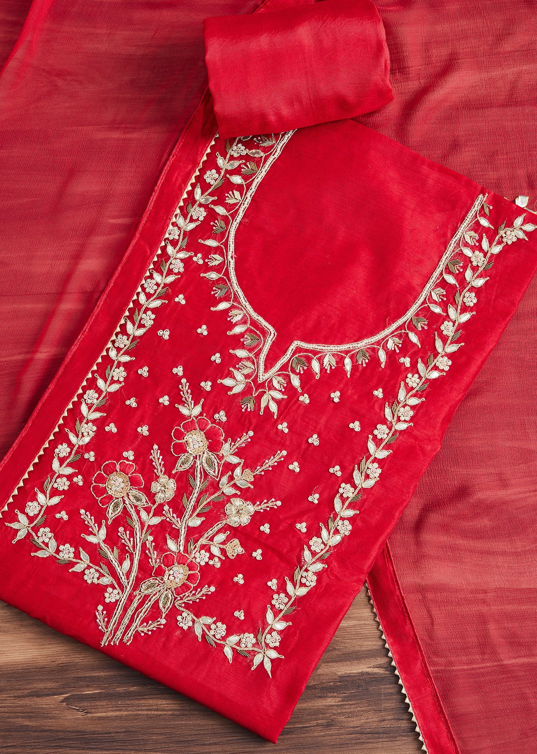 Red Satin Unstitched Suit With Dupatta