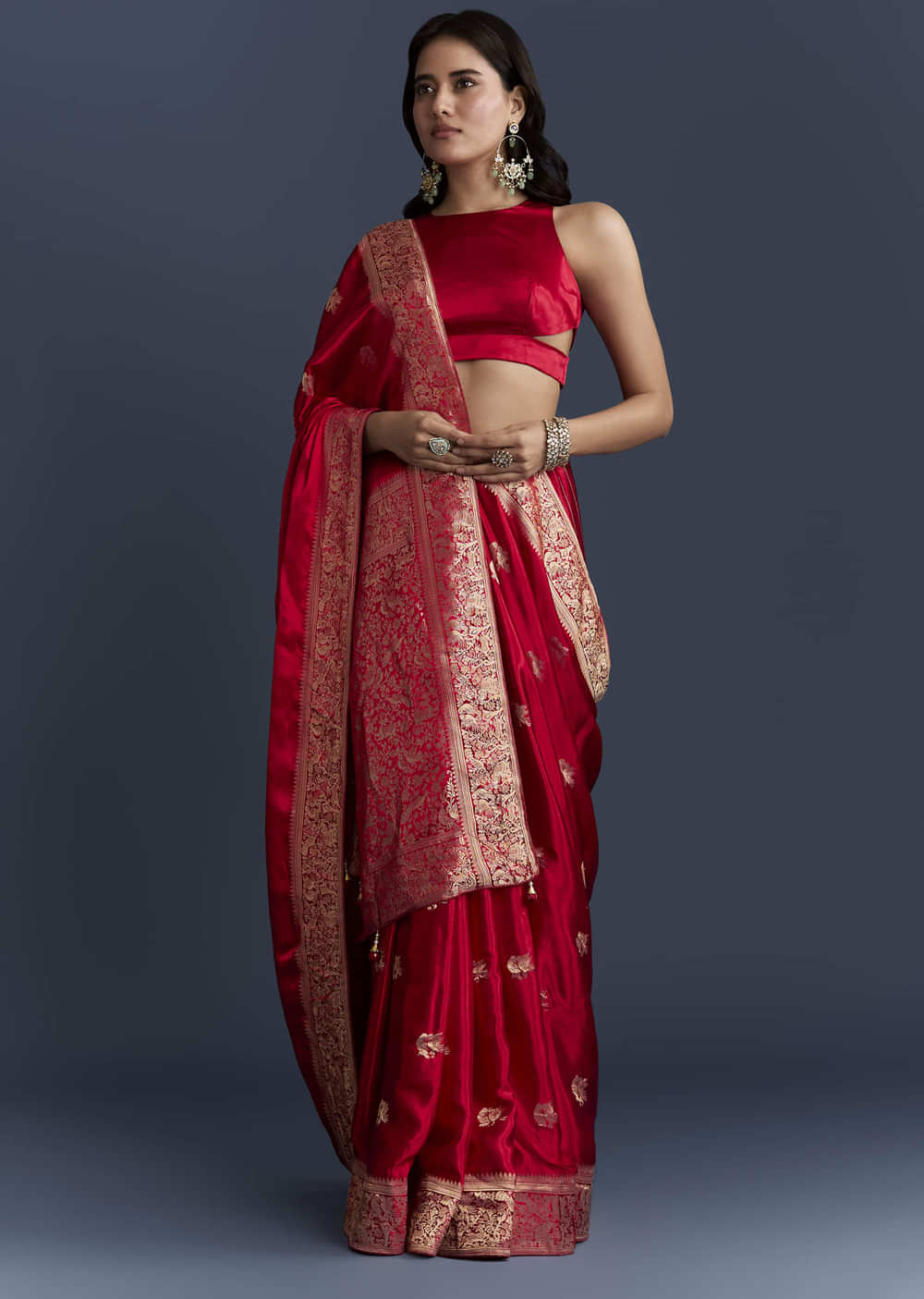 Striking and traditional, this red satin woven saree features zari on the border, pallu and tiny butti across the field. The satin’s gentle shine makes the colour read ceremonial without extra effort. You feel confident, radiant and ready for karwa chauth, pooja and festive celebrations. Awarded as the Most Trusted Brand, we're delivering styles you love, just as promised.