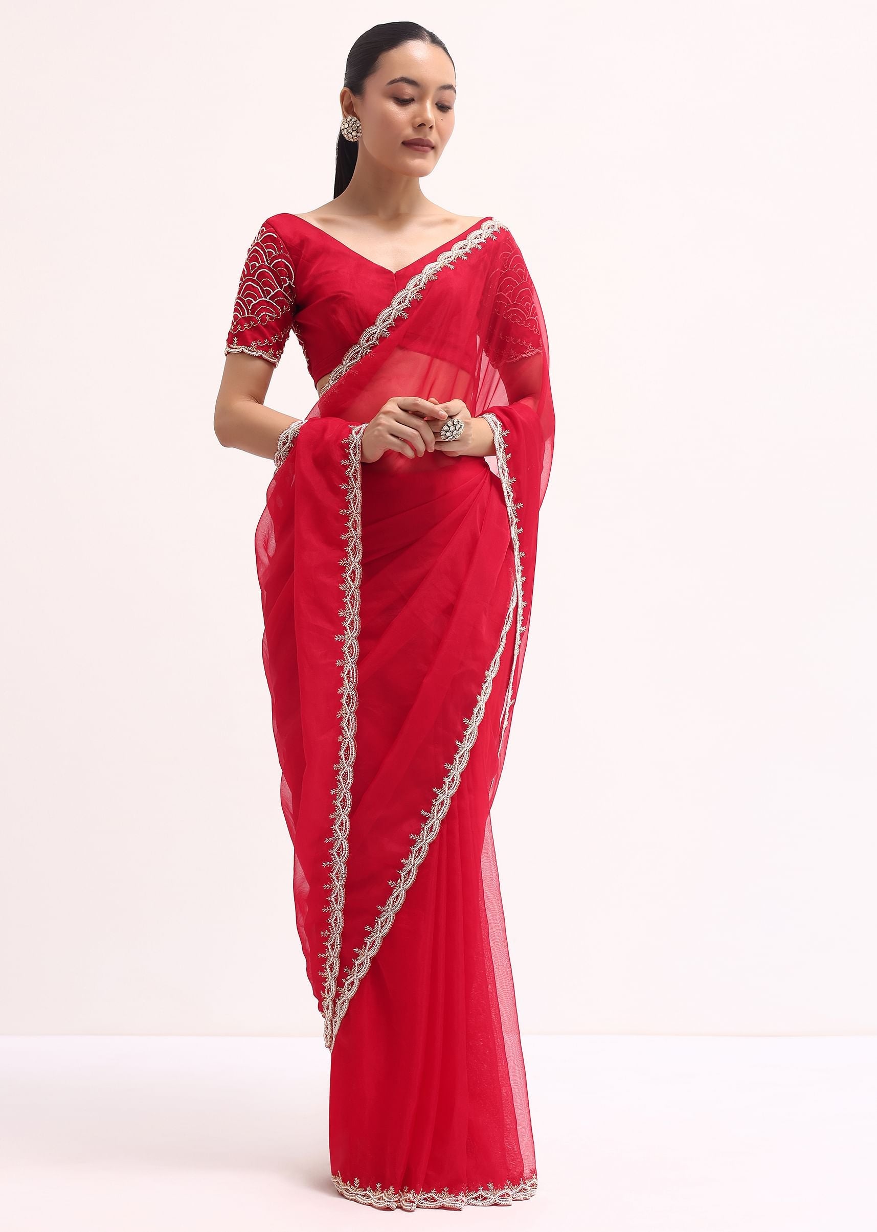 Step into the limelight with our stunning red saree ideal for weddings and festive celebrations. Made from elegant organza fabric it is beautifully adorned with cutdana and bead embroidered scallop borders. The saree is paired with an unstitched blouse. Awarded as the Most Trusted Brand, we're delivering styles you love, just as promised.