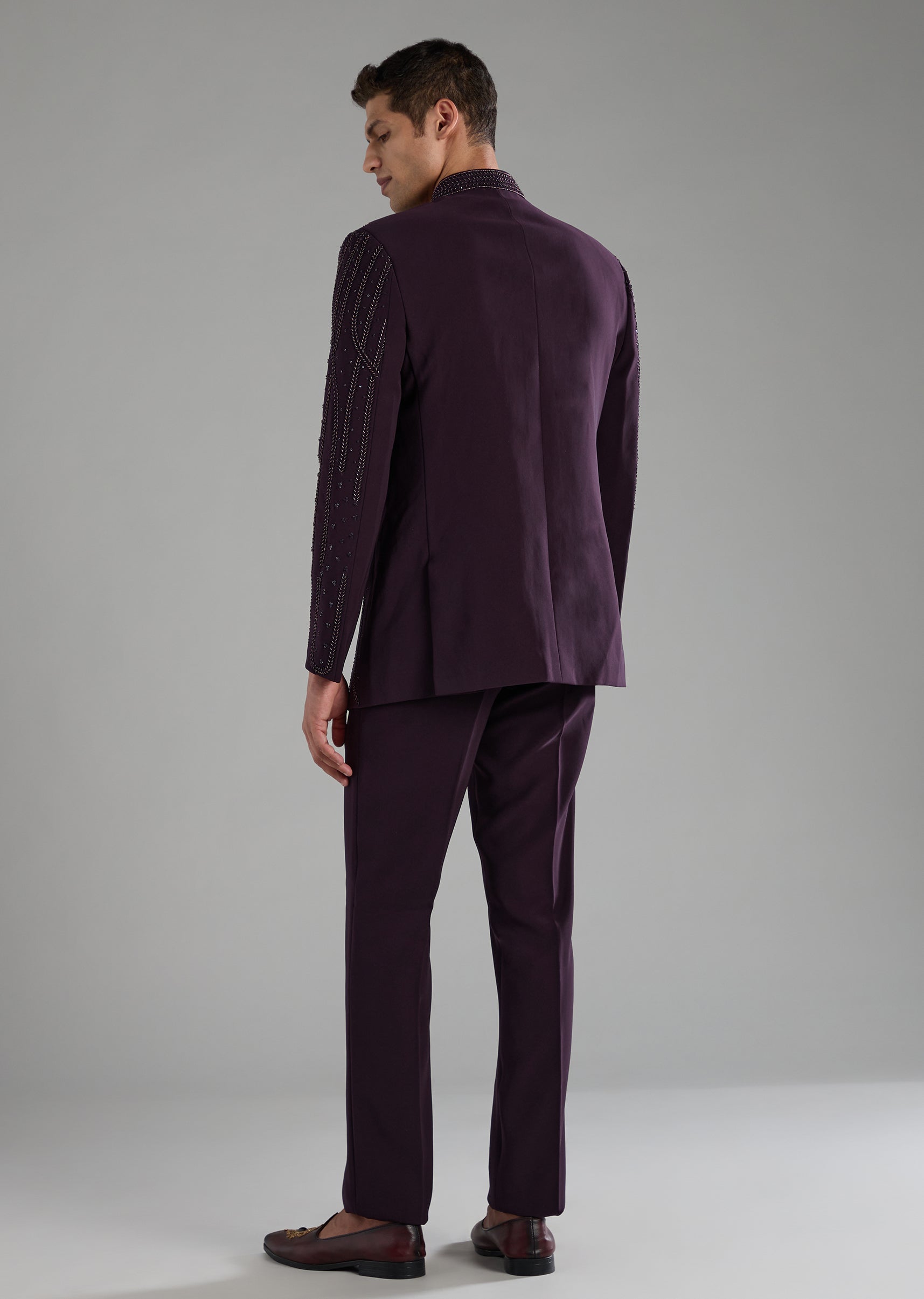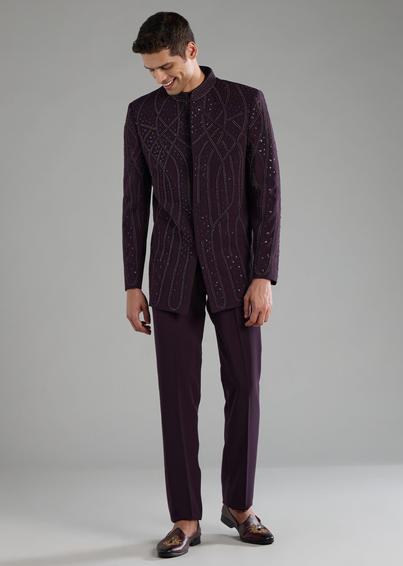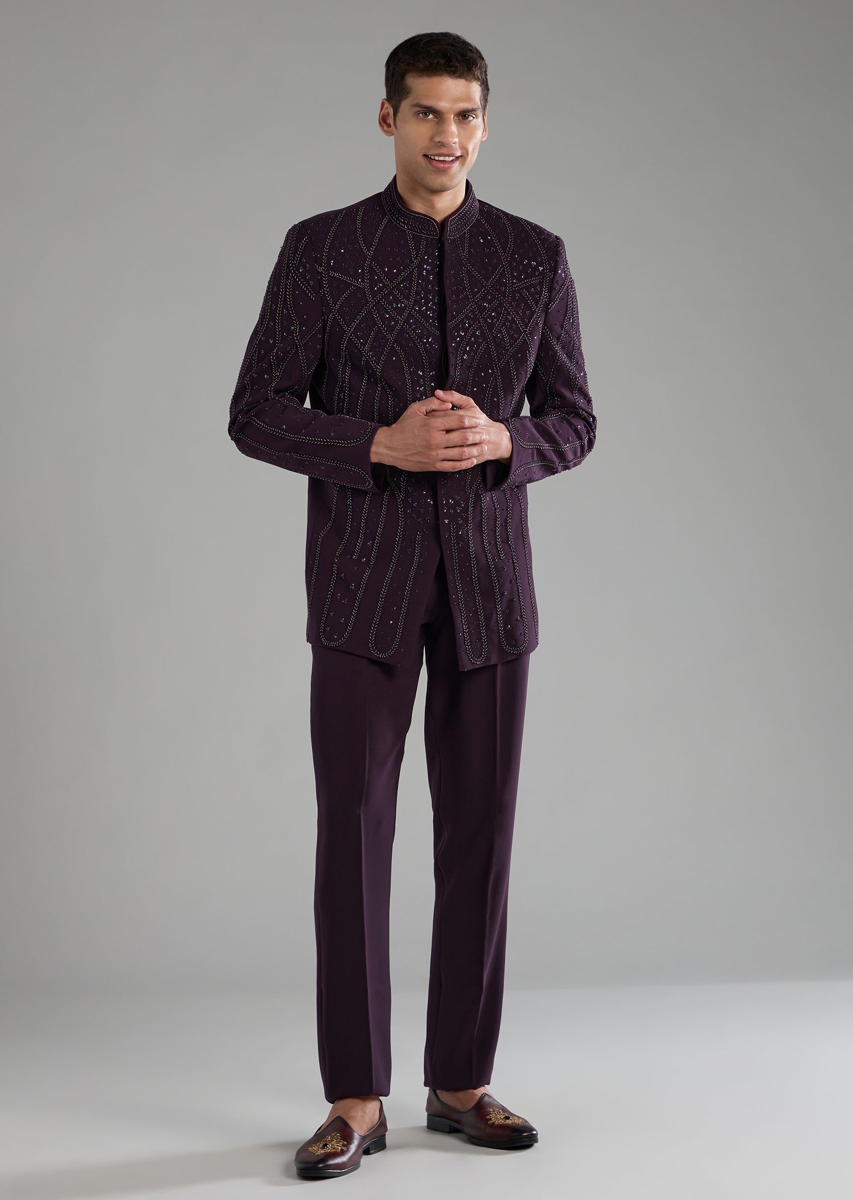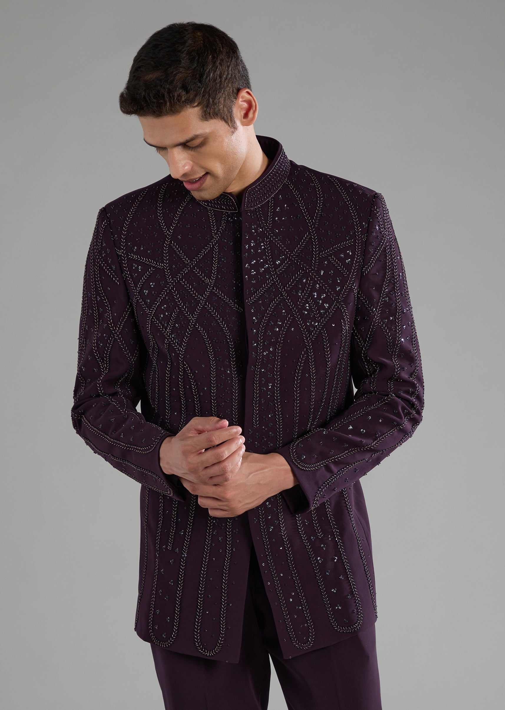 A touch of royal flair meets modern sparkle in this suiting fabric Jodhpuri set, enriched with resham thread, sequins, and bead highlights. The structured mandarin collar and refined button detailing... More Product Details