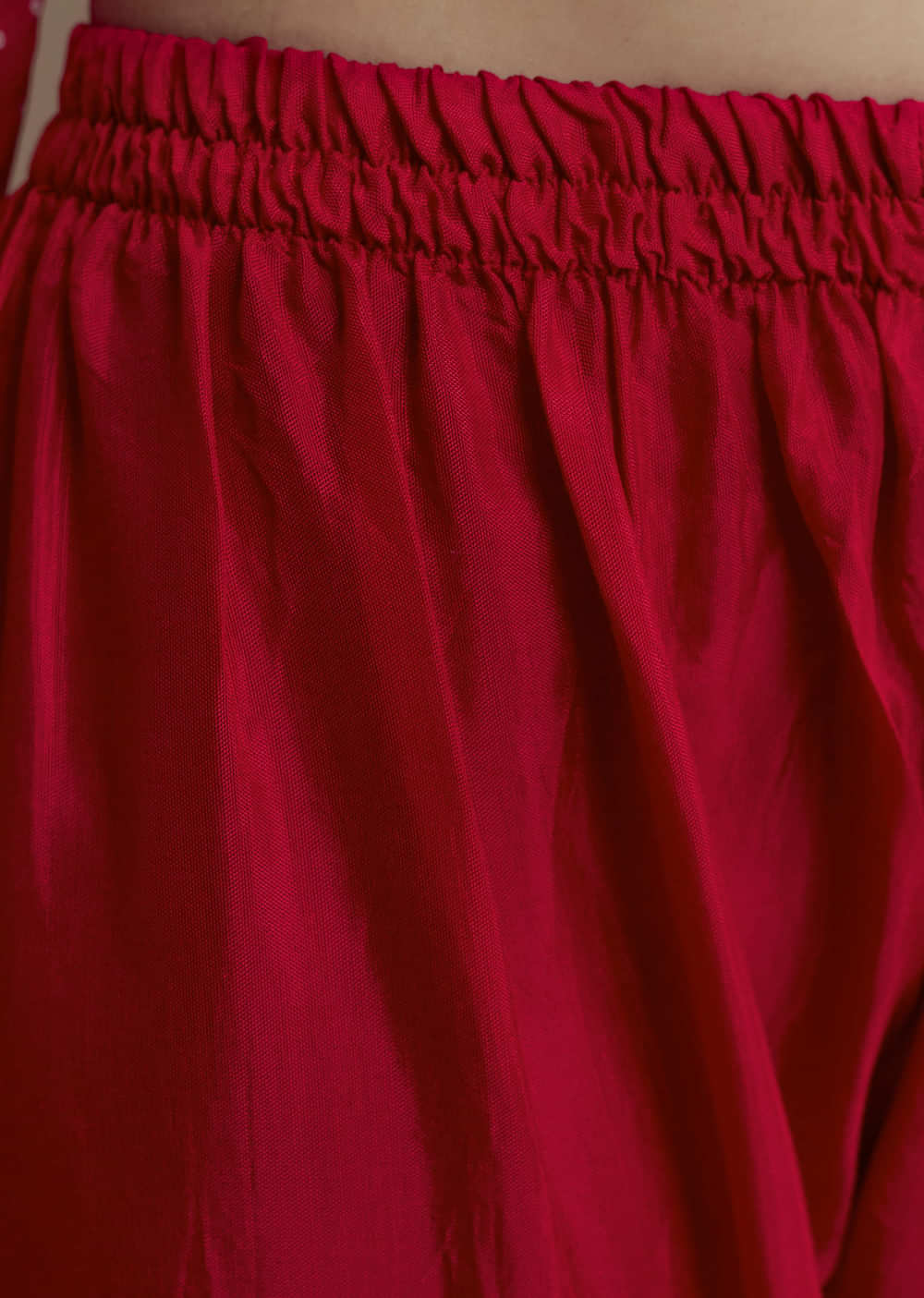 Infuse festive charm into your wardrobe with this elegant red silk kurta set, showcasing a harmonious blend of bandhani prints and subtle sheen. Embellished with delicate zari accents, the ensemble... More Product Details