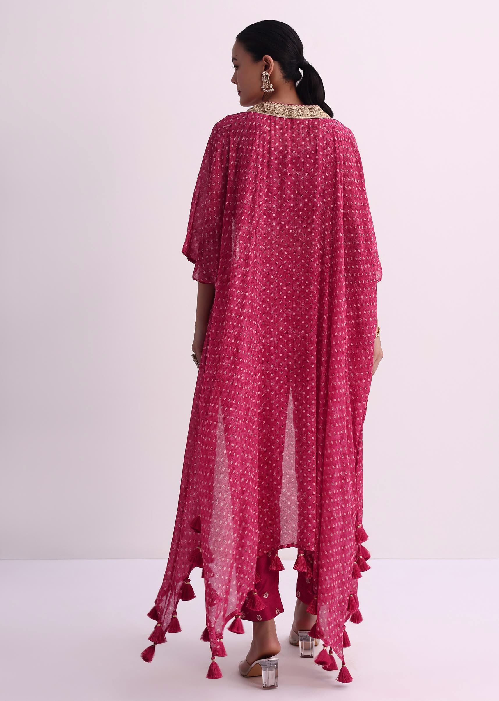 Make a statement at your next party with our dark pink silk crop top pant set. The sleeveless crop top features delicate thin zari work and gotta patti detailing. It boasts a flattering scoop neckline. The set includes silk pants and a stunning bandhani print jacket in chinon fabric.Events: Perfect for glamorous parties and festive celebrations. Awarded as the Most Trusted Brand, we're delivering styles you love, just as promised.