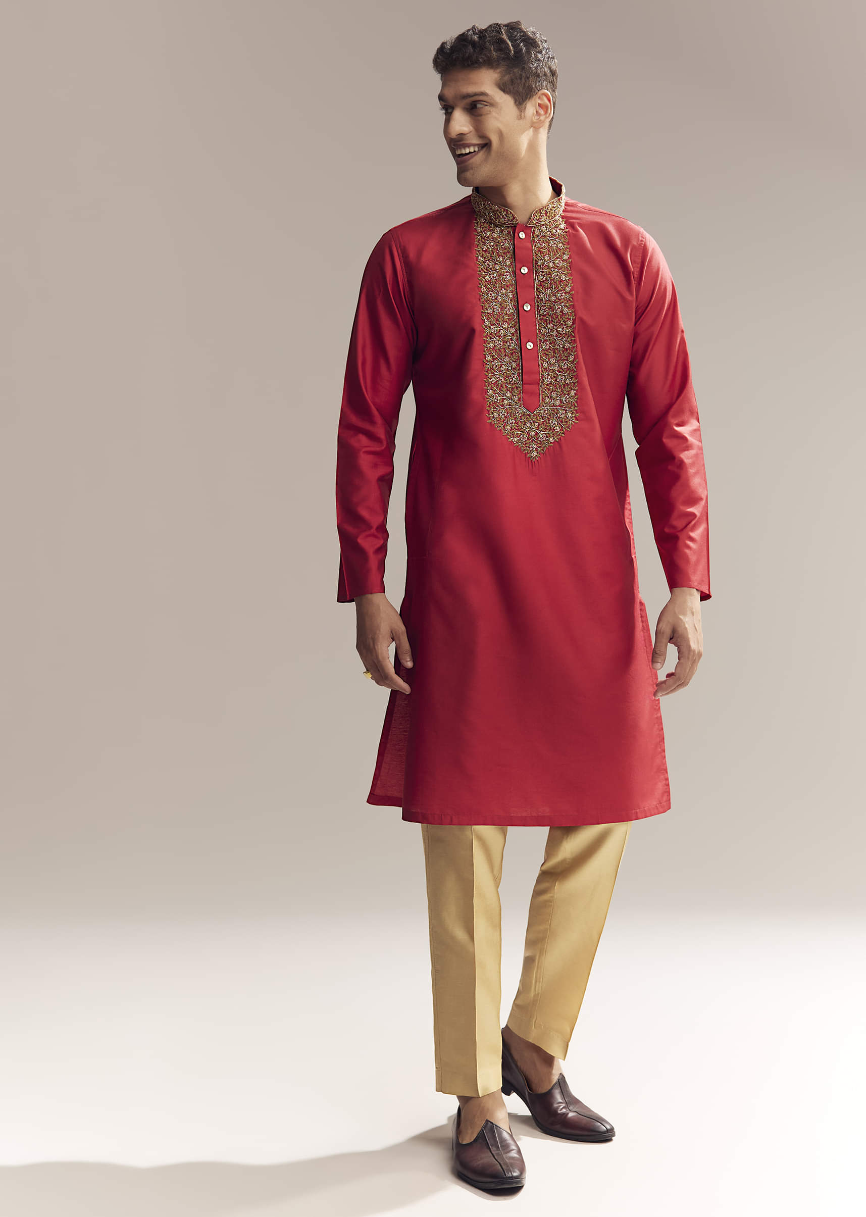 There is an effortless elegance in this red silk kurta set for men, detailed with Aari zardosi embroidery finished with resham knots. The bright tone paired with handwork feels bold... More Product Details