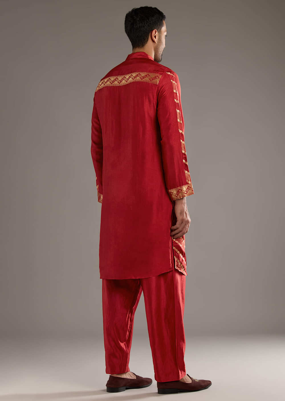 Red Silk Kurta Set For Men With Handwoven Jacquard Work