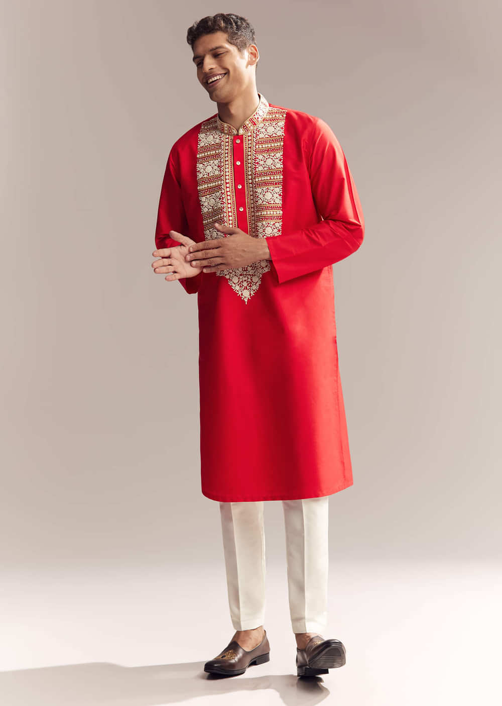 Festive nights feel more special with this red silk kurta set for men, showcasing Kashmiri handwork and delicate spring knots. The detail is fine without being over the top, giving... More Product Details