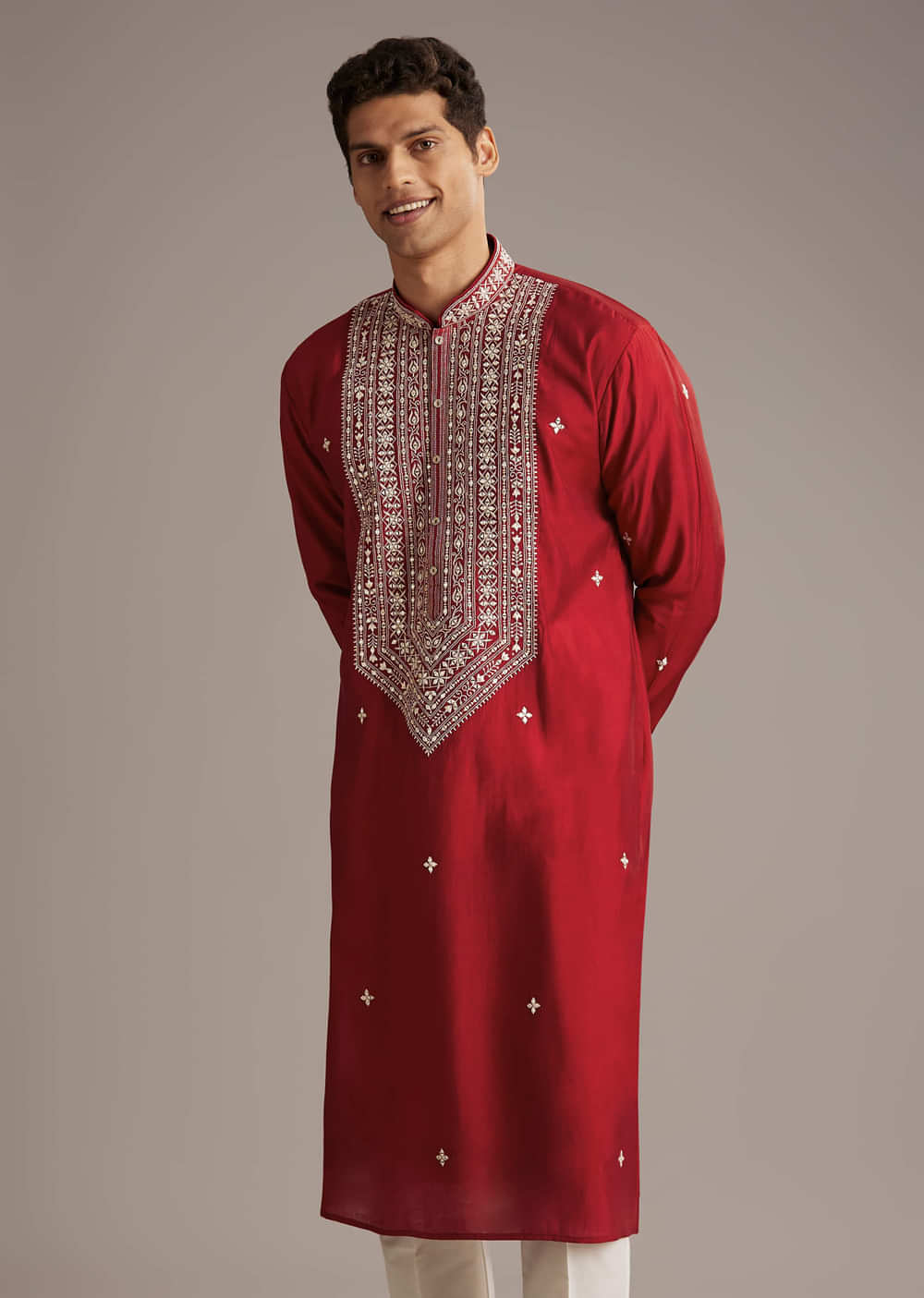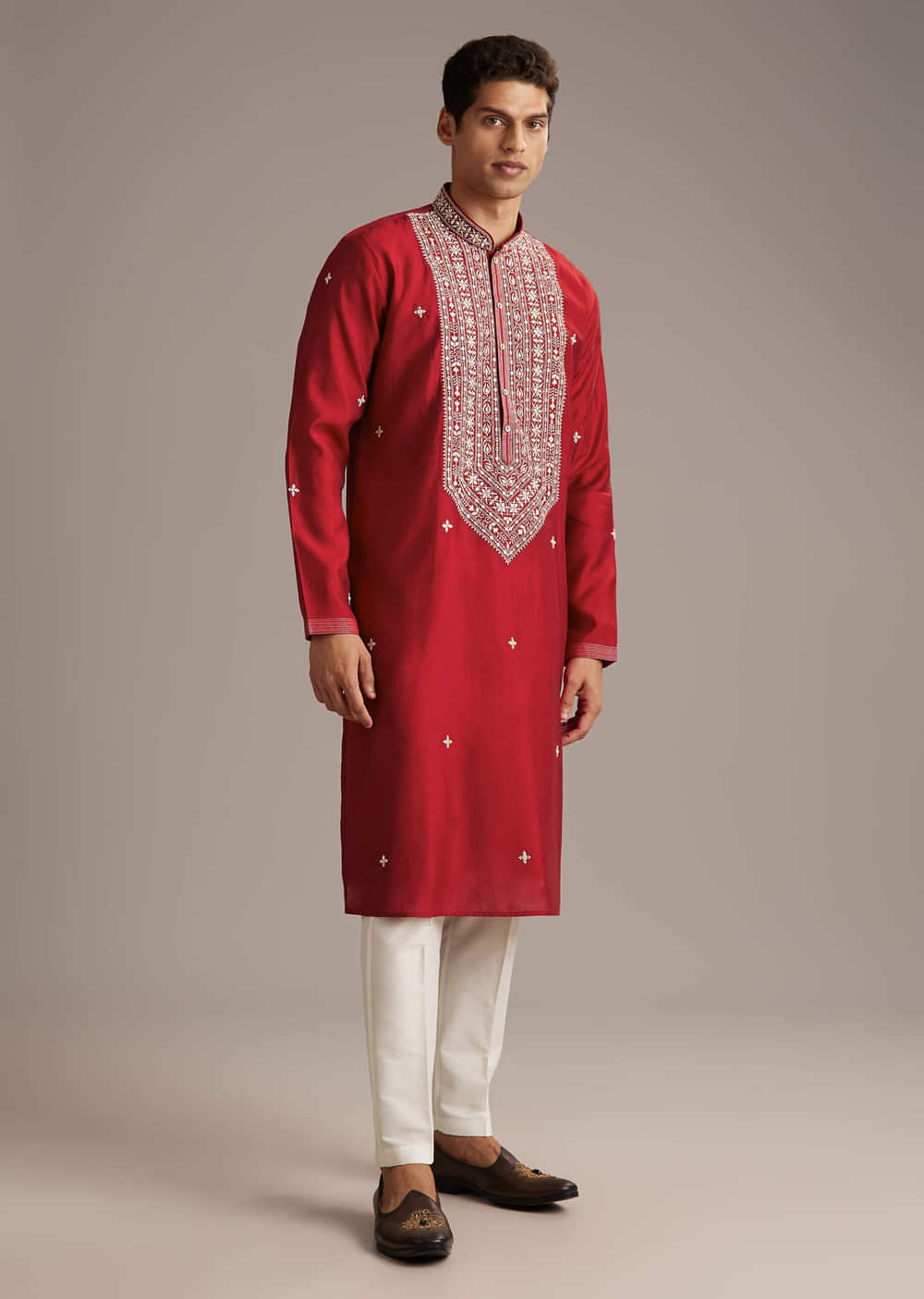 Red Silk Kurta Set For Men With Mirror And Thread Work