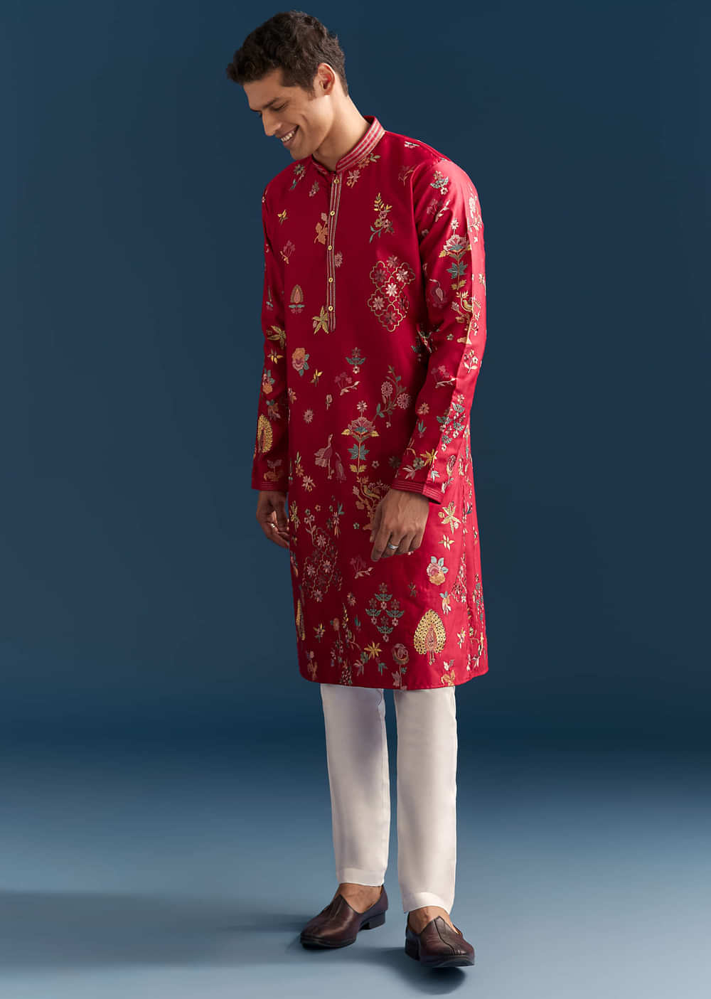 This red silk men's kurta set is embroidered with fine floral thread and Resham work that lends an artistic, textured depth to the look. Perfect for festive evenings, it brings just the right amount of richness without feeling heavy. Awarded as the Most Trusted Brand, we're delivering styles you love, just as promised.
