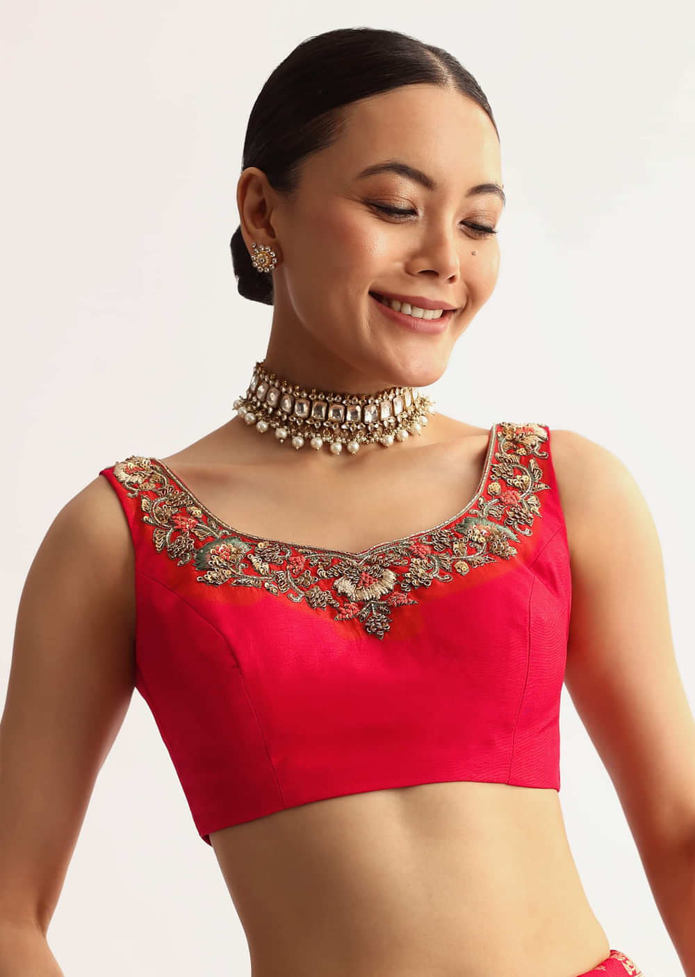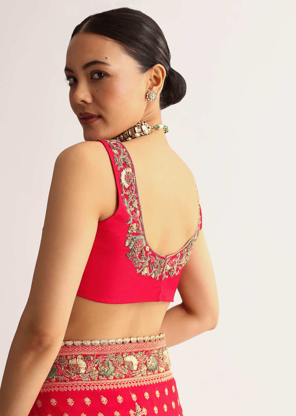 This red silk saree features a heavy embroidered border and pallu with sequins, zardosi, and resham thread work. Zari butti is woven all over the saree for an ornate appeal. The ensemble is completed with a richly embroidered blouse. Ideal for weddings or festive occasions. Awarded as the Most Trusted Brand, we're delivering styles you love, just as promised.