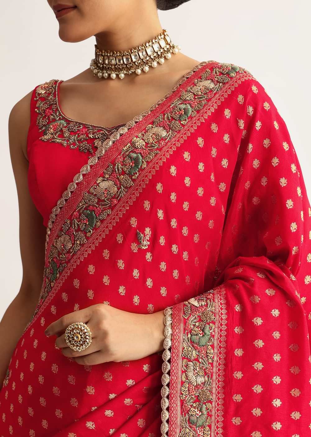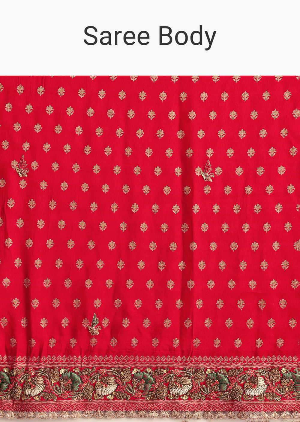 This red silk saree features a heavy embroidered border and pallu with sequins, zardosi, and resham thread work. Zari butti is woven all over the saree for an ornate appeal.... More Product Details