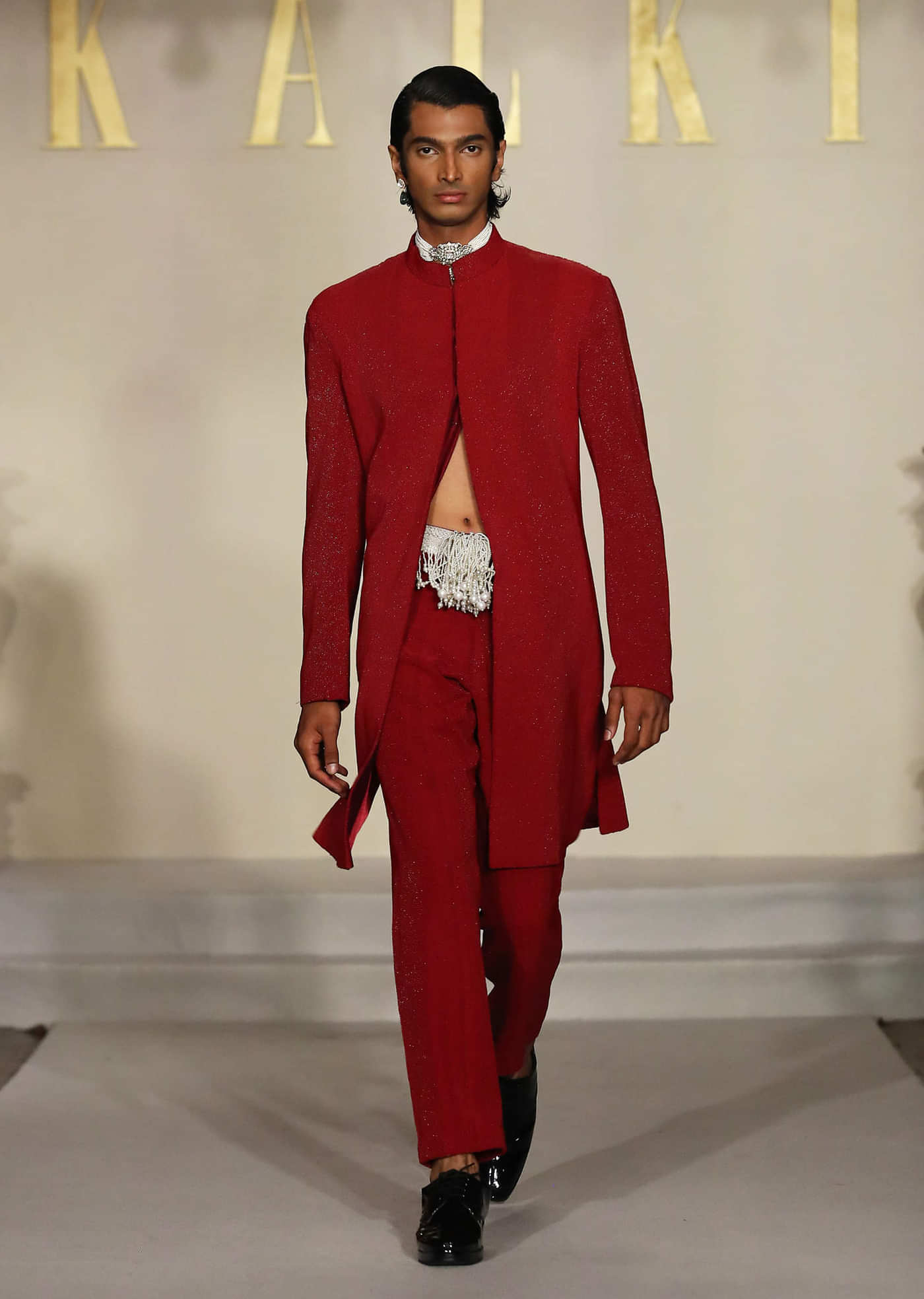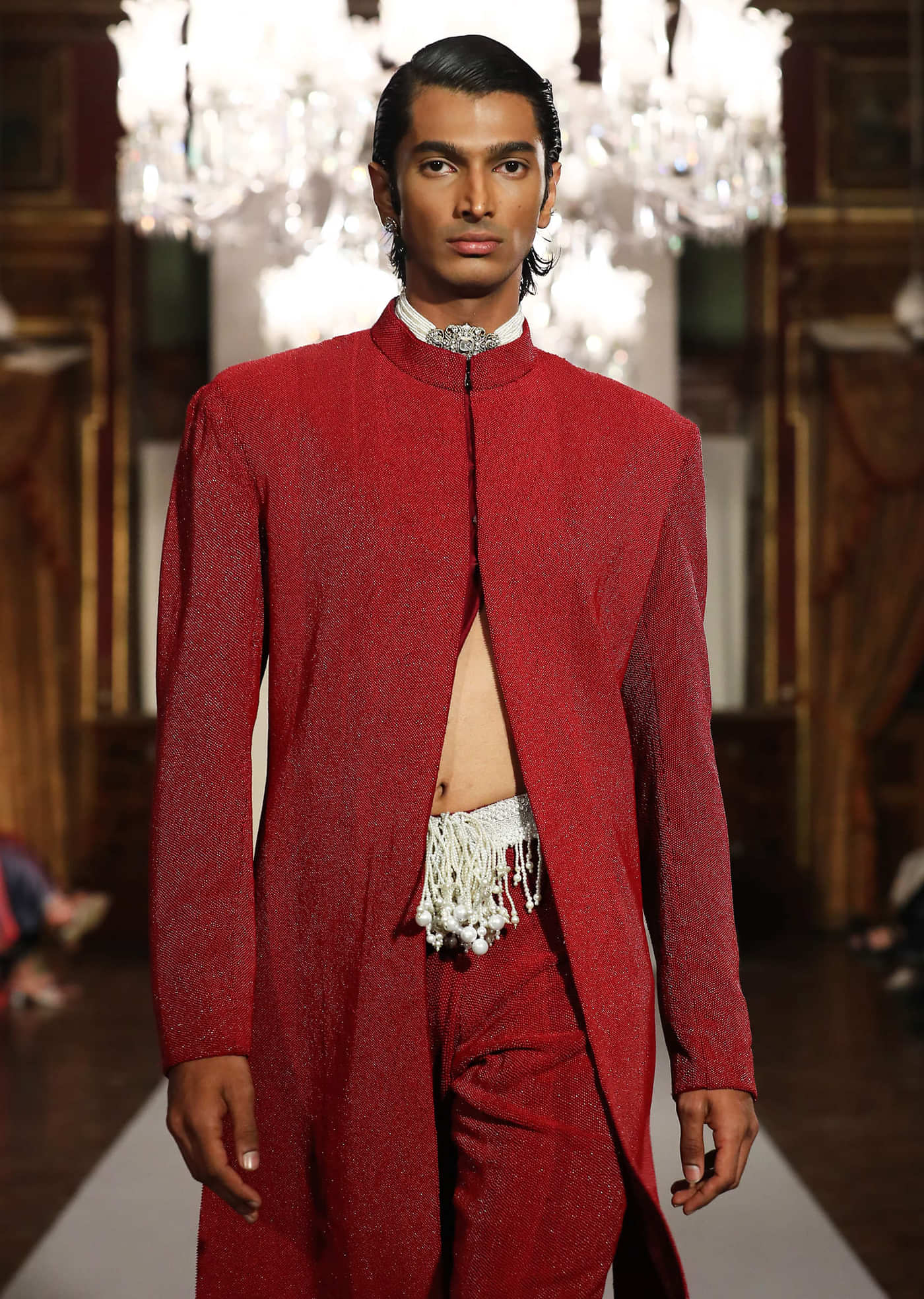 This red silk groom's sherwani creates an instant aura of royalty. Vertical bead and zari embroidery builds a rich, textured appeal across the fabric. The sherwani comes with tailored pants... More Product Details
