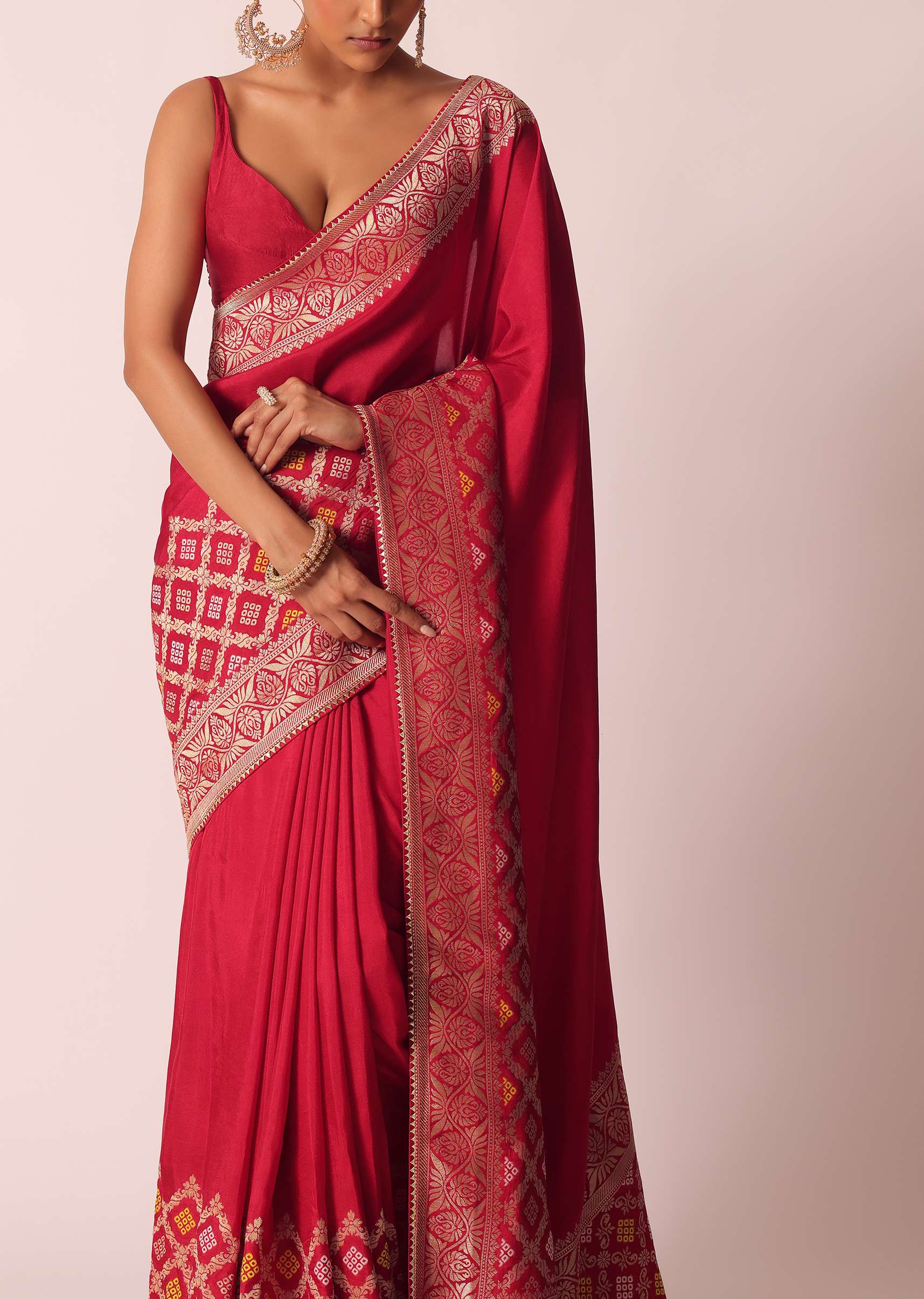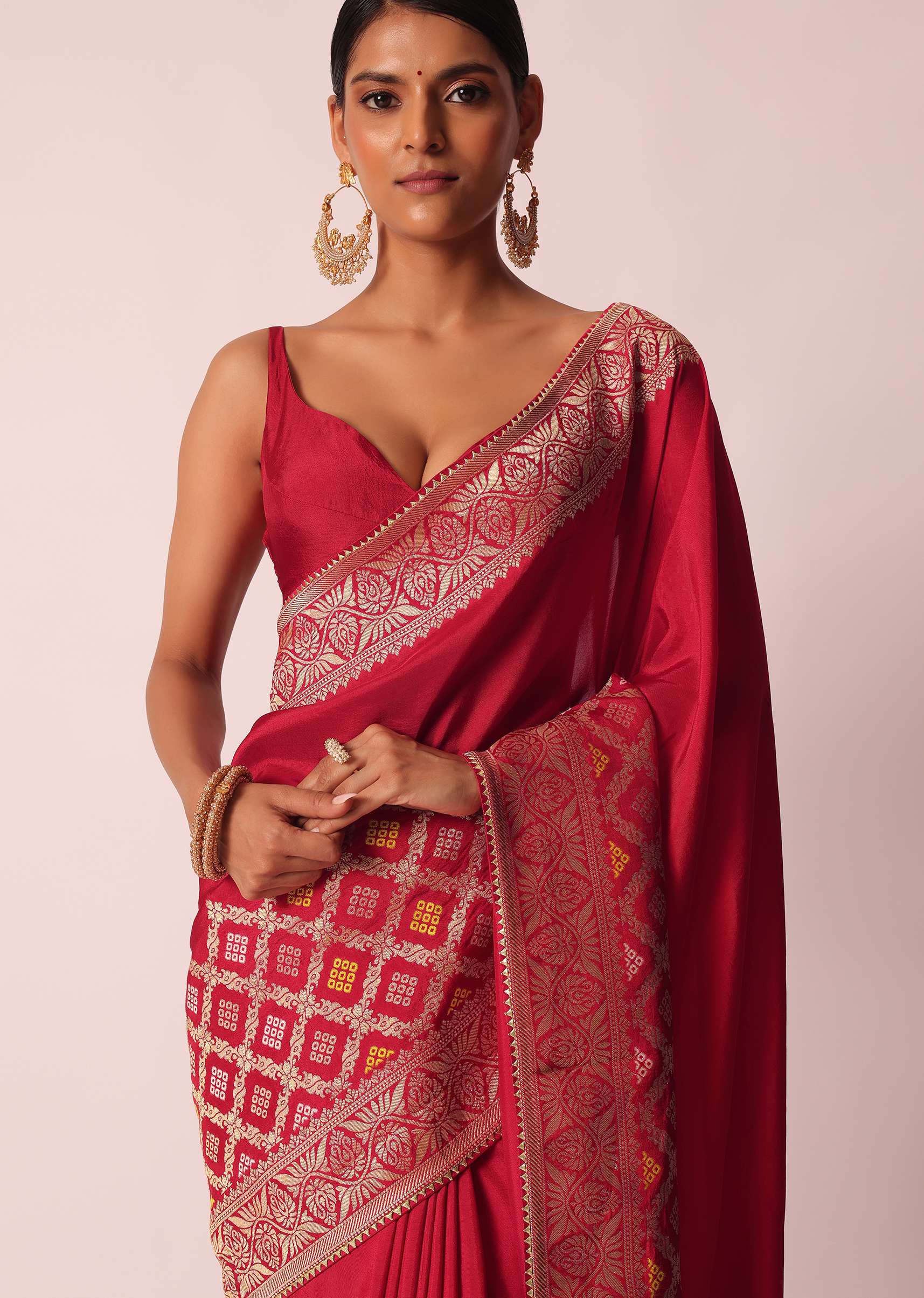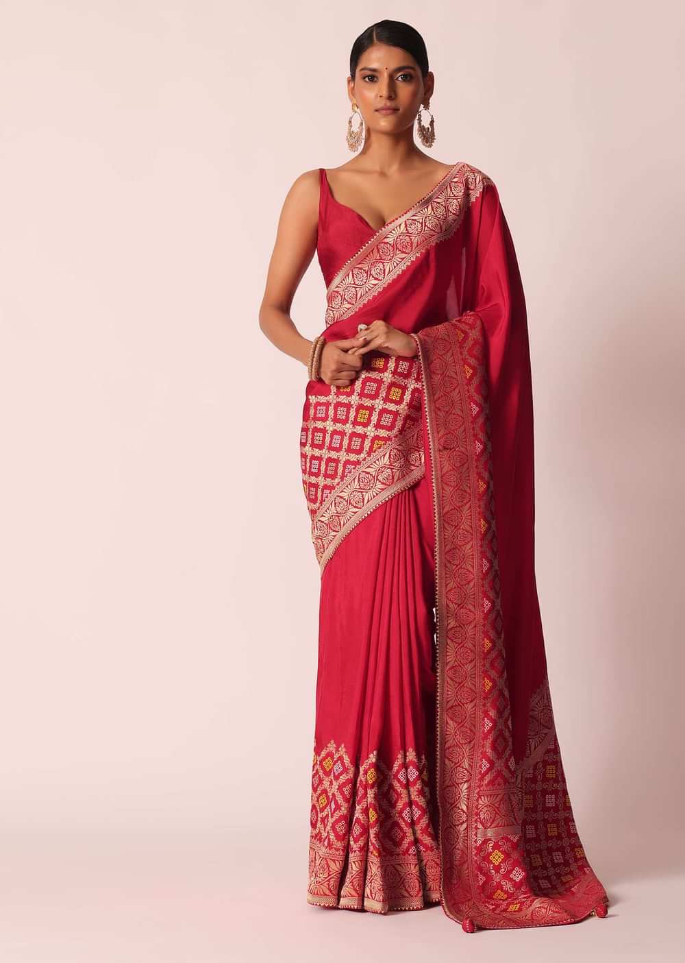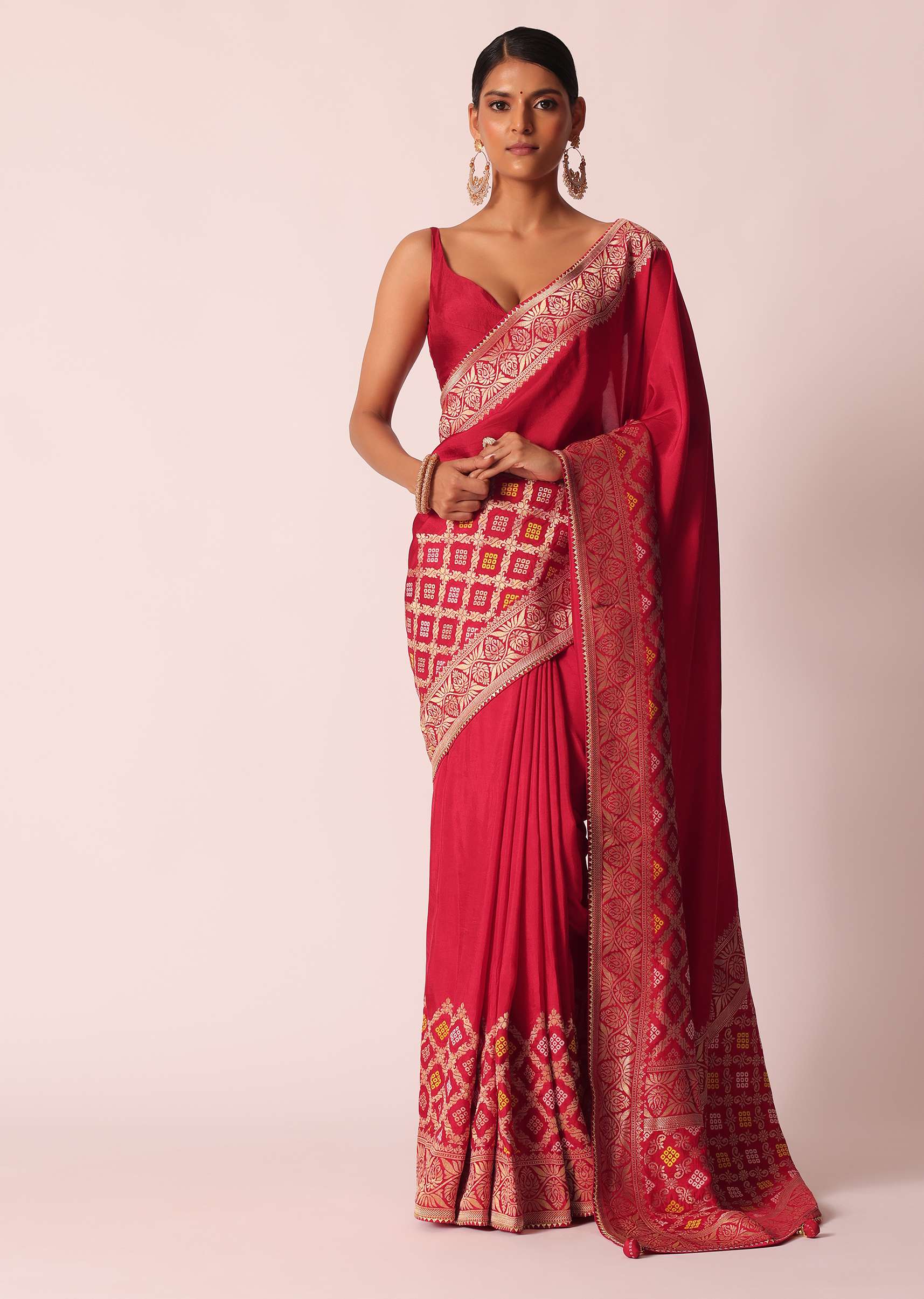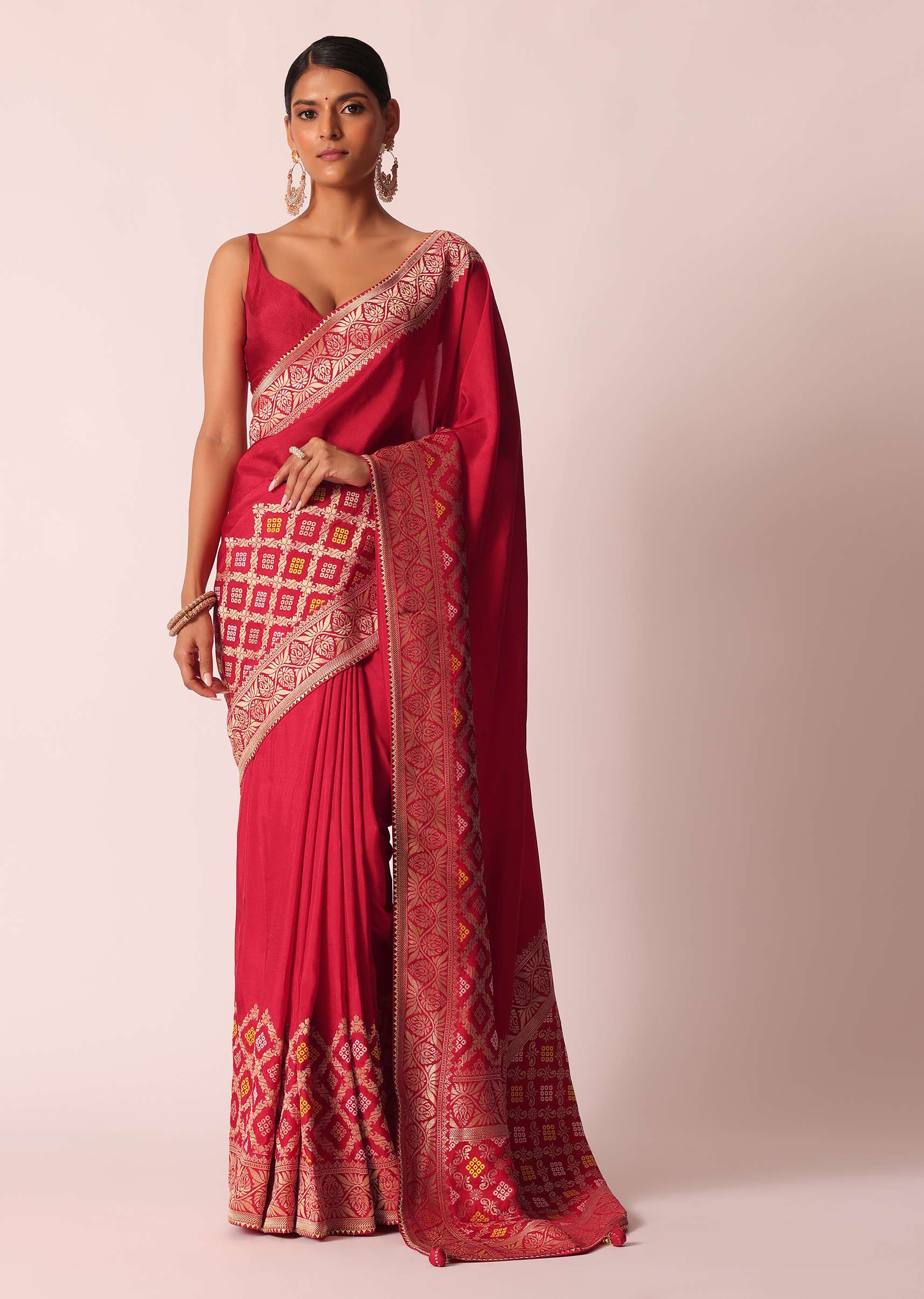 Designed to perfection, this saree will be your go- to for a picture- perfect ethnic look. Accentuated on a on a vibrant base, and decked with exemplary craftsmanship of Bandhani detailing and woven motifs. Decorated on a silk fabric, it is paired with an unstitched blouse piece. The perfect pick for housewarming Pooja's and social soirées, don this drape for endless compliments. Awarded As The Most Trusted Brand We'Re Delivering Styles You Love Just As Promised.