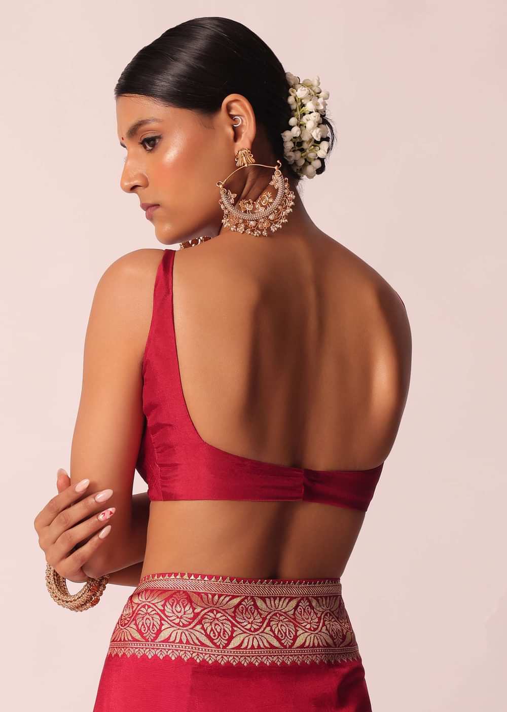 Infuse a dash of elegance by pairing it with gold-plated bangles and temple earrings.