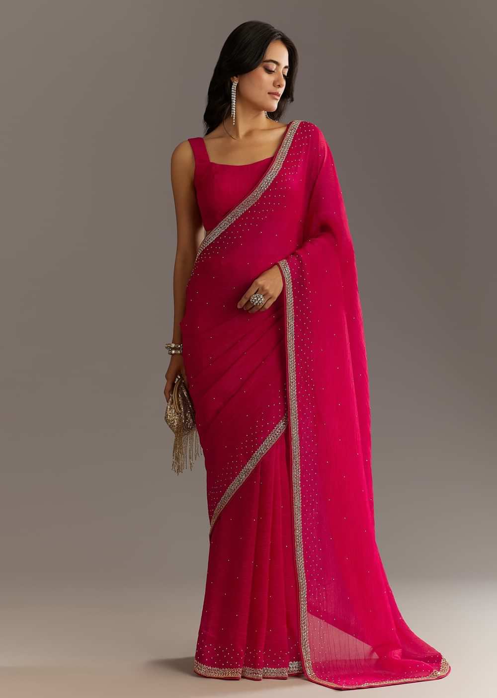 A spell of shimmer and stone this saree weaves enchantment through its crushed texture and glistening cutdanaedged border—made for starlit occasions.Awarded as the Most Trusted Brand we're delivering styles you love just as promised.