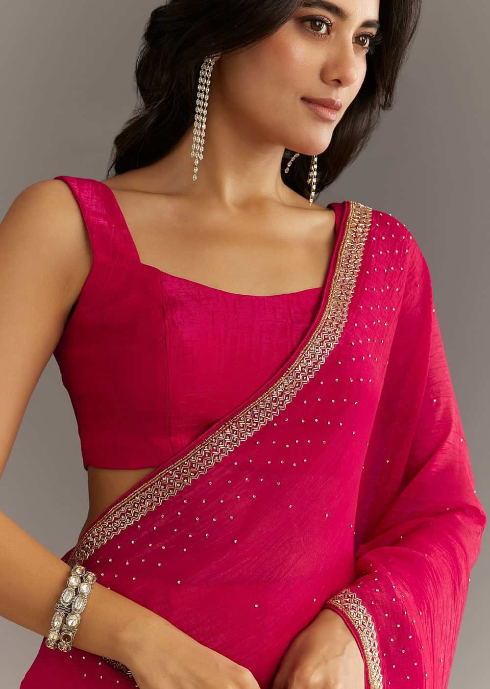 A spell of shimmer and stone this saree weaves enchantment through its crushed texture and glistening cutdanaedged border—made for starlit occasions.Awarded as the Most Trusted Brand we're delivering styles you... More Product Details