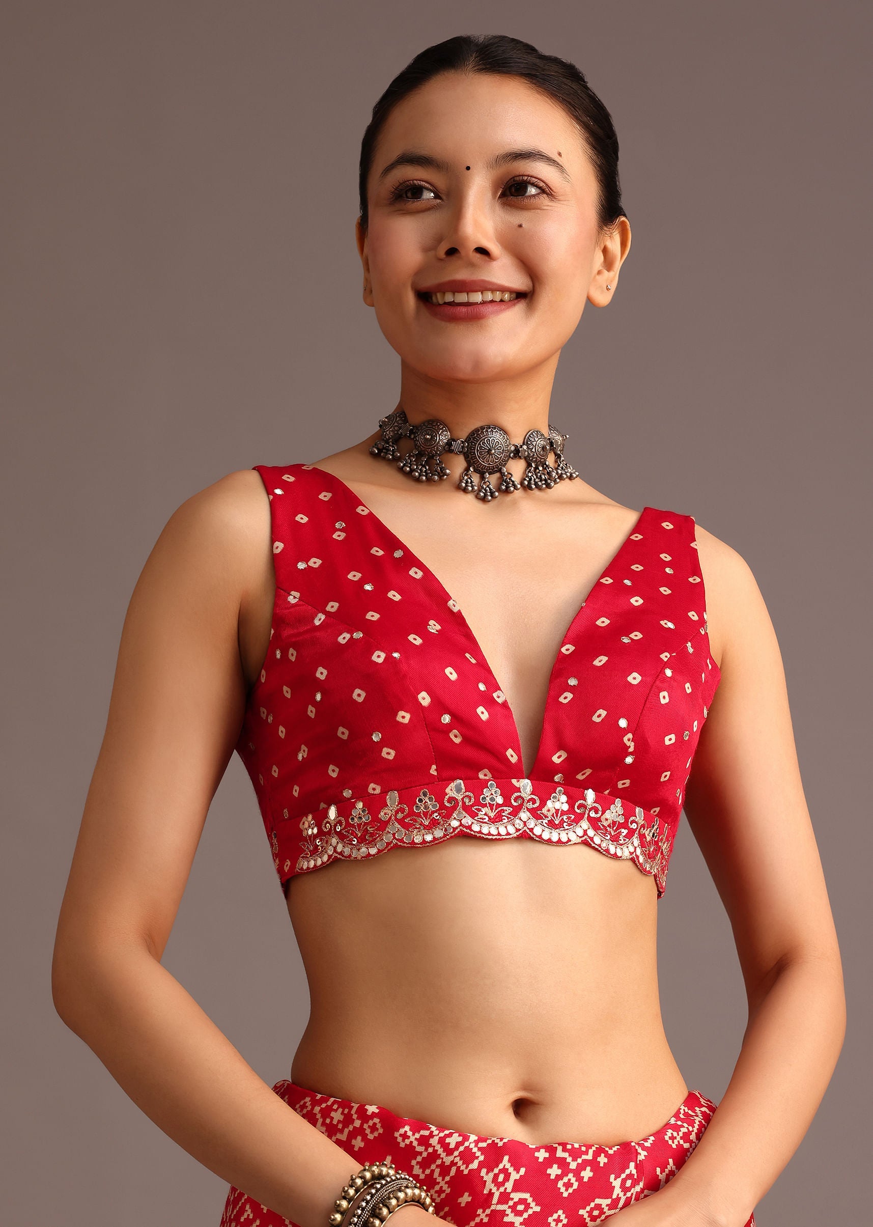 - The fabric features a vibrant Traditional Ajrakh print that reflects the rich cultural heritage, complemented by a mirror-embellished scallop border for added elegance.