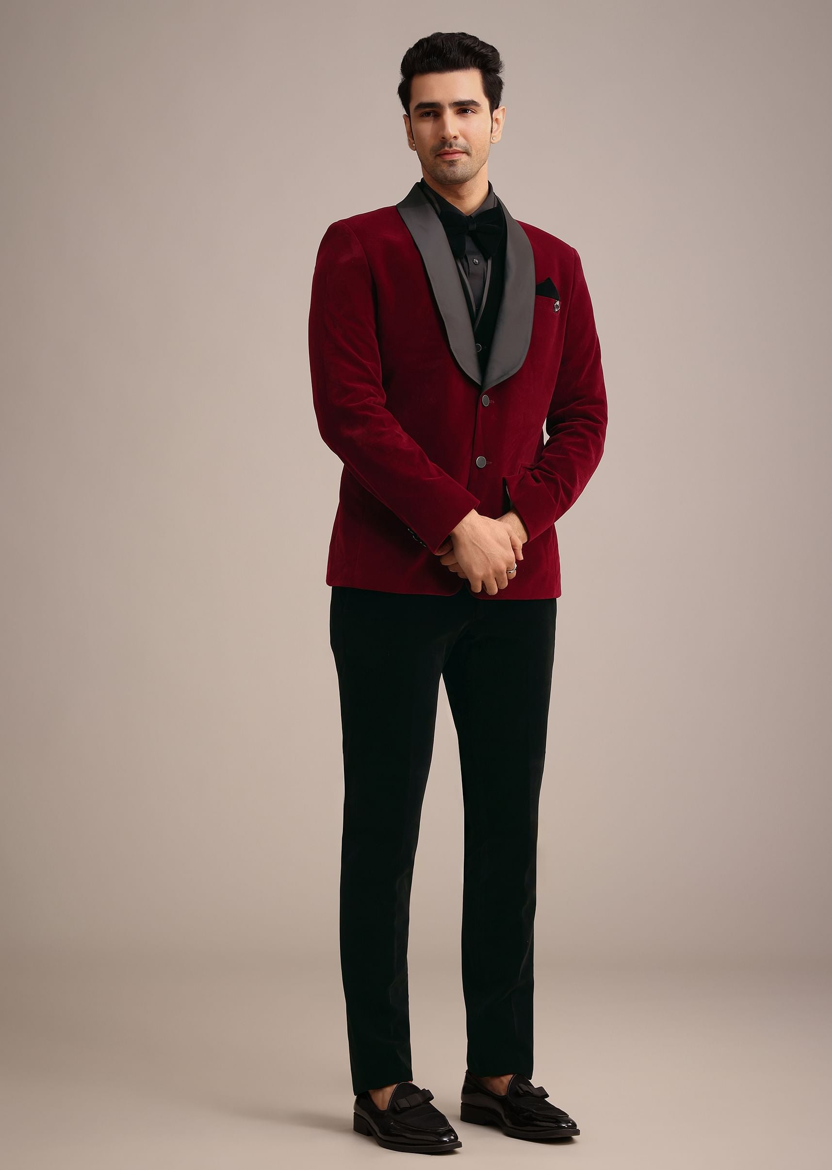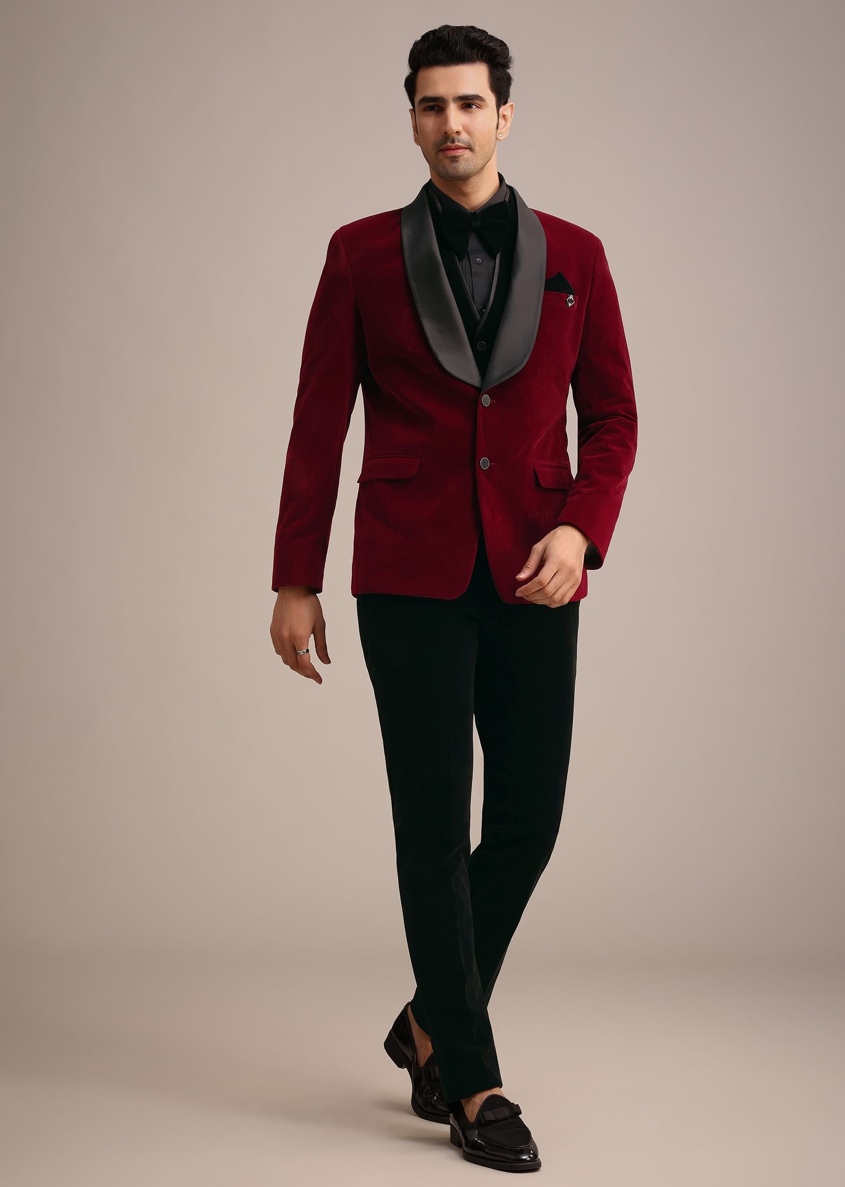 Step out donning this jewelled-tone red tuxedo set to exude opulence and glamour. The coat is expertly designed with a fancy shawl collar, front-buttons and full sleeves. Crafted on a rich micro velvet base, this striking fit is complemented with a shirt, waistcoat, pocket square, bow, trouser and co-ordinating trousers. A dazzling choice for grandeur occasions and cocktail parties. Awarded as the Most Trusted Brand, we're delivering styles you love, just as promised.
