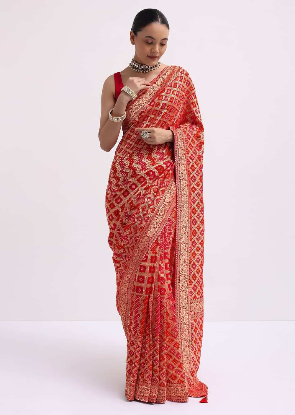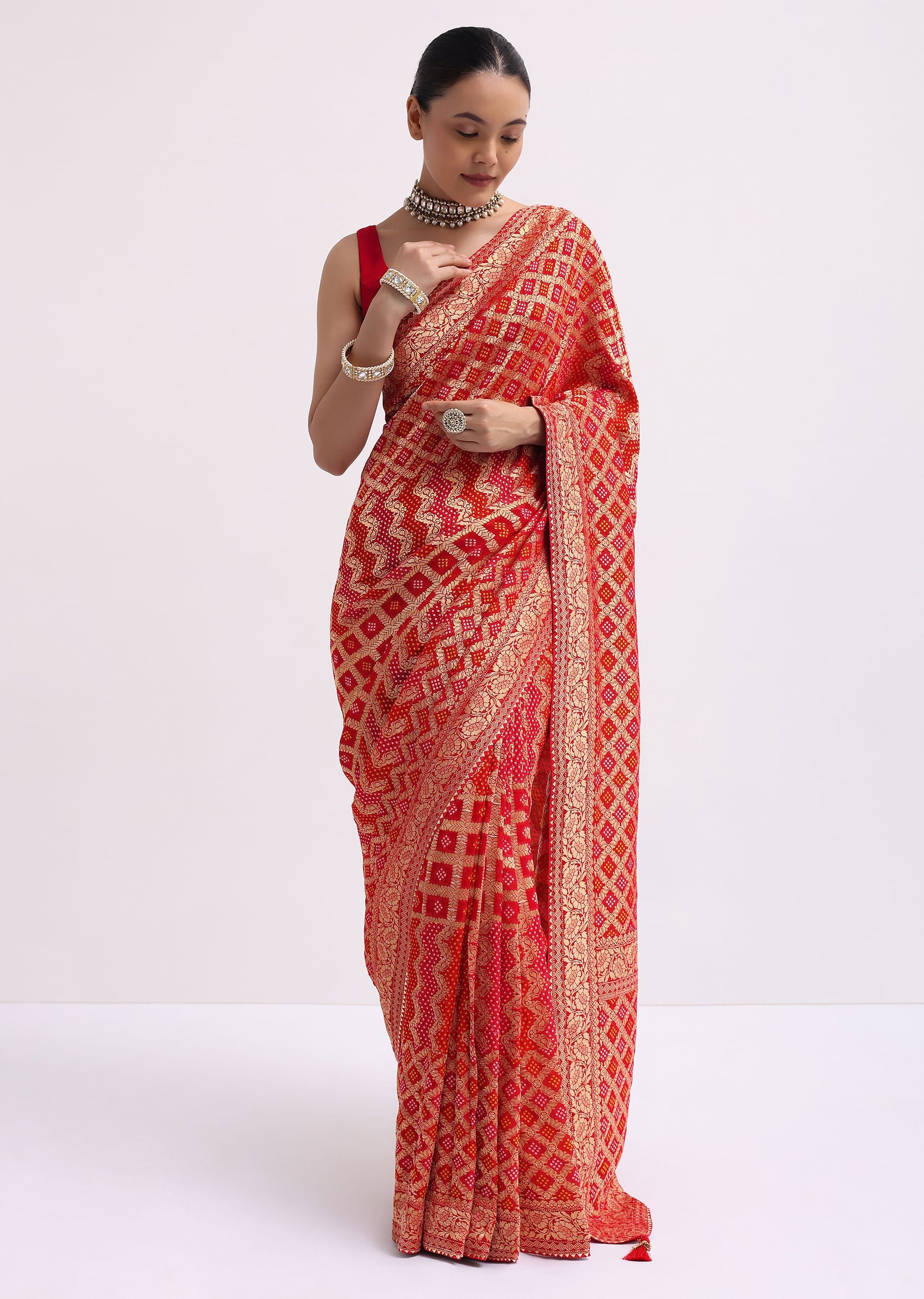 Immerse yourself in elegance with our exquisite red saree, meticulously crafted for festive occasions. Designed on a khadi georgette base, it features an intricate gharchola and jaal pattern bandhani throughout. Complete with an unstitched blouse, this ensemble epitomizes luxury and sophistication. Awarded as the Most Trusted Brand, we're delivering styles you love, just as promised.