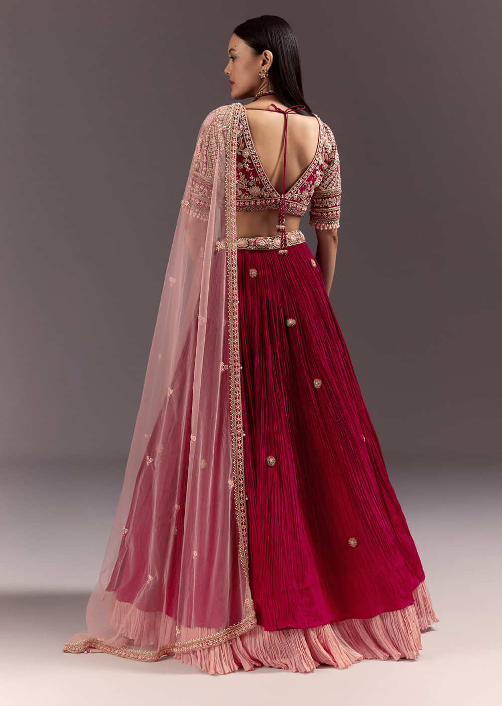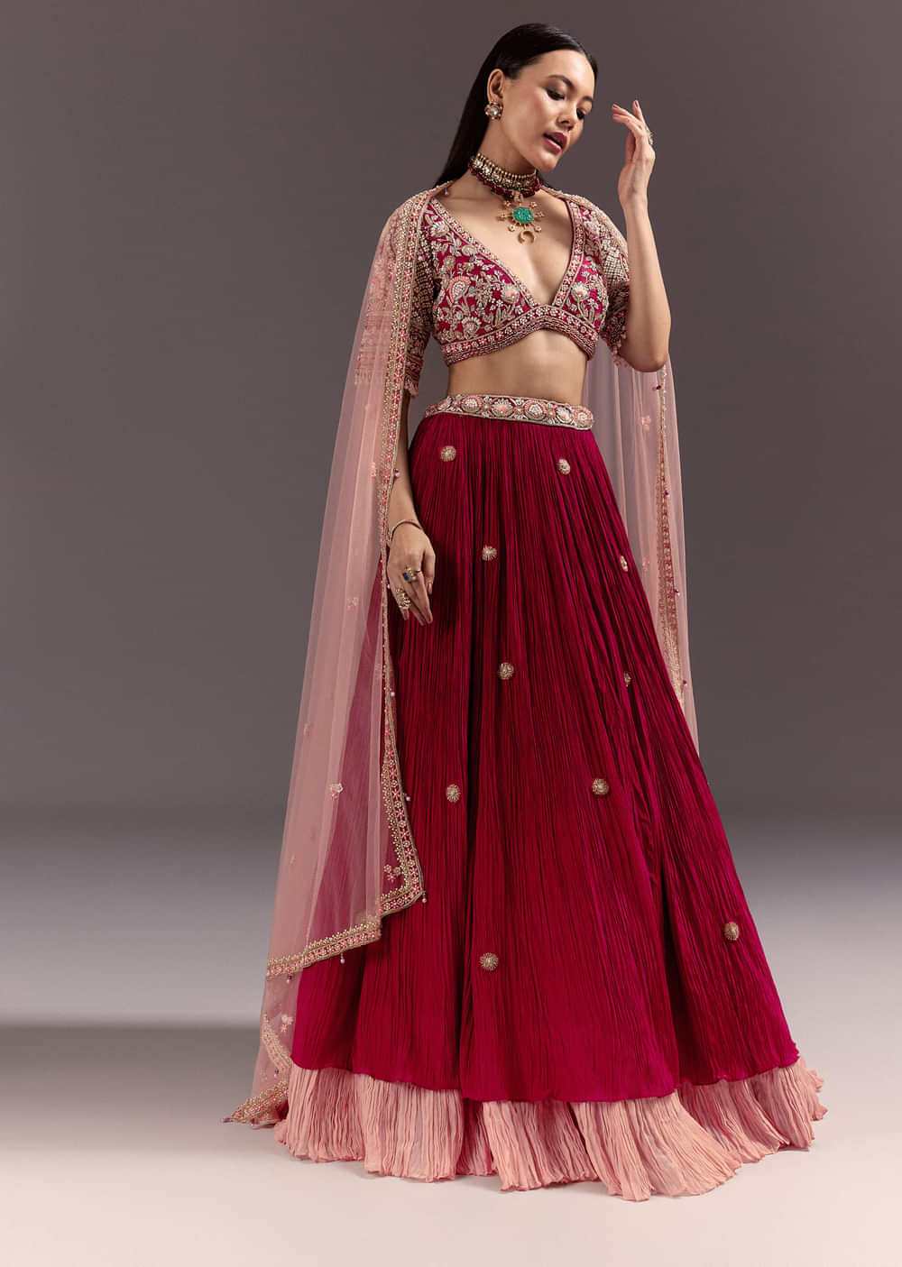 A blood-red lehenga alive with heavy zardosi and delicate Butti work.The blouse is richly crafted with regal embroidery and tassels. The dupatta border wraps the look in majestic detailing. Crafted to command attention at traditional weddings. Awarded as the Most Trusted Brand, we're delivering styles you love, just as promised.