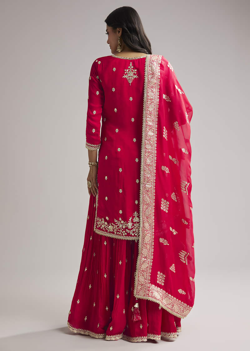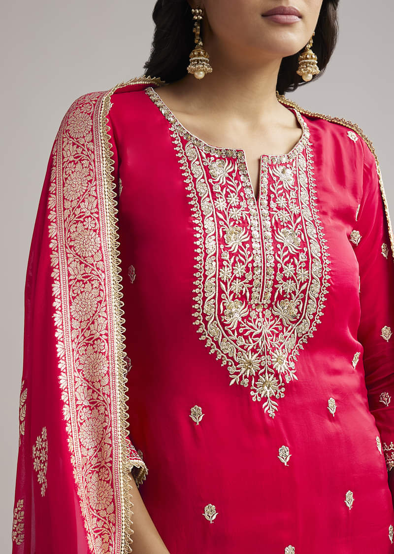 This radiant red palazzo set features intricate zari work on a flowing organza satin kurta, matched with straight palazzos and a graceful dupatta. The rich hue and delicate detailing are... More Product Details