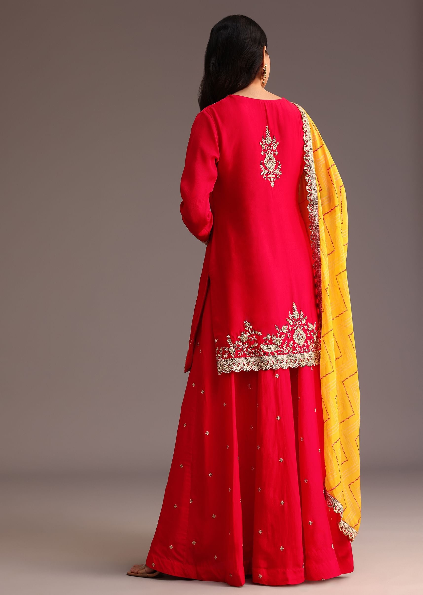 Red Zari Work Kurta Palazzo Suit With Organza Dupatta