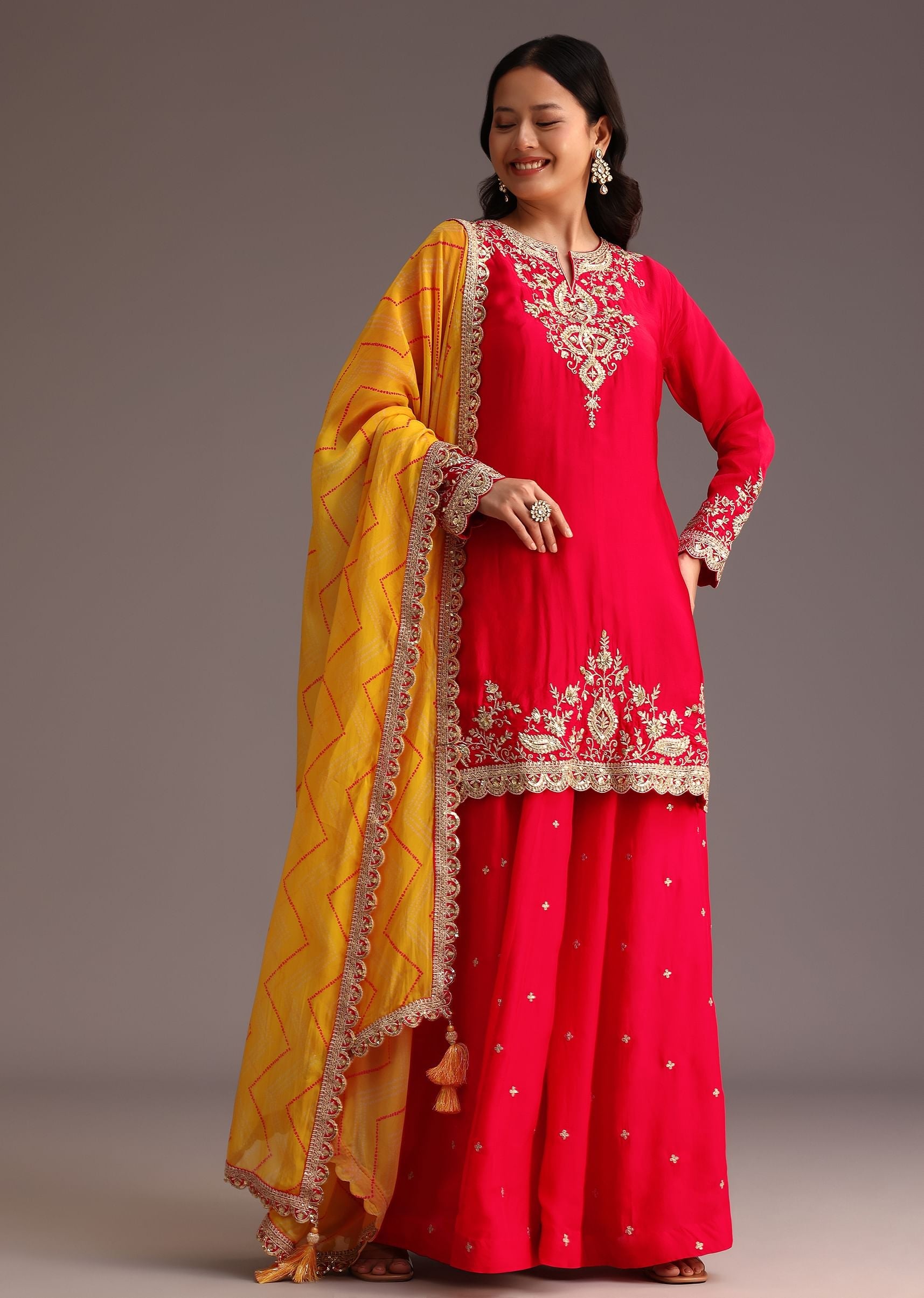 A delightful red kurta palazzo suit that dances with intricate zari work and sequins. The kurti features vibrant bandhani prints and exquisite zardosi embroidery. The palazzo pants showcase elaborate motifs... More Product Details