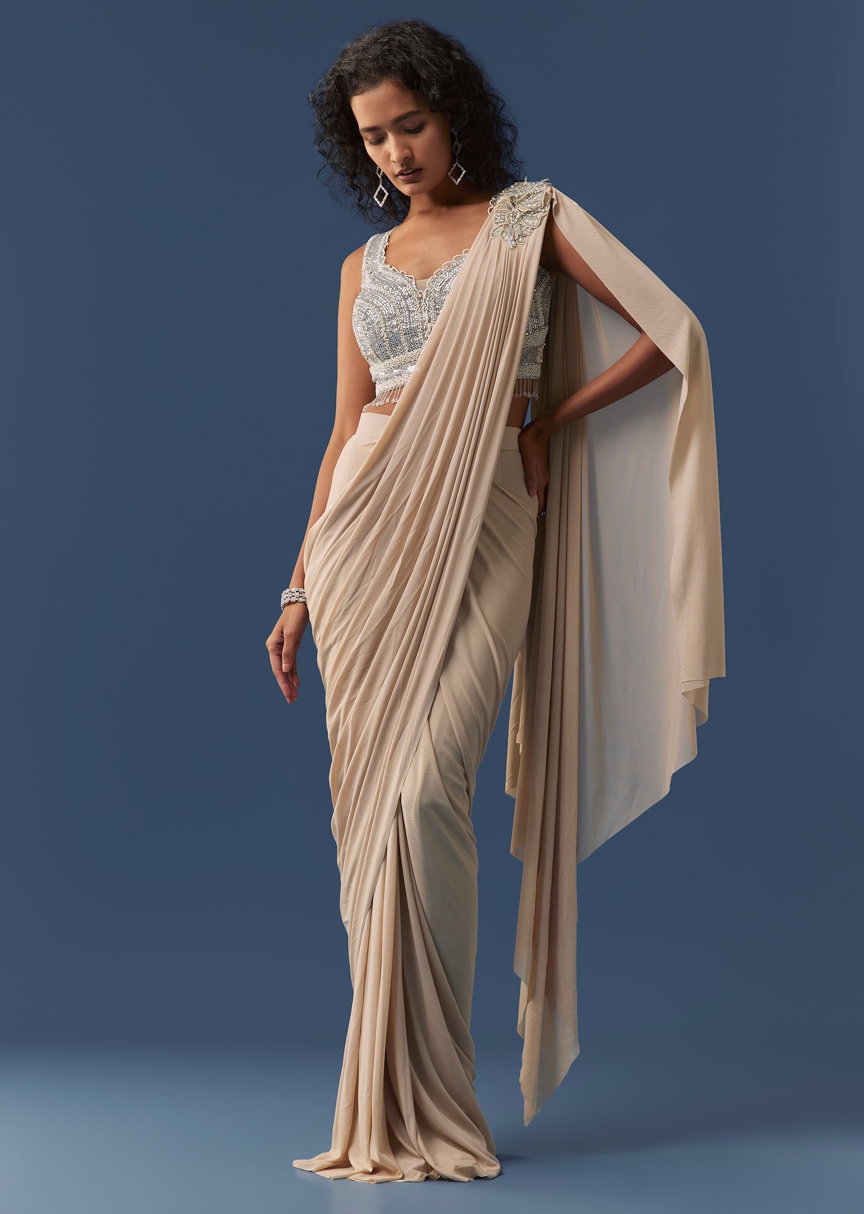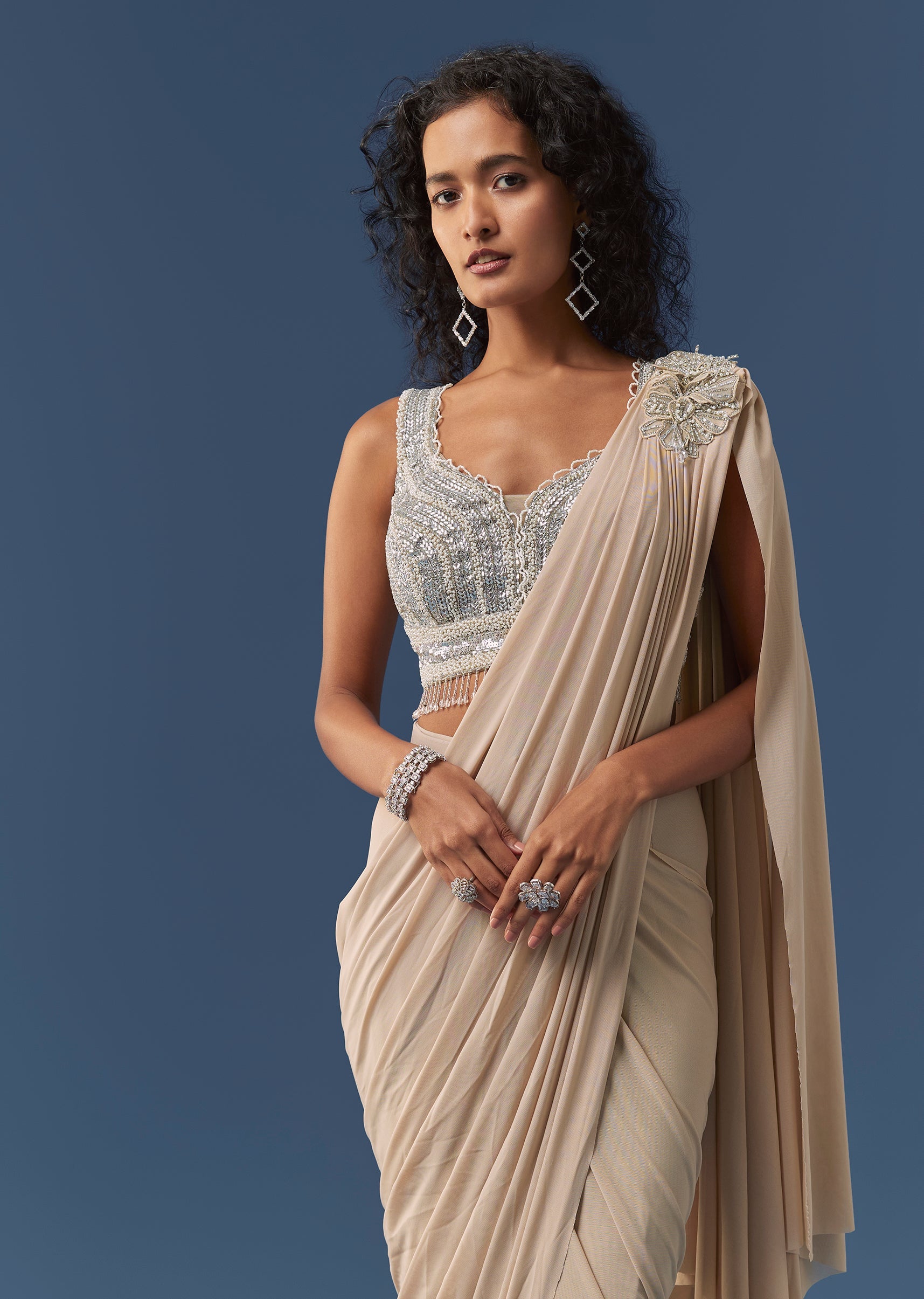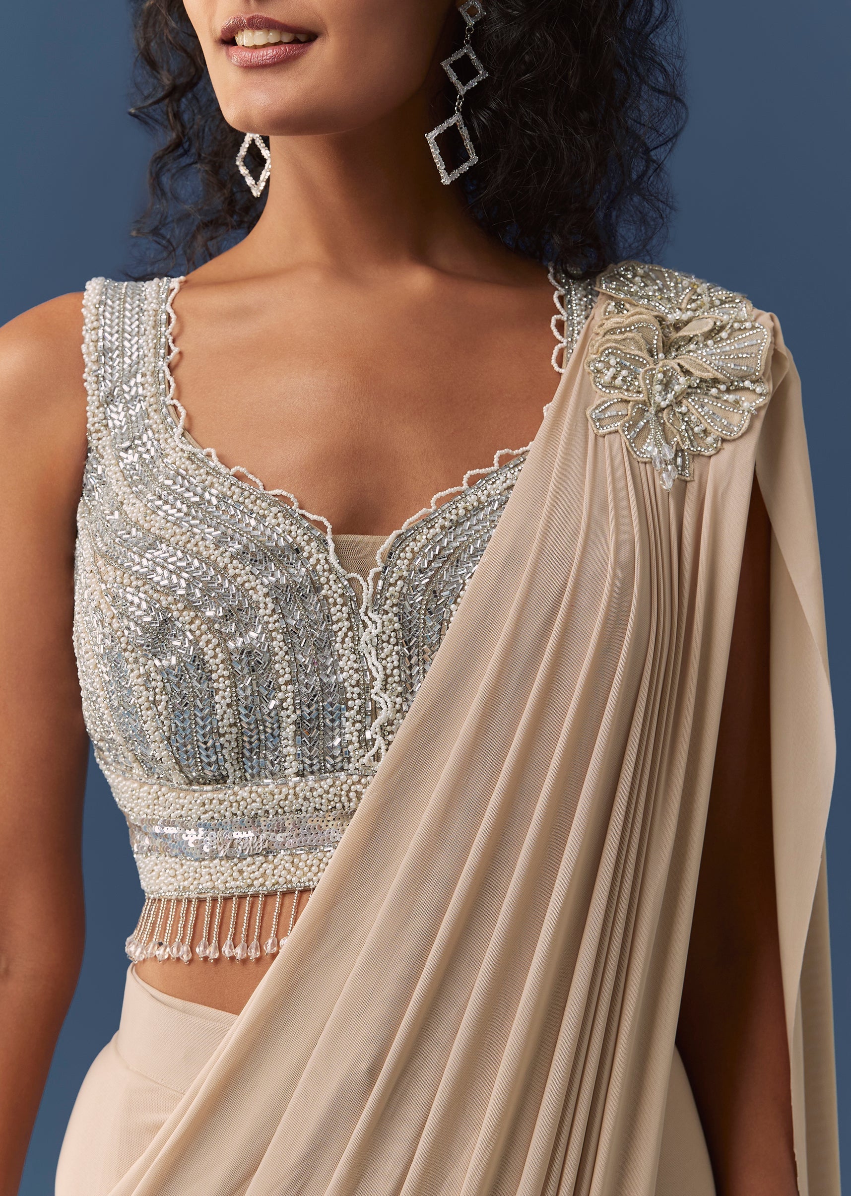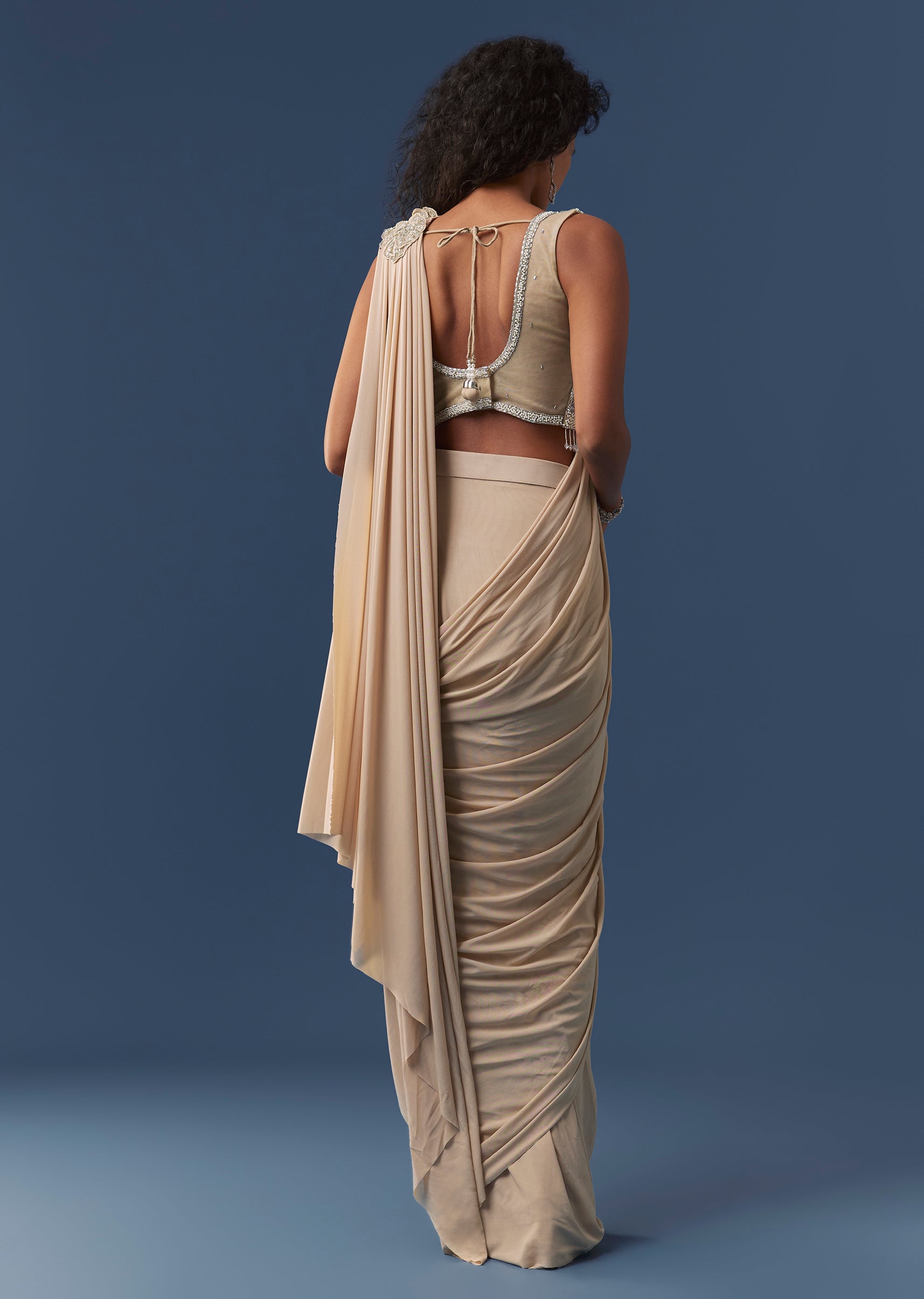 Rose Gold Pre-Draped Saree with Embellished Blouse