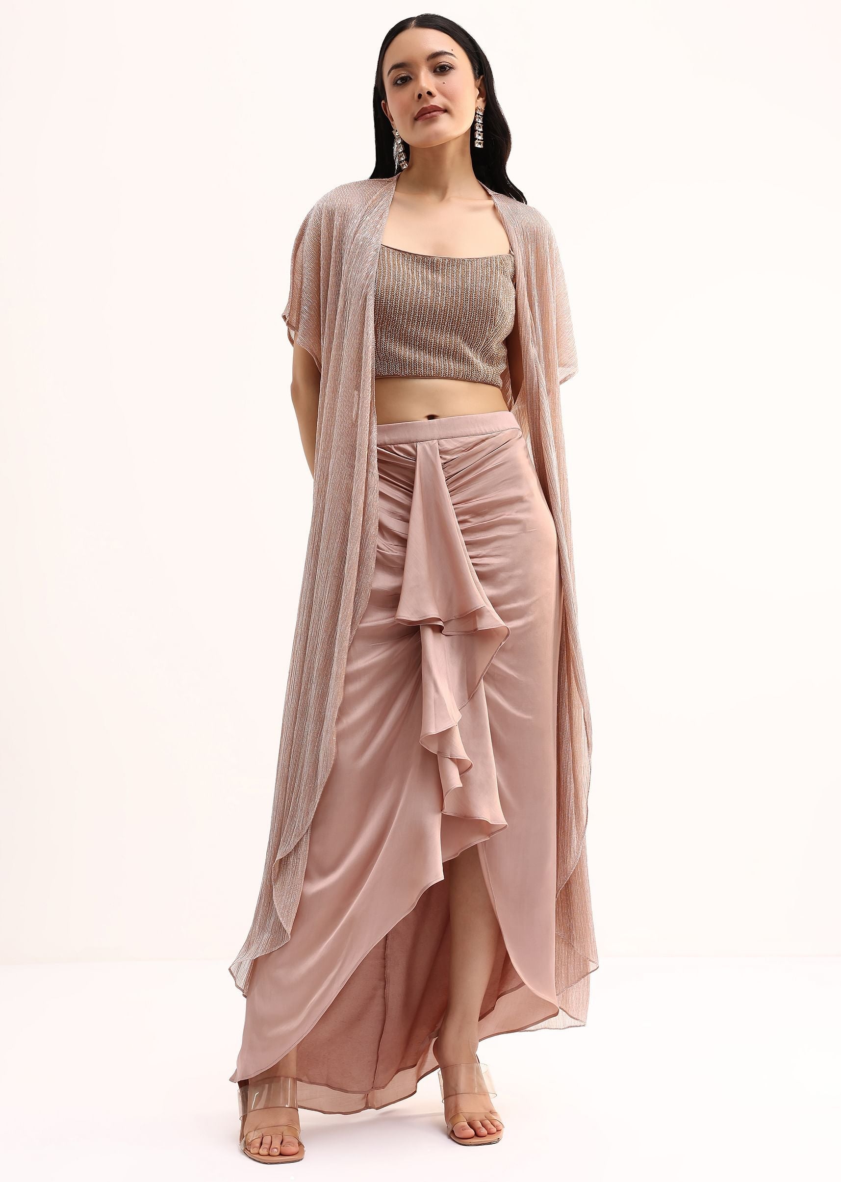 Be the vision in rose gold This luxuriously soft silk set features a chic crop top a flowy skirt and a statement jacket. Delicate stone embroidery shimmers alongside shimmering cut dana work catching the light with every move. Making this a perfect outfit for any glamorous occasion. The crop top comes with a skirt and a jacket. Awarded as the Most Trusted Brand, we're delivering styles you love, just as promised.