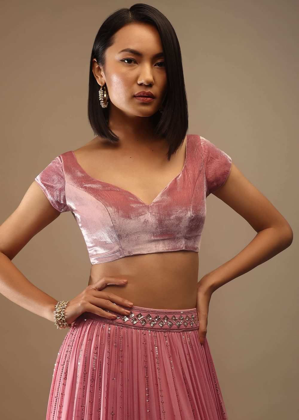 Rose Gold Velvet Blouse In Cap Sleeves With A Sweetheart Neckline Padded And A Back Hooks Closure
