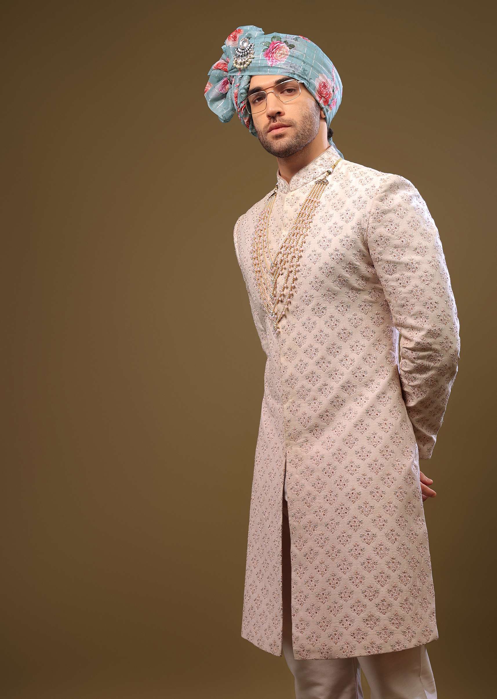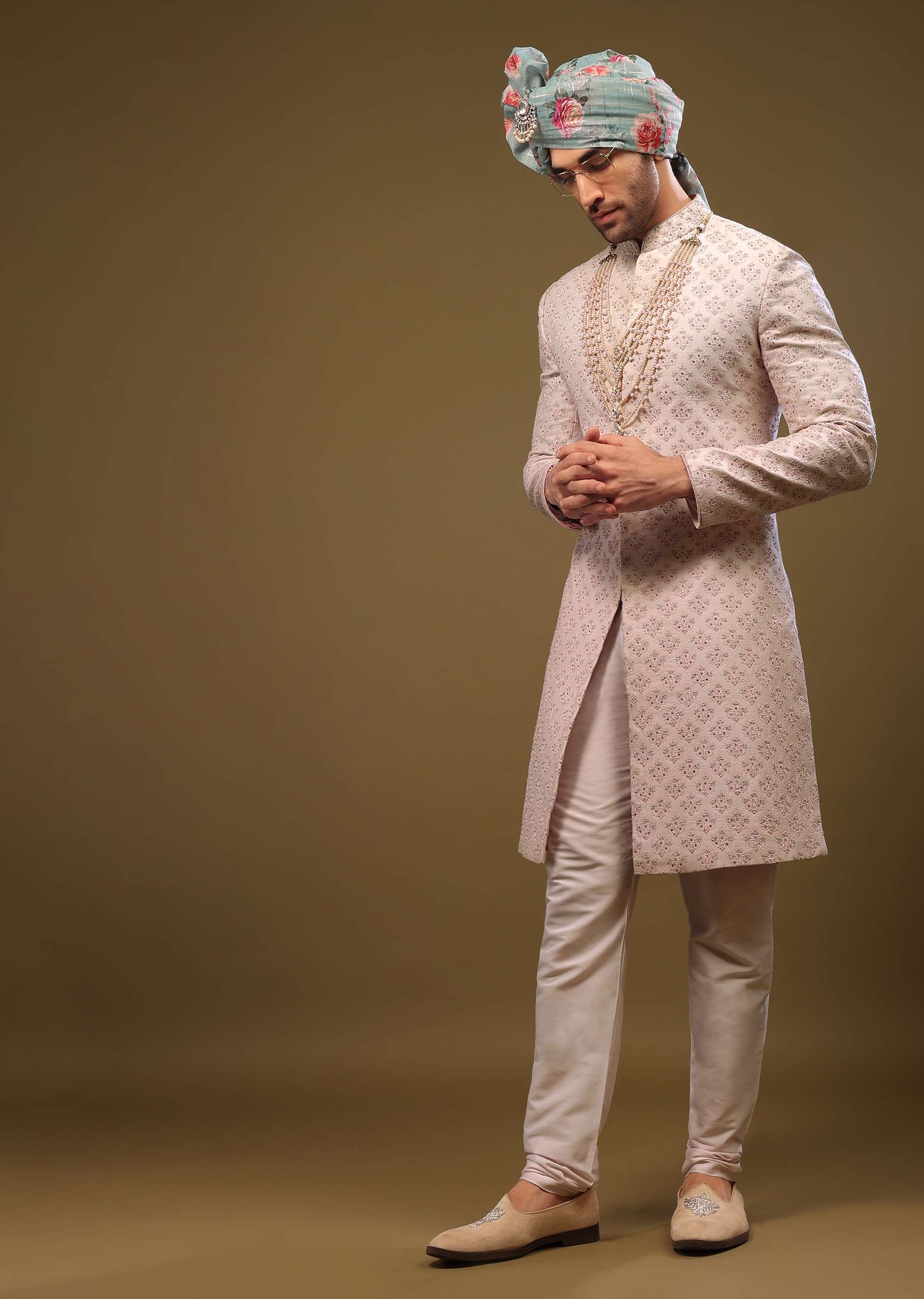 A classic rosewater pink lucknowi sherwani set, crafted in hand-embroidered zari, embellished stones, and thread weave in a beautiful design. It has full sleeves and an embroidered mandarin collar, a front closure, and comes with matching bottoms. NOTE - Mala is only used for styling purpose. Buttons and Accessories may vary in color, shape and size. Awarded as the Most Trusted Brand, we're delivering styles you love, just as promised.