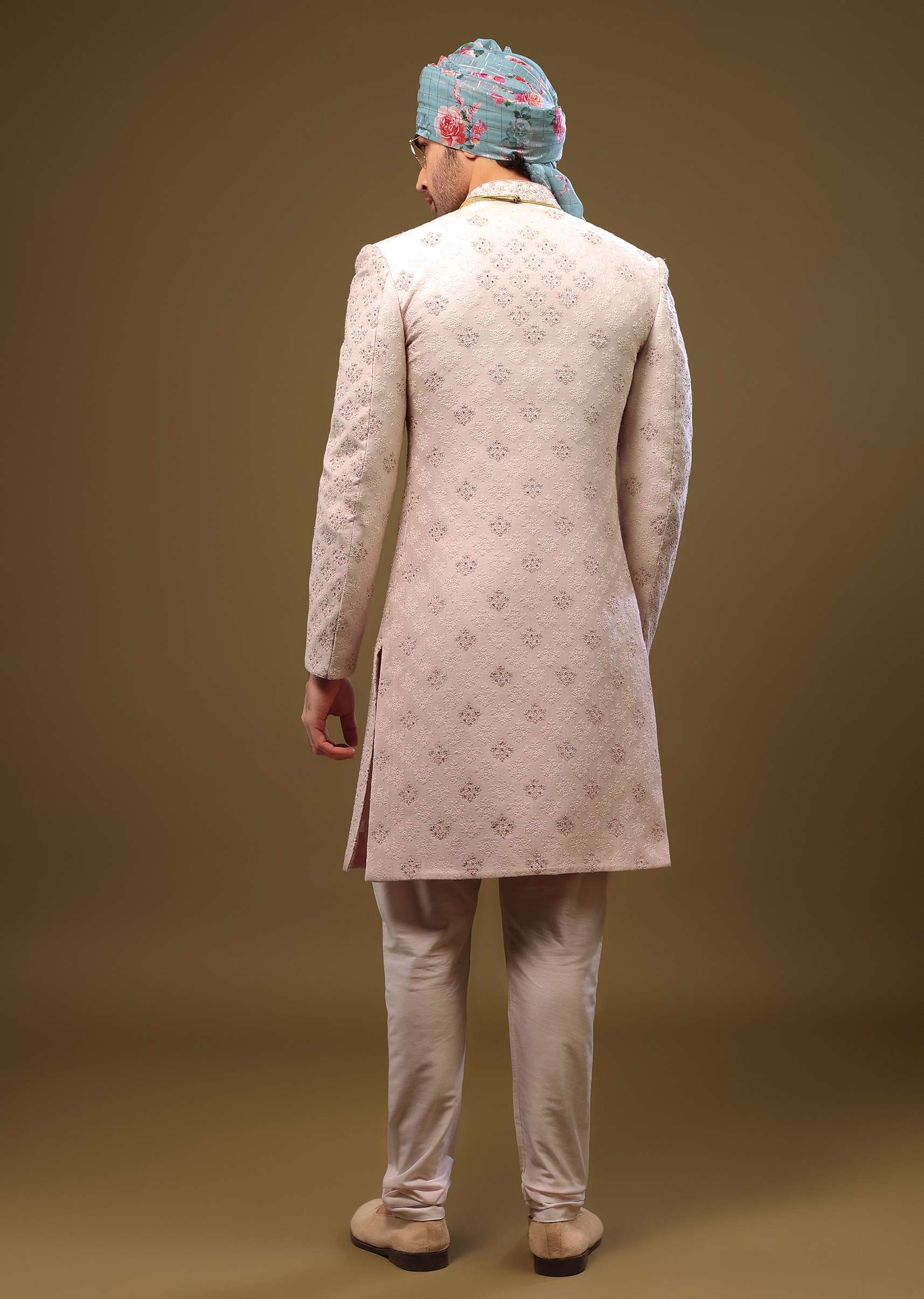 A classic rosewater pink lucknowi sherwani set, crafted in hand-embroidered zari, embellished stones, and thread weave in a beautiful design. It has full sleeves and an embroidered mandarin collar, a... More Product Details