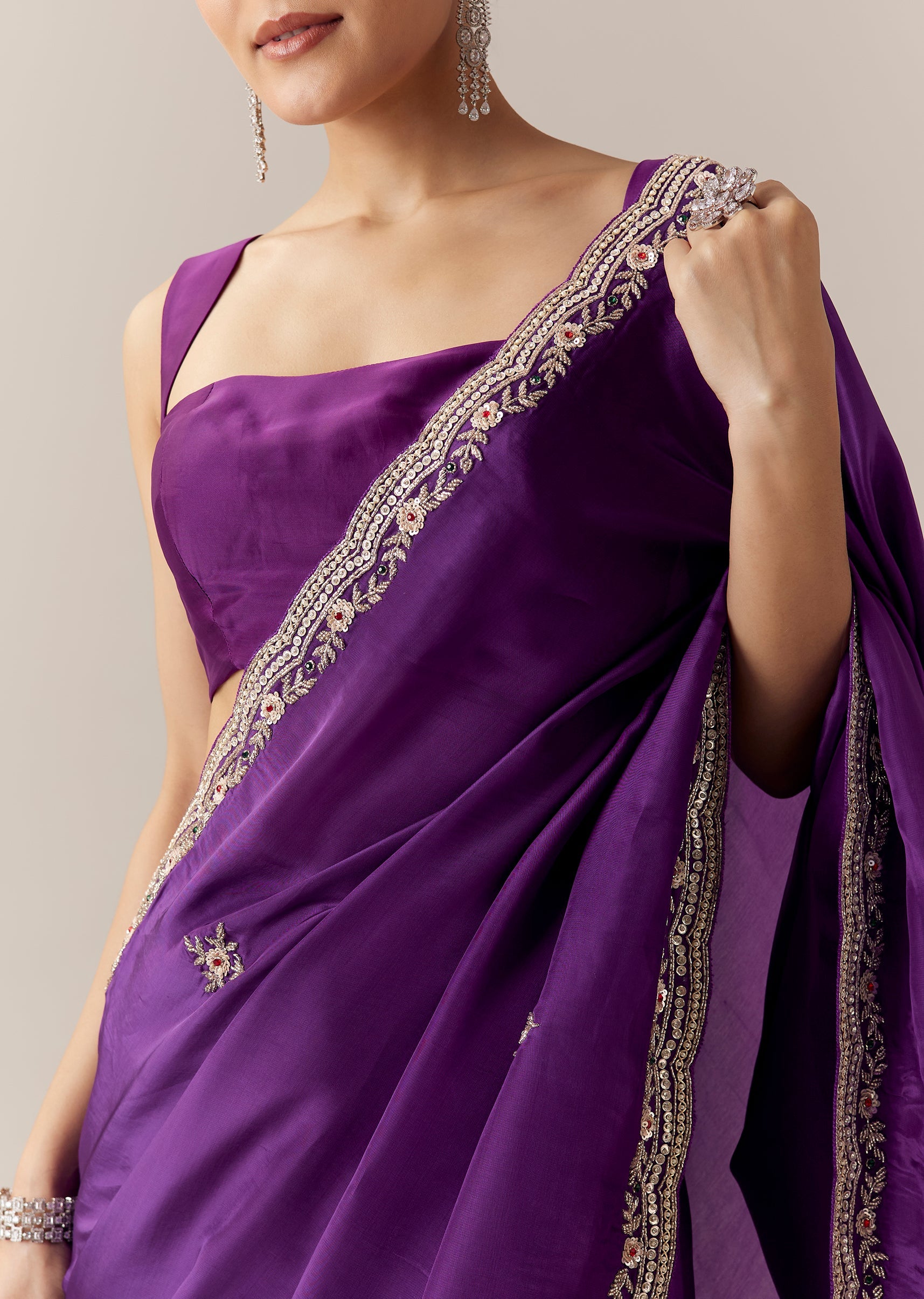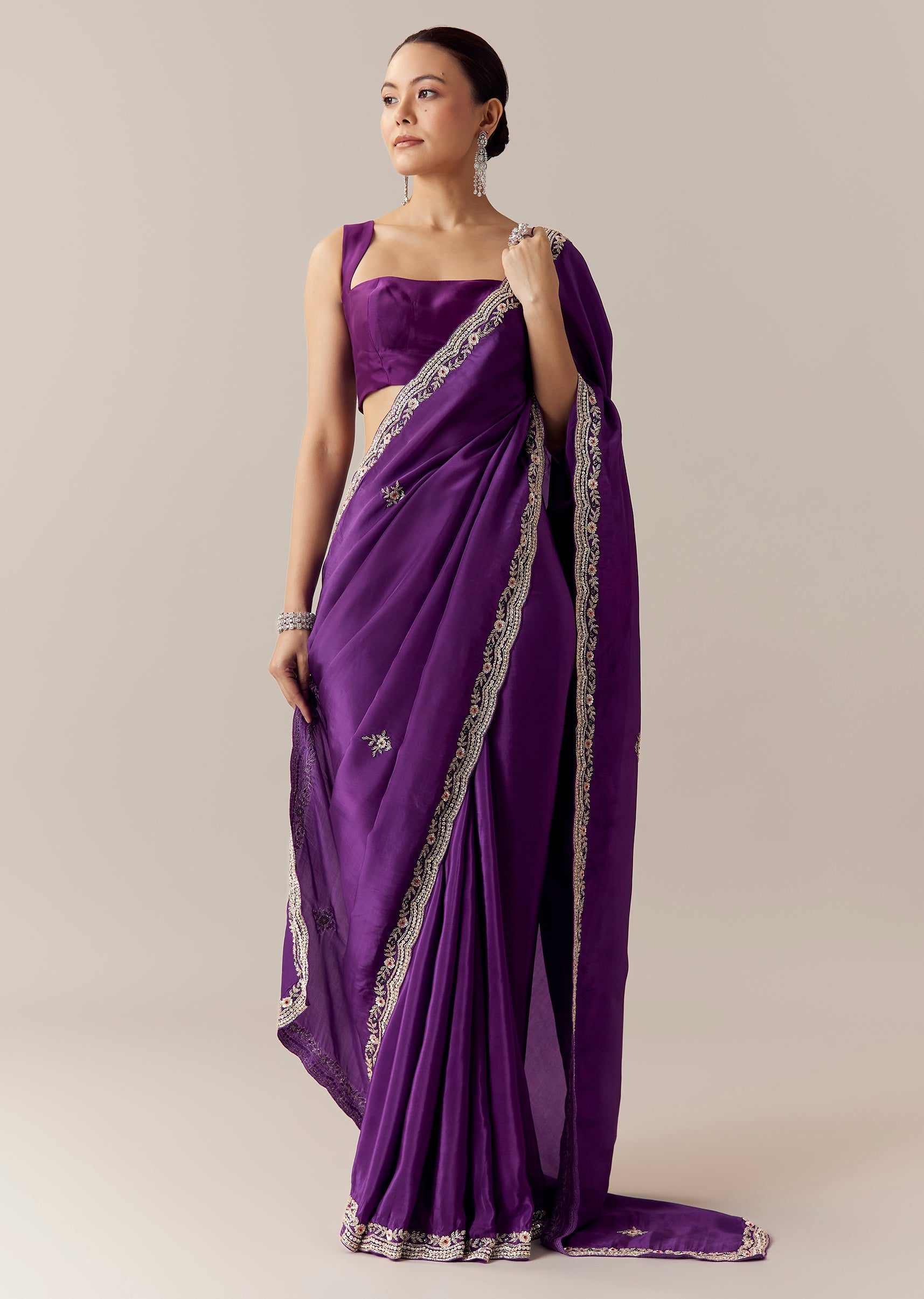 Fit Tips:Drape the pleats neatly for a fluid fall and opt for a well tailored blouse to complement the saree’s detailed embroidery and scalloped border.